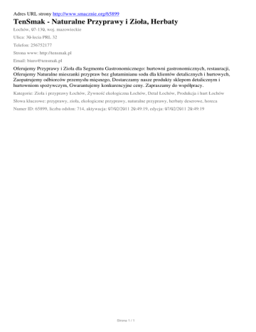 Adres URL strony http://www.smacznie.org/65899 TenSmak - Naturalne Przyprawy i Zioła, Herbaty Łochów, 07-130, woj. mazowieckie Ulica: 30-lecia PRL 32 Telefon: 256752177 Strona www: http://tensmak.pl Email: [email protected] Oferujemy Przyprawy i Zioła dla Segmentu Gastronomicznego: hurtowni gastronomicznych, restauracji, Oferujemy Naturalne mieszanki przypraw bez glutaminianu sodu dla klientów detalicznych i hurtowych, Zaopatrujemy odbiorców przemysłu mięsnego, Dostarczamy nasze produkty sklepom detalicznym i hurtowniom spożywczym, Gwarantujemy konkurencyjne ceny. Zapraszamy do współpracy. Kategorie: Zioła i przyprawy Łochów, Żywność ekologiczna Łochów, Detal Łochów, Produkcja i hurt Łochów Słowa kluczowe: przyprawy, zioła, ekologiczne przyprawy, naturalne przyprawy, herbaty deserowe, horeca Numer ID: 65899, liczba odsłon: 714, aktywacja: 07/02/2011 20:49:19, edycja: 07/02/2011 20:49:19 Strona 1 / 1