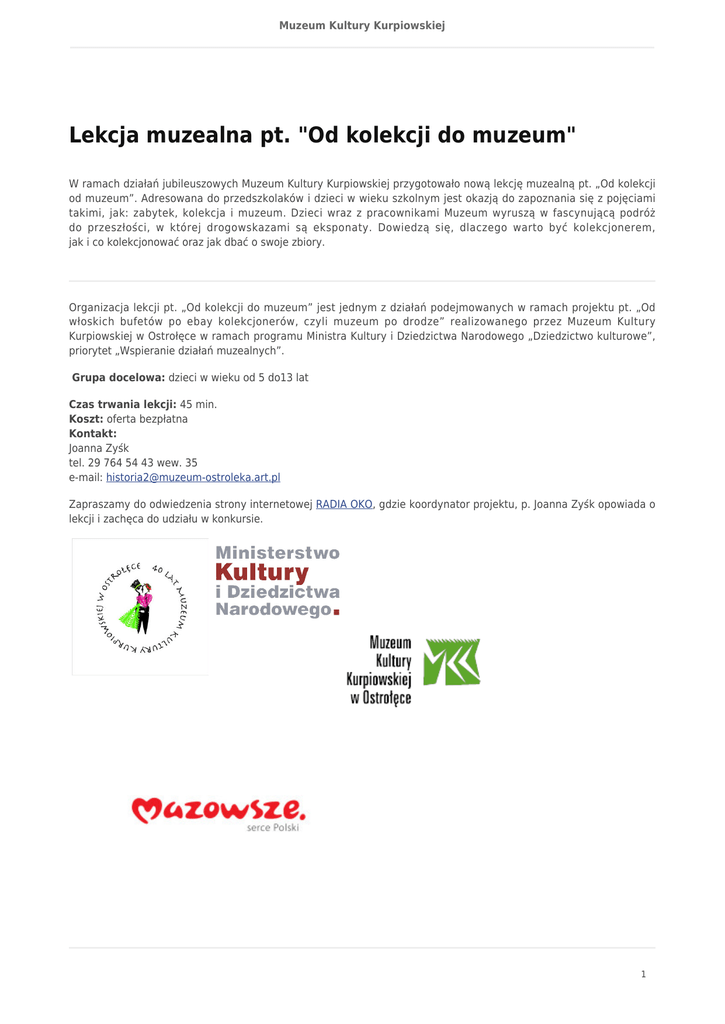 Muzeum Kultury Kurpiowskiej Lekcja muzealna pt. "Od kolekcji do muzeum" W ramach działań jubileuszowych Muzeum Kultury Kurpiowskiej przygotowało nową lekcję muzealną pt. „Od kolekcji od muzeum”. Adresowana do przedszkolaków i dzieci w wieku szkolnym jest okazją do zapoznania się z pojęciami takimi, jak: zabytek, kolekcja i muzeum. Dzieci wraz z pracownikami Muzeum wyruszą w fascynującą podróż do przeszłości, w której drogowskazami są eksponaty. Dowiedzą się, dlaczego warto być kolekcjonerem, jak i co kolekcjonować oraz jak dbać o swoje zbiory. Organizacja lekcji pt. „Od kolekcji do muzeum” jest jednym z działań podejmowanych w ramach projektu pt. „Od włoskich bufetów po ebay kolekcjonerów, czyli muzeum po drodze” realizowanego przez Muzeum Kultury Kurpiowskiej w Ostrołęce w ramach programu Ministra Kultury i Dziedzictwa Narodowego „Dziedzictwo kulturowe”, priorytet „Wspieranie działań muzealnych”. Grupa docelowa: dzieci w wieku od 5 do13 lat Czas trwania lekcji: 45 min. Koszt: oferta bezpłatna Kontakt: Joanna Zyśk tel. 29 764 54 43 wew. 35 e-mail: [email protected] Zapraszamy do odwiedzenia strony internetowej RADIA OKO, gdzie koordynator projektu, p. Joanna Zyśk opowiada o lekcji i zachęca do udziału w konkursie. 1