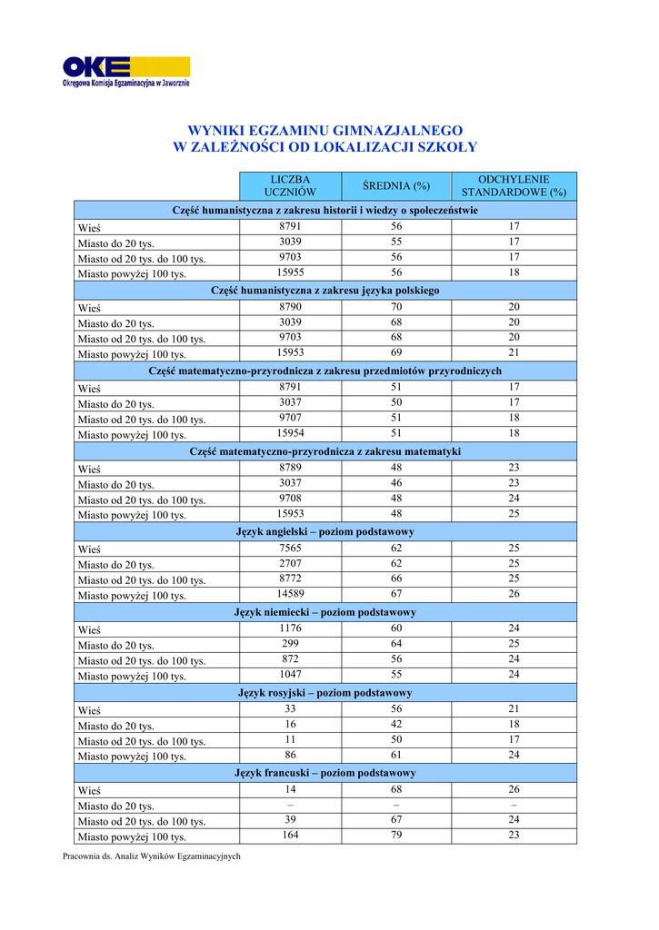 WYNIKI EGZAMINU GIMNAZJALNEGO W ZALEŻNOŚCI OD LOKALIZACJI SZKOŁY LICZBA UCZNIÓW ŚREDNIA (%) ODCHYLENIE STANDARDOWE (%) Część humanistyczna z zakresu historii i wiedzy o społeczeństwie 8791 56 Wieś 3039 55 Miasto do 20 tys. 9703 56 Miasto od 20 tys. do 100 tys. 15955 56 Miasto powyżej 100 tys. Część humanistyczna z zakresu języka polskiego 8790 70 Wieś 3039 68 Miasto do 20 tys. 9703 68 Miasto od 20 tys. do 100 tys. 15953 69 Miasto powyżej 100 tys. Część matematyczno-przyrodnicza z zakresu przedmiotów przyrodniczych 8791 51 Wieś 3037 50 Miasto do 20 tys. 9707 51 Miasto od 20 tys. do 100 tys. 15954 51 Miasto powyżej 100 tys. Część matematyczno-przyrodnicza z zakresu matematyki 8789 48 Wieś 3037 46 Miasto do 20 tys. 9708 48 Miasto od 20 tys. do 100 tys. 15953 48 Miasto powyżej 100 tys. 17 17 17 18 20 20 20 21 17 17 18 18 23 23 24 25 Wieś Miasto do 20 tys. Miasto od 20 tys. do 100 tys. Miasto powyżej 100 tys. Język angielski – poziom podstawowy 7565 62 2707 62 8772 66 14589 67 25 25 25 26 Wieś Miasto do 20 tys. Miasto od 20 tys. do 100 tys. Miasto powyżej 100 tys. Język niemiecki – poziom podstawowy 1176 60 299 64 872 56 1047 55 24 25 24 24 Wieś Miasto do 20 tys. Miasto od 20 tys. do 100 tys. Miasto powyżej 100 tys. Język rosyjski – poziom podstawowy 33 56 16 42 11 50 86 61 21 18 17 24 Wieś Miasto do 20 tys. Miasto od 20 tys. do 100 tys. Miasto powyżej 100 tys. Język francuski – poziom podstawowy 14 68 – – 39 67 164 79 26 – 24 23 Pracownia ds. Analiz Wyników Egzaminacyjnych Okręgowa Komisja Egzaminacyjna w Jaworznie LICZBA UCZNIÓW ŚREDNIA (%) ODCHYLENIE STANDARDOWE (%) Wieś Miasto do 20 tys. Miasto od 20 tys. do 100 tys. Miasto powyżej 100 tys. Język hiszpański – poziom podstawowy – – 7 60 6 44 48 81 – 20 16 16 Wieś Miasto do 20 tys. Miasto od 20 tys. do 100 tys. Miasto powyżej 100 tys. Język włoski – poziom podstawowy – – 8 67 12 65 17 58 – 18 26 23 Wieś Miasto do 20 tys. Miasto od 20 tys. do 100 tys. Miasto powyżej 100 tys. Język angielski – poziom rozszerzony 7477 42 2647 41 8739 47 14448 47 27 28 30 31 Wieś Miasto do 20 tys. Miasto od 20 tys. do 100 tys. Miasto powyżej 100 tys. Język niemiecki – poziom rozszerzony 230 55 67 54 97 72 118 60 29 33 27 33 Wieś Miasto do 20 tys. Miasto od 20 tys. do 100 tys. Miasto powyżej 100 tys. Język rosyjski – poziom rozszerzony 12 38 – – – – 15 89 20 – – 25 Wieś Miasto do 20 tys. Miasto od 20 tys. do 100 tys. Miasto powyżej 100 tys. Język francuski – poziom rozszerzony – – – – 3 100 77 88 – – 0 17 Wieś Miasto do 20 tys. Miasto od 20 tys. do 100 tys. Miasto powyżej 100 tys. Język hiszpański – poziom rozszerzony – – – – – – 27 65 – – – 17 Wieś Miasto do 20 tys. Miasto od 20 tys. do 100 tys. Miasto powyżej 100 tys. Język włoski – poziom rozszerzony – – – – – – 1 – – – – – Pracownia ds. Analiz Wyników Egzaminacyjnych