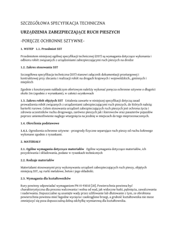 SZCZEGÓŁOWA SPECYFIKACJA TECHNICZNA URZĄDZENIA ZABEZPIECZAJĄCE RUCH PIESZYCH -PORĘCZE OCHRONNE SZTYWNE1. WSTEP 1.1. Przedmiot SST Przedmiotem niniejszej ogólnej specyfikacji technicznej (OST) sa ̨ wymagania dotycza ̨ce wykonania i odbioru robót zwia ̨zanych z urza ̨dzeniami zabezpieczaja ̨cymi ruch pieszych na drodze 1.2. Zakres stosowania SST Szczegółowa specyfikacja techniczna (SST) stanowi zała ̨cznik dokumentacji przetargowej i kontraktowej przy zlecaniu i realizacji robót na drogach krajowych i wojewódzkich., gminnych i miejskich Zgodnie z kosztorysem nakładczym ofertowym naleSży wykonać porec̨ za ochronne sztywne o długości około 2m (zgodnie z wyrunkami), w całości ocynkowach 1.3. Zakres robót objet̨ ych SST Ustalenia zawarte w niniejszej specyfikacji dotycza ̨ zasad prowadzenia robót zwia ̨zanych z urza ̨dzeniami zabezpieczaja ̨cymi ruch pieszych, do których należa ̨: barierki rurowe. Celem stosowania urza ̨dzeń zabezpieczaja ̨cych ruch pieszych jest ochrona życia i zdrowia uczestników ruchu drogowego, zarówno pieszych jak i kierowców oraz pasażerów pojazdów poprzez uniemożliwienie nagłego wtargniec̨ ia na jezdnie ̨ w miejscach do tego nieprzeznaczonych. 1.4. Określenia podstawowe 1.4.1. Ogrodzenia ochronne sztywne - przegrody fizyczne separuja ̨ce ruch pieszy od ruchu kołowego wykonane zgodnie z ryzunkami. 2. MATERIAŁY 2.1. Ogólne wymagania dotycza ̨ce materiałów Ogólne wymagania dotycza ̨ce materiałów, ich pozyskiwania i składowania, podano w rysunkach technicznych 2.2. Rodzaje materiałów Materiałami stosowanymi przy wykonywaniu urza ̨dzeń zabezpieczaja ̨cych ruch pieszy, obje ̨tych niniejsza ̨ SST, sa ̨: rurki metalowe, beton i jego składniki. 2.3. Wymagania dla kształtowników Rury powinny odpowiadać wymaganiom PN-H-93010 [20]. Powierzchnia powinna być charakterystyczna dla procesu walcowania i wolna od wad, jak widoczne łuski, pek̨ niec̨ ia, zawalcowania i naderwania. Dopuszczalne sa ̨ usunie ̨te wady przez szlifowanie lub dłutowanie z tym, ze obrobiona powierzchnia powinna mieć łagodne wyciec̨ ia i zaokra ̨glone brzegi, a grubość kształtownika nie moze zmniejszyć sie ̨ poza dopuszczalna ̨ dolna ̨ odchyłke ̨ wymiarowa ̨ dla kształtownika. Kształtowniki moga ̨ być dostarczone luzem lub w wia ̨zkach z tym, ze kształtowniki o masie do 25 kg/m dostarcza sie ̨ tylko w wia ̨zkach. Wymagania dla elementów poła ̨czeniowych do mocowania elementów barier Wszystkie drobne ocynkowane metalowe elementy połac̨ zeniowe przewidziane do mocowania mied̨ zy soba ̨ barier i płotków jak: śruby, wkret̨ y, nakret̨ ki itp. powinny być czyste, gładkie, bez pek̨ nieć̨ , naderwań, rozwarstwień i wypukłych karbów. Dostawa moze być dostarczona w pudełkach tekturowych, pojemnikach blaszanych lub paletach w zalezności od wielkości i masy wyrobów. Śruby, wkre ̨ty, nakre ̨tki itp. powinny być przechowywane w pomieszczeniach suchych, z dala od materiałów działaja ̨cych koroduja ̨co i w warunkach zabezpieczaja ̨cych przed uszkodzeniem. 3. SPRZET̨ 3.1. Sprze ̨t do wykonania urza ̨dzeń zabezpieczaja ̨cych ruch pieszych Wykonawca przyste ̨puja ̨cy do wykonania urza ̨dzeń zabezpieczaja ̨cych ruch pieszych powinien wykazać sie ̨ mozliwościa ̨ korzystania z nastep̨ uja ̨cego sprzet̨ u: − szpadli, dra ̨gów stalowych, wycia ̨garek do napinania linek i siatek, młotków, kluczy do montażu elementów panelowych itp. − środków transportu materiałów, żurawi samochodowych o udźwigu do 4 t, − ewentualnych wiertnic do wykonania dołów pod słupki w gruncie zwiez̨ łym (lecz nie w terenach uzbrojonych w centrach miast), − sprzet̨ u spawalniczego itp. 4. TRANSPORT 4.1. Transport materiałów Kształtowniki można przewozić dowolnym środkiem transportu luzem lub w wia ̨zkach. W przypadku ładowania na środek transportu wiec̨ ej niż jednej partii wyrobów należy je zabezpieczyć przed pomieszaniem. Śruby, wkret̨ y, nakret̨ ki itp. powinno sie ̨ przewozić w warunkach zabezpieczaja ̨cych wyroby przed korozja ̨ i uszkodzeniami mechanicznymi. W przypadku stosowania do transportu palet, opakowania powinny być zabezpieczone przed przemieszczaniem sie ̨ np. za pomoca ̨ taśmy stalowej lub folii termokurczliwej. Druty i pręty spawalnicze należy przewozić w warunkach zabezpieczaja ̨cych przed korozja ̨, zanieczyszczeniem i uszkodzeniem. 5. WYKONANIE ROBÓT 5.1. Zasady wykonania urza ̨dzeń zabezpieczaja ̨cych ruch pieszych W zależności od wielkości robót Wykonawca przedstawi do akceptacji Inżyniera zakres robót wykonywanych bezpośrednio na placu budowy oraz robót przygotowawczych na zapleczu. Przed wykonywaniem robót należy wytyczyć lokalizacje ̨ barier, płotków i innych urza ̨dzeń liniowych zabezpieczaja ̨cych ruch pieszych na podstawie dokumentacji projektowej, SST lub zaleceń Inżyniera. Do podstawowych czynności obje ̨tych niniejsza ̨ SST przy wykonywaniu ww. robót należą: − wykonanie dołów pod słupki, − wykonanie fundamentów betonowych pod słupki, − ustawienie słupków, − zamontowanie elementów w ramach z kształtowników, 5.2. Wykonanie dołów pod słupki Jeśli dokumentacja projektowa lub SST nie podaje inaczej, to doły pod słupki powinny mieć wymiary w planie co najmniej o 20 cm wiek̨ sze od wymiarów słupka, a głeb̨ okość od 0,8 do 1,2 m. 5.3. Ustawienie słupków wraz z wykonaniem fundamentów betonowych pod słupki Jeśli dokumentacja projektowa lub SST nie podaje inaczej, to słupki moga ̨ być osadzone w betonie ułoŜonym w dołku albo oprawione w bloczki betonowe formowane na zapleczu i dostarczane do miejsca budowy urza ̨dzenia zabezpieczaja ̨cego ruch pieszych. Po uzyskaniu akceptacji InŜyniera, słupki betonowe moga ̨ być obłozone kamieniami lub gruzem i przysypane ziemia ̨. Słupek nalezy wstawić w gotowy wykop i napełnić otwór mieszanka ̨ betonowa ̨ odpowi