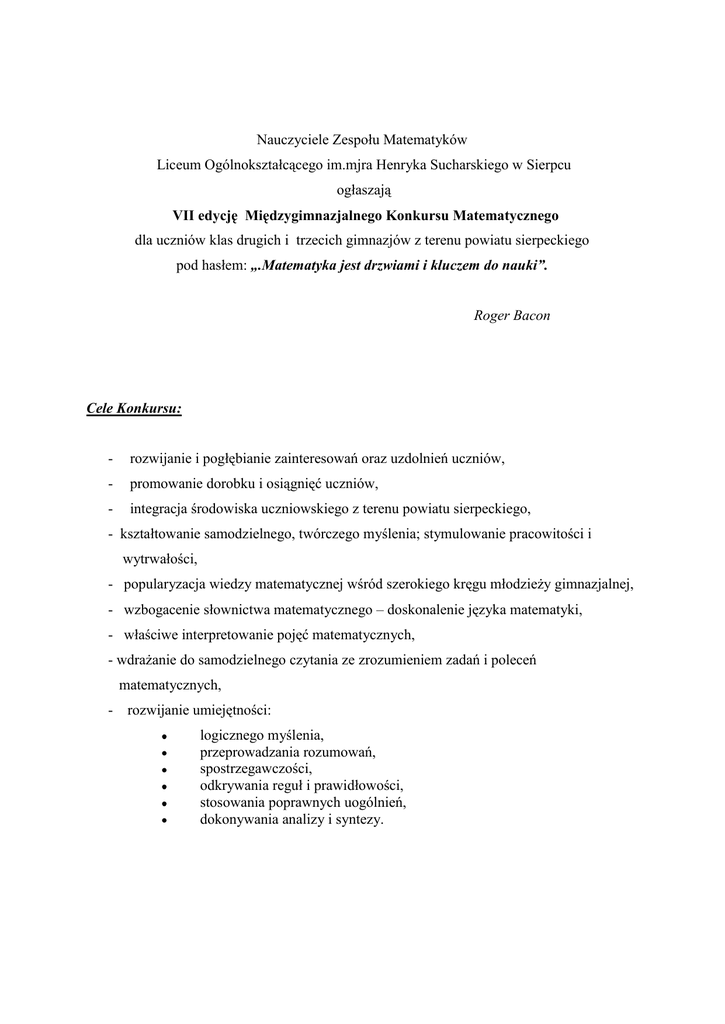 Nauczyciele Zespołu Matematyków Liceum Ogólnokształcącego im.mjra Henryka Sucharskiego w Sierpcu ogłaszają VII edycję Międzygimnazjalnego Konkursu Matematycznego dla uczniów klas drugich i trzecich gimnazjów z terenu powiatu sierpeckiego pod hasłem: „.Matematyka jest drzwiami i kluczem do nauki”. Roger Bacon Cele Konkursu: - rozwijanie i pogłębianie zainteresowań oraz uzdolnień uczniów, - promowanie dorobku i osiągnięć uczniów, - integracja środowiska uczniowskiego z terenu powiatu sierpeckiego, - kształtowanie samodzielnego, twórczego myślenia; stymulowanie pracowitości i wytrwałości, - popularyzacja wiedzy matematycznej wśród szerokiego kręgu młodzieży gimnazjalnej, - wzbogacenie słownictwa matematycznego – doskonalenie języka matematyki, - właściwe interpretowanie pojęć matematycznych, - wdrażanie do samodzielnego czytania ze zrozumieniem zadań i poleceń matematycznych, - rozwijanie umiejętności: logicznego myślenia, przeprowadzania rozumowań, spostrzegawczości, odkrywania reguł i prawidłowości, stosowania poprawnych uogólnień, dokonywania analizy i syntezy. Regulamin Konkursu: 1. Organizatorem Konkursu są nauczyciele Zespołu Matematyków Liceum Ogólnokształcącego im. mjra Henryka Sucharskiego w Sierpcu. 2. Konkurs przeznaczony jest dla uczniów klas drugich i trzecich gimnazjum. 3. Konkurs składa się z dwóch etapów: a) pierwszy etap – szkolny odbywa się w terminie do dnia 23 lutego 2015r. w macierzystym gimnazjum i jest przeprowadzany przez nauczyciela/-i matematyki tej szkoły, b) zadania na eliminacje szkolne przygotowują nauczyciele Liceum Ogólnokształcącego im. mjra Henryka Sucharskiego w Sierpcu, c) każdy uczestnik konkursu startuje indywidualnie, d) zadania na eliminacje szkolne gimnazja otrzymują wraz z regulaminem konkursu, e) po przeprowadzonych eliminacjach szkolnych nauczyciel odpowiedzialny za ich przebieg przesyła listę maksymalnie 5 finalistów drogą elektroniczną na adres [email protected] w terminie do 5 marca 2015 r. f) drugi etap – powiatowy (finał konkursu) odbędzie się 13 marca 2015r. (piątek) w godzinach 8.30 – 12.00 w Liceum Ogólnokształcącym im. mjra Henryka Sucharskiego w Sierpcu, g) w konkursie finałowym bierze udział maksymalnie po 5 najlepszych uczniów z etapu szkolnego każdego gimnazjum. 4. Zakres materiału obejmuje zadania o różnym stopniu trudności związane z programem nauczania matematyki w gimnazjum. 5. Uszczegółowiony zakres materiału stanowi Załącznik Nr 1 do niniejszego Regulaminu. 6. Udział w konkursie należy zgłosić w nieprzekraczalnym terminie do dnia 13 lutego 2015 r. na Karcie Zgłoszenia (Załącznik Nr 2 do Regulaminu) przesłanej pocztą lub pocztą elektroniczną na adres [email protected] ewentualnie telefonicznie – numer (24) 275 22 01 . 7. Konkurs finałowy będzie złożony z kilku (6 - 7) zadań zamkniętych i kilku (4 - 5) zadań otwartych. 8. O kolejności indywidualnej decyduje ilość punktów zdobytych w II etapie konkursu. 9. Każdy uczestnik konkursu zadania rozwiązuje samodzielnie. 10. Każdy uczestnik posiada przybory szkolne i przyrządy do geometrii. W czasie konkursu nie wolno korzystać z kalkulatorów i korektorów. 11. Uczestnicy etapu finałowego powinni zabrać ze sobą legitymacje szkolne. 12. Nad prawidłowością przebiegu konkursu finałowego będzie czuwało jury. W jego składzie znajdzie się po jednym nauczycielu matematyki z każdego gimnazjum reprezentowanego w konkursie. Przewodniczącym jury będzie nauczyciel matematyki Liceum Ogólnokształcącego im. mjra Henryka Sucharskiego w Sierpcu. 13. Prace konkursowe zostaną sprawdzone i ocenione przez nauczycieli matematyki Liceum Ogólnokształcącego im. mjra Henryka Sucharskiego w Sierpcu. 14. Oficjalne ogłoszenie wyników nastąpi w Dniu Otwartym w Liceum Ogólnokształcącym w Sierpcu. 15. Dla laureatów konkursu powiatowego (I, II i III miejsce) przewiduje się nagrody. Pozostali uczestnicy konkursu otrzymają dyplomy. 16. Adres organizatora: Liceum Ogólnokształcące im. mjra Henryka Sucharskiego w Sierpcu ul. H. Sucharskiego 2 09-200 Sierpc tel. (24) 275 2201 z dopiskiem „ Międzygimnazjalny Konkurs Matematyczny”. opracowała: Beata Zdrojewska nauczyciel matematyki Liceum Ogólnokształcącego im. mjra Henryka Sucharskiego w Sierpcu SERDECZNIE ZAPRASZAMY