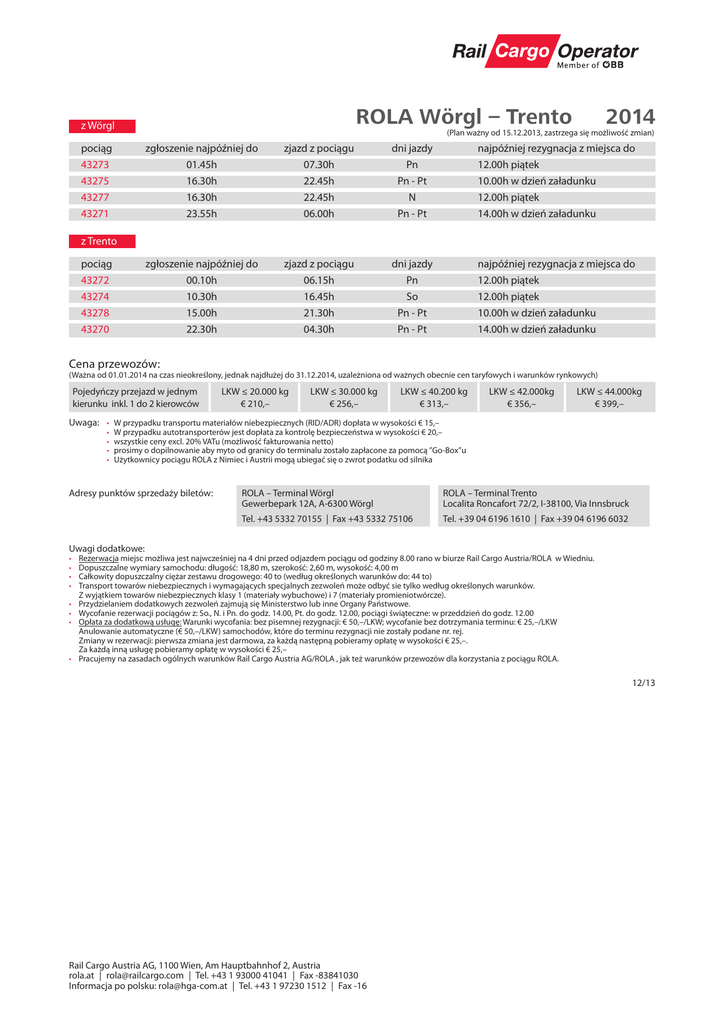 ROLA Wörgl – Trento z Wörgl pociąg 43273 43275 43277 43271 2014 (Plan ważny od 15.12.2013, zastrzega się możliwość zmian) zgłoszenie najpóźniej do 01.45h 16.30h 16.30h 23.55h zjazd z pociągu 07.30h 22.45h 22.45h 06.00h dni jazdy Pn Pn - Pt N Pn - Pt najpóźniej rezygnacja z miejsca do 12.00h piątek 10.00h w dzień załadunku 12.00h piątek 14.00h w dzień załadunku zgłoszenie najpóźniej do 00.10h 10.30h 15.00h 22.30h zjazd z pociągu 06.15h 16.45h 21.30h 04.30h dni jazdy Pn So Pn - Pt Pn - Pt najpóźniej rezygnacja z miejsca do 12.00h piątek 12.00h piątek 10.00h w dzień załadunku 14.00h w dzień załadunku z Trento pociąg 43272 43274 43278 43270 Cena przewozów: (Ważna od 01.01.2014 na czas nieokreślony, jednak najdłużej do 31.12.2014, uzależniona od ważnych obecnie cen taryfowych i warunków rynkowych) Pojedyńczy przejazd w jednym kierunku inkl. 1 do 2 kierowców LKW ≤ 20.000 kg € 210,– LKW ≤ 30.000 kg € 256,– LKW ≤ 40.200 kg € 313,– LKW ≤ 42.000kg € 356,– LKW ≤ 44.000kg € 399,– Uwaga: • W przypadku transportu materiałów niebezpiecznych (RID/ADR) dopłata w wysokości € 15,– • • • • W przypadku autotransporterów jest dopłata za kontrolę bezpieczeństwa w wysokości € 20,– wszystkie ceny excl. 20% VATu (możliwość fakturowania netto) prosimy o dopilnowanie aby myto od granicy do terminalu zostało zapłacone za pomocą ”Go-Box”u Użytkownicy pociągu ROLA z Nimiec i Austrii mogą ubiegać się o zwrot podatku od silnika Adresy punktów sprzedaży biletów: ROLA – Terminal Wörgl Gewerbepark 12A, A-6300 Wörgl ROLA – Terminal Trento Localita Roncafort 72/2, I-38100, Via Innsbruck Tel. +43 5332 70155 | Fax +43 5332 75106 Tel. +39 04 6196 1610 | Fax +39 04 6196 6032 Uwagi dodatkowe: • • • • • • • • Rezerwacja miejsc możliwa jest najwcześniej na 4 dni przed odjazdem pociągu od godziny 8.00 rano w biurze Rail Cargo Austria/ROLA w Wiedniu. Dopuszczalne wymiary samochodu: długość: 18,80 m, szerokość: 2,60 m, wysokość: 4,00 m Całkowity dopuszczalny ciężar zestawu drogowego: 40 to (według określonych warunków do: 44 to) Transport towarów niebezpiecznych i wymagających specjalnych zezwoleń może odbyć sie tylko według określonych warunków. Z wyjątkiem towarów niebezpiecznych klasy 1 (materiały wybuchowe) i 7 (materiały promieniotwórcze). Przydzielaniem dodatkowych zezwoleń zajmują się Ministerstwo lub inne Organy Państwowe. Wycofanie rezerwacji pociągów z: So., N. i Pn. do godz. 14.00, Pt. do godz. 12.00, pociągi świąteczne: w przeddzień do godz. 12.00 Opłata za dodatkową usługę: Warunki wycofania: bez pisemnej rezygnacji: € 50,–/LKW; wycofanie bez dotrzymania terminu: € 25,–/LKW Anulowanie automatyczne (€ 50,–/LKW) samochodów, które do terminu rezygnacji nie zostały podane nr. rej. Zmiany w rezerwacji: pierwsza zmiana jest darmowa, za każdą następną pobieramy opłatę w wysokości € 25,–. Za każdą inną usługę pobieramy opłatę w wysokości € 25,– Pracujemy na zasadach ogólnych warunków Rail Cargo Austria AG/ROLA , jak też warunków przewozów dla korzystania z pociągu ROLA. 12/13 Rail Cargo Austria AG, 1100 Wien, Am Hauptbahnhof 2, Austria rola.at | [email protected] | Tel. +43 1 93000 41041 | Fax -83841030 Informacja po polsku: [email protected] | Tel. +43 1 97230 1512 | Fax -16