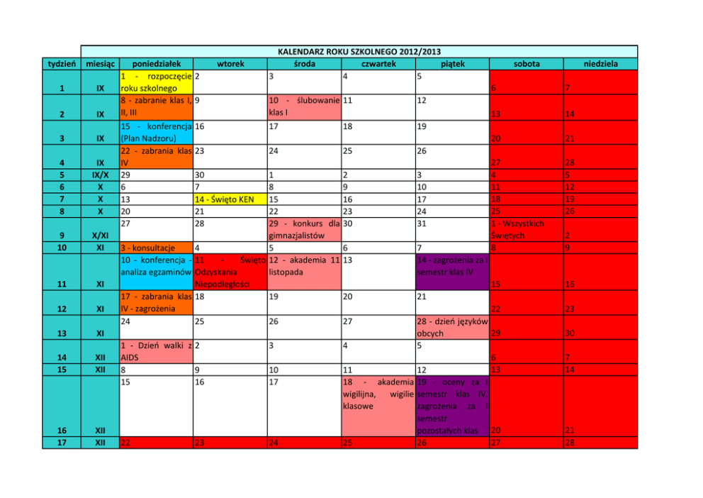 tydzień miesiąc 1 IX 2 3 IX IX 4 5 6 7 8 IX IX/X X X X 9 10 X/XI XI 11 XI 12 XI 13 XI 14 15 XII XII 16 17 XII XII poniedziałek 1 - rozpoczęcie 2 roku szkolnego 8 - zabranie klas I, 9 II, III 15 - konferencja (Plan Nadzoru) 22 - zabrania klas IV 29 6 13 20 27 wtorek KALENDARZ ROKU SZKOLNEGO 2012/2013 środa czwartek piątek 3 4 5 13 14 20 21 27 4 11 18 25 1 - Wszystkich Świętych 8 28 5 12 19 26 15 16 22 28 - dzień języków 29 obcych 4 5 6 13 11 12 18 - akademia 19 - oceny za I wigilijna, wigilie semestr klas IV, klasowe zagrożenia za I semestr pozostałych klas 20 27 25 26 23 16 17 18 19 23 24 25 26 1 - Dzień walki z 2 AIDS 8 9 15 16 22 7 12 1 8 15 22 29 - konkurs dla gimnazjalistów 3 - konsultacje 4 5 10 - konferencja - 11 Święto 12 - akademia 11 analiza egzaminów Odzyskania listopada Niepodległości 17 - zabrania klas 18 19 IV - zagrożenia 24 25 26 23 3 10 17 24 niedziela 6 10 - ślubowanie 11 klas I 30 7 14 - Święto KEN 21 28 sobota 2 9 16 23 30 6 13 20 3 10 17 24 31 7 14 - zagrożenia za I semestr klas IV 2 9 21 27 30 7 14 21 28 18 XII/I 19 I 20 21 29 30 5 - konferencja 6 - Trzech Króli klasyfikacyjna za I semestr klas IV zebrania - klasy IV podsumowanie, pozostałe klasy zagrożenia 31 7 1 8 12 13 14 15 19 20 21 22 28 - zebrania pozostałych klas podsumowanie I semestru 4 11 18 29 I I 26 - konferencja 27 klasyfikacyjna za I semestr 22 23 24 I/II II II 25 26 27 II II/III III 28 III 29 III 2 9 16 - konferencja podsumowująca I semestr 23 2 9 16 3 10 17 24 3 10 17 23 - zebranie klas 24 IV - zagrożenia, 30 III 25 4 11 18 5 12 19 26 5 12 19 25 święto 26 patrona, dzień języka polskiego 2 9 3 4 10 16 dzień przedmiotów 17 ścisłych 23 - oceny za I semestr pozostałych klas 24 30 11 31 7 14 1 8 15 21 28 7 22 1 8 6 13 20 27 6 13 - dzień otwarty 14 szkoły 20 - zagrożenia 21 klas IV 27 28 18 25 15 22 29 30 31 32 III/IV IV 33 IV 34 IV 35 36 37 IV/V V V 38 V 6 13 - konsultacje V 40 41 VI VI 42 VI 43 VI 7 14 20 - konferencja 21 klasyfikacyjna klas IV, procedury egzaminów, raport z ewaluacji 1 oceny 2 3 przewidywane klas 4 IV 11 8 9 10 15 16 dzień 17 - oceny klas IV przedmiotów zawodowych 18 22 23 24 - zakończenie klas IV 5 12 19 25 26 2 9 16 3 - święto 3 Maja 10 17 23 24 30 5 oceny przewidywane pozostałych klas 6 13 8 9 10 11 12 15 - egzamin 16 - egzamin 17 - egzamin 18 19 - oceny zawodowy zawodowy zawodowy pozostałych klas 20 22 - konferencja 23 - egzamin 24 - egzamin 25 - egzamin 26 - zakończenie klasyfikacyjna II zawodowy (nowy) zawodowy (nowy) zawodowy (nowy) roku szkolnego semestr 31 27 28 27 39 31 4 - matura 11 18 28 5 - matura 12 19 29 6 - matura 13 20 25 - zebrania 26 pozostałych klas zagrozenia 27 1 3 2 30 - akademia 3 1 - Święto Pracy maja 7 8 14 15 21 22 - zagrożenia pozostałych klas 28 29 - dzień dziecka, dzień sportu 4 - Boże Ciało 7 14 21 23 - egzamin 24 - egzamin 25 - egzamin zawodowy (nowy) zawodowy (nowy) zawodowy (nowy) VI VI/VII 22 - egzamin zawodowy pisemny (nowy) 29 30 36 1 34 26 - konferencja podsumowująca 27 rok szkolny 4 3 2 37 37 37 28 5