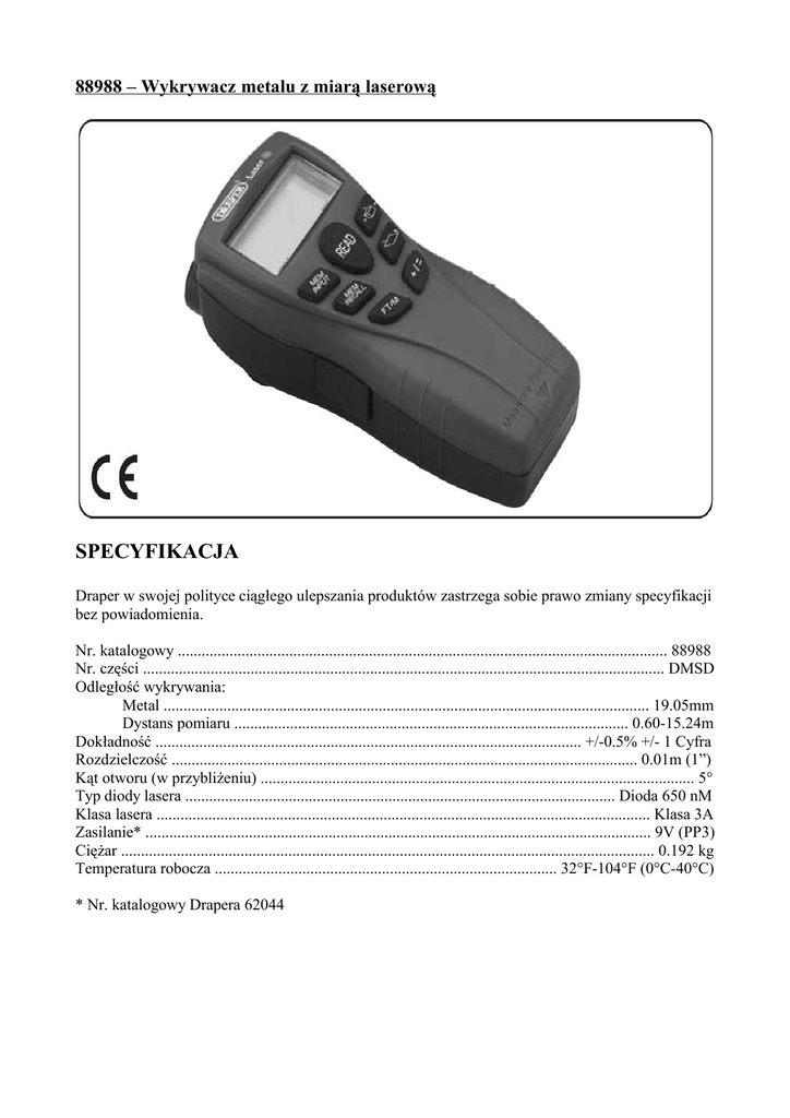 88988 – Wykrywacz metalu z miarą laserową SPECYFIKACJA Draper w swojej polityce ciągłego ulepszania produktów zastrzega sobie prawo zmiany specyfikacji bez powiadomienia. Nr. katalogowy ........................................................................................................................... 88988 Nr. części ................................................................................................................................... DMSD Odległość wykrywania: Metal .......................................................................................................................... 19.05mm Dystans pomiaru ................................................................................................... 0.60-15.24m Dokładność ........................................................................................................... +/-0.5% +/- 1 Cyfra Rozdzielczość ..................................................................................................................... 0.01m (1”) Kąt otworu (w przybliżeniu) ............................................................................................................. 5° Typ diody lasera ............................................................................................................ Dioda 650 nM Klasa lasera ............................................................................................................................ Klasa 3A Zasilanie* ............................................................................................................................... 9V (PP3) Ciężar ...................................................................................................................................... 0.192 kg Temperatura robocza ...................................................................................... 32°F-104°F (0°C-40°C) * Nr. katalogowy Drapera 62044 ZŁOŻENIE - Instalacja baterii: (Rys.1) Przy słabej baterii zapala się dioda na wyświetlaczu. Wysuń osłonę z tyłu urządzenia. Podłącz nową baterię 9V PP3* (nie dostarczana). Załóż osłonę z powrotem. * Nr. katalogowy Drapera 62044 OBSŁUGA 1. 2. 3. 4. Nigdy nie celuj laserem w ludzi lub zwierzęta, może to uszkodzić wzrok. Urządzenie jest precyzyjnym instrumentem i powinno się nim posługiwać z uwagą. Unikaj wstrząsów, wibracji i dużej temperatury. Unikaj wody i kurzu, które mogą zasłaniać soczewki. W razie konieczności, używaj miękkiej szmatki do czyszczenia soczewek. 5. Utrzymuj urządzenie laserowe w czystości i w miejscu suchym. 6. Sprawdzaj baterię regularnie, aby uniknąć pogorszenia odczytów. 7. Usuń baterię, jeśli zamierzasz nie używać urządzenia przez dłuższy czas. UŻYTKOWANIE – Wykrywacz metalu: (Rys. 2) Umieść urządzenie płasko w stosunku do ściany. Naciśnij i przytrzymaj przycisk , aby skalibrować urządzenie. Pojawi się potwierdzający sygnał dźwiękowy a na wyświetlaczu pojawi się 'Stud'. Uwaga: Jeśli przez przypadek, kalibracja jest przeprowadzana zbyt blisko lub nad metalem, wykrywacz nigdy nie wychwyci żadnych odczytów i pokaże fałszywą informację. Z tego względu zaleca się pobranie paru odczytów i kalibrację urządzenia w różnych pozycjach w celu otrzymania właściwej dokładności. Przy wykryciu metalu, kreski na wyświetlaczu zaczną się pojawiać, po wyświetleniu wszystkich dwunastu pojawi się sygnał dźwiękowy. Najlepszą metodą ustalania dokładnego pomiaru jest oznaczenie na ścianie miejsca, gdzie uzyskano sygnał dźwiękowy. Potem należy przesunąć urządzenie o w przybliżeniu 30 cm poza ten punkt. Cofnąć urządzenie w miejscu usłyszenia sygnału dźwiękowego. Zaznaczyć miejsce na ścianie, po środku drogi zaznaczonych punktów znajduje się element metalowy. Uwaga: Ściana musi mieć wewnętrzną budowę zagłębieniową, aby wykrywacz działał poprawnie. Przestrzenie wypełnione watą szklaną, mogą wpłynąć na odczyty. – Pomiar odległości: (Rys. 3) Upewnij się, czy wykrywacz jest umieszczony prostopadle do powierzchni pomiaru. Laser pokazuje, gdzie odbywa się pomiar. Powierznia pomiaru powinna być w miarę równa. Nie mogą występować przeszkody na drodze lasera. Przy dokonywaniu dokładnych pomiarów, upewnij się, aby powiechnia była wystarczająco duża (przy pomiarach powyżej 12m powierzchnia pomiaru powinna być >3m²). Przy dokonywaniu pomiarów małych powierzchni, postaraj się umieścić większą powierzchnię na tej mniejszej. Ultradźwiękowy pomiar odległości nie mierzy przez szybę, ale do niej tylko. Dokonuj pomiarów od podstawy (np. pomiar zawiera długość urządzenia). Naciśnij przycisk , aby otrzymać odczyt metryczny lub w calach. 1. PRZY WYKONYWANIU STANDARDOWYCH POMIARÓW: Naciśnij przycisk , aby dokonać pomiaru. Wynik pojawi się na wyświetlaczu, jeśli pojawi się błąd, operacje należy powtórzyć. 2. ABY DODAWAĆ WYNIKI: (bez używania pamięci) Naciśnij przycisk , aby dokonać pomiaru. Naciśnij przycisk , aby wejść w tryb dodawania. Na wyświetlaczu pojawi się znak '+'. Naciśnij przycisk ponownie, aby odebrać następny odczyt. Naciśnij przycisk , aby wyświetlić wynik. 3. ABY DODAWAĆ WYNIKI: (z użyciem pamięci) Naciśnij przycisk , aby dokonać pomiaru. Naciśnij przycisk , aby zachować obecny pomiar. Naciśnij przycisk , aby dokonać następnego pomiaru. Naciśnij przycisk , aby wejść w tryb dodawania. Na wyświetlaczu pojawi się znak '+'. Naciśnij przycisk , aby przywrócić poprzedni pomiar. Naciśnij przycisk , aby wyświetlić wynik. 4. ABY DOKONAĆ POMIARÓW POWIERZCHNI: Naciśnij przycisk , aby wejść w tryb pomiaru powierzchni. Pojawi się na wyświetlaczu symbol z literką 'L' migającą. Naciśnij przycisk , aby dokonać pomiaru długości. Jeśli pomiar się udał, literka 'W' zacznie migać. Naciśnij przycisk , aby dokonać pomiaru szerokości. Jeśli pomiar się powiódł, wynik 