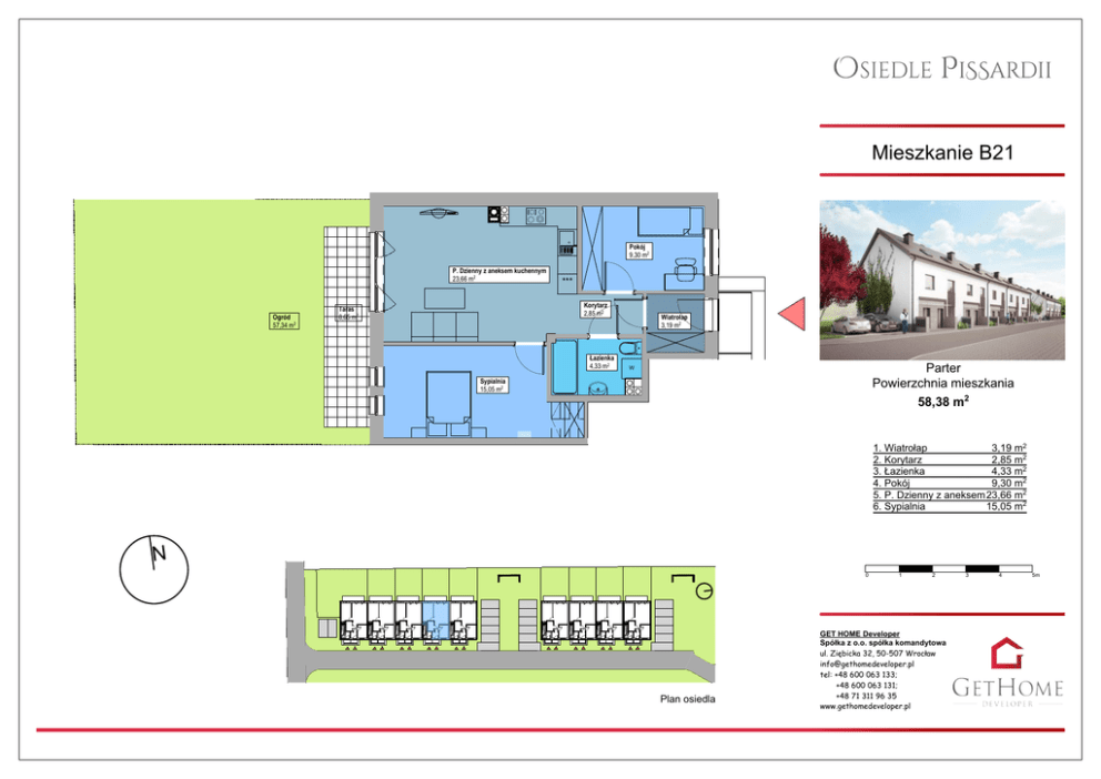 Mieszkanie B21 B21 - 58,38m2 Pokój 9,30 m2 P. Dzienny z aneksem kuchennym 23,66 m2 Ogród 57,34 m2 *** Korytarz 2,85 m2 Taras 8,65 m2 Łazienka 4,33 m2 Wiatrołap 3,19 m2 Parter Powierzchnia mieszkania 58,38 m2 W 17 x1 8 = 30 6 Sypialnia 15,05 m2 1. Wiatrołap 3,19 m2 2. Korytarz 2,85 m2 3. Łazienka 4,33 m2 4. Pokój 9,30 m2 5. P. Dzienny z aneksem 23,66 m2 6. Sypialnia 15,05 m2 N 0 Plan osiedla 1 2 GET HOME Developer Spółka z o.o. spółka komandytowa ul. Ziębicka 32, 50-507 Wrocław [email protected] tel: +48 600 063 133; +48 600 063 131; +48 71 311 96 35 www.gethomedeveloper.pl 3 4 5m