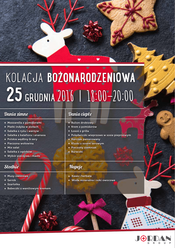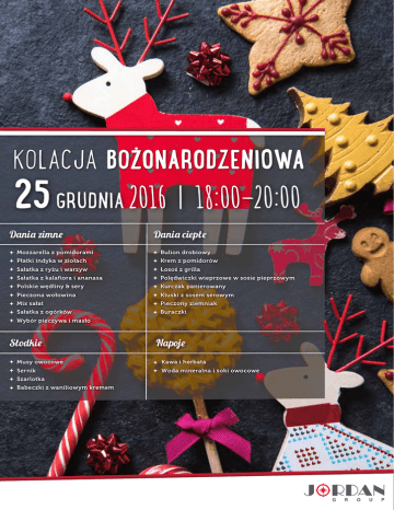 KOLACJA BOŻONARODZENIOWA 25 GRUDNIA 2016 | 18:00–20:00 Dania zimne Dania ciepłe Mozzarella z pomidorami Bulion drobiowy Płatki indyka w ziołach Krem z pomidorów Sałatka z ryżu i warzyw Łosoś z grilla Sałatka z kalafiora i ananasa Polędwiczki wieprzowe w sosie pieprzowym Polskie wędliny & sery Kurczak panierowany Pieczona wołowina Kluski z sosem serowym Mix sałat Pieczony ziemniak Sałatka z ogórków Buraczki Wybór pieczywa i masło Słodkie Napoje Musy owocowe Kawa i herbata Sernik Woda mineralna i soki owocowe Szarlotka Babeczki z waniliowym kremem