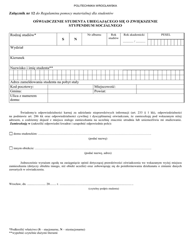 POLITECHNIKA WROCŁAWSKA Załącznik nr 12 do Regulaminu pomocy materialnej dla studentów OŚWIADCZENIE STUDENTA UBIEGAJĄCEGO SIĘ O ZWIĘKSZENIE STYPENDIUM SOCJALNEGO Rodzaj studiów* Nr albumu S N Rok studiów Rok akademicki PESEL ............. / ............ Wydział Kierunek Nazwisko i imię studenta** Adres zameldowania studenta na pobyt stały Kod pocztowy: Gmina: Ulica z numerem domu: Miejscowość: Powiat: Świadomy/a odpowiedzialności karnej za udzielanie nieprawdziwych informacji (art. 233 § 1 kk), odpowiedzialności na podstawie art. 286 kk oraz odpowiedzialności cywilnej i dyscyplinarnej oświadczam, że zamieszkuję pod wskazanym niżej adresem, a codzienny dojazd z miejsca stałego zamieszkania na uczelnię znacznie utrudnia lub uniemożliwia mi studiowanie. Zamieszkuję w (zakreślić odpowiedni kwadrat i uzupełnić odpowiednie pole): domu studenckim: ……………………………………………………………………………………………. (podać nazwę) innym obiekcie: ………………………………………………………………………………………………. (podać nazwę, adres) Jednocześnie wyrażam zgodę na zasięgnięcie opinii dotyczącej prawdziwości oświadczenia we wskazanym wyżej miejscu zamieszkania (dotyczy obiektu innego, niż obiekt uczelni) oraz zobowiązuję się do poinformowania dziekanatu o zmianie danych zawartych w oświadczeniu. Wrocław, dn. ....................... 20........ r. ............................................................................................ (czytelny podpis studenta) *Podkreślić właściwe (S – stacjonarne, N – niestacjonarne) **wypełnić czytelnie dużymi literami