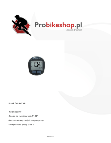 Licznik GALAXY X6: - Kolor: czarny - Pasuje do rozmiaru koła 5"-31" - Bezkontaktowy czujnik magnetyczny - Temperatura pracy 0-55 'C Strona 1 z 2 9 funkcji: - bieżąca prędkość - czas jazdy - odległość trasy - licznik km - zegarek - skanowanie - automatyczne włączanie/wyłączanie W komplecie baterie, uchwyty oraz zipy mocujące. Wszystko zapakowane w ładne, oryginalne pudełko. Strona 2 z 2