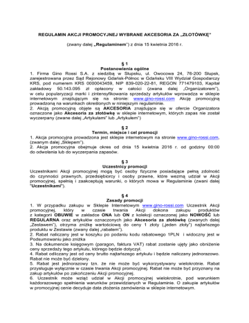 REGULAMIN AKCJI PROMOCYJNEJ WYBRANE AKCESORIA ZA „ZŁOTÓWKĘ” (zwany dalej „Regulaminem”) z dnia 15 kwietnia 2016 r. §1 Postanowienia ogólne 1. Firma Gino Rossi S.A. z siedzibą w Słupsku, ul. Owocowa 24, 76-200 Słupsk, zarejestrowana przez Sąd Rejonowy Gdańsk-Północ w Gdańsku VIII Wydział Gospodarczy KRS, pod numerem KRS 0000043459, NIP 839-020-22-81, REGON 771479103, Kapitał zakładowy 50.143.095 zł opłacony w całości (zwana dalej „Organizatorem”), w celu popularyzacji marki i zintensyfikowania sprzedaży artykułów wprowadza w sklepie internetowym znajdującym się na stronie: www.gino-rossi.com Akcję promocyjną prowadzoną na warunkach określonych w niniejszym regulaminie. 2. Akcją promocyjną objęte są AKCESORIA znajdujące się w ofercie Organizatora oznaczone jako Akcesoria za złotówkę w sklepie internetowym, których zapas nie został wyczerpany (zwane dalej „Artykułami” lub „Artykułem”) §2 Termin, miejsce i cel promocji 1. Akcja promocyjna prowadzona jest sklepie internetowym na stronie www.gino-rossi.com, (zwanym dalej „Sklepem”). 2. Akcja promocyjna obejmuje okres od dnia 15 kwietnia 2016 r. od godziny 00:00 do odwołania lub do wyczerpania zapasów. §3 Uczestnicy promocji Uczestnikami Akcji promocyjnej mogą być osoby fizyczne posiadające pełną zdolność do czynności prawnych, przedsiębiorcy i osoby prawne, które wezmą udział w Akcji promocyjnej, spełnią i zaakceptują warunki, o których mowa w Regulaminie (zwani dalej "Uczestnikami"). §4 Zasady promocji 1. W przypadku zakupu w Sklepie Internetowym www.gino-rossi.com Uczestnik Akcji promocyjnej, który w czasie trwania Akcji dokona zakupu produktów z kategorii OBUWIE w zakładce ONA lub ON z kolekcji oznaczonej jako NOWOŚĆ lub REGULARNA oraz artykułów oznaczonych jako Akcesoria za złotówkę (zwanych dalej „Zestawem”), otrzyma zniżkę wartościową do ceny 1 złoty („jeden złoty”) najtańszego produktu w Zestawie (zwany dalej „rabatem”). 2. Rabat naliczany jest w koszyku po podaniu kodu rabatowego 1PLN i widoczny jest w Podsumowaniu jako zniżka 3. Na dokumencie księgowym (paragon, faktura VAT) rabat zostanie ujęty jako obniżenie ceny sprzedaży tego artykułu, którego będzie dotyczył. 4. Rabat odliczany jest od ceny brutto najtańszego artykułu i będzie naliczany jednorazowo. Rabat nie może być dzielony. 5. Rabat jest jednorazowy tzn. że nie może być wykorzystywany wielokrotnie. Rabat przysługuje wyłącznie w czasie trwania Akcji promocyjnej. Rabat nie może być przyznany na zakup artykułów po zakończeniu Akcji promocyjnej. 6. Uczestnik może wziąć udział w Akcji promocyjnej wielokrotnie, pod warunkiem każdorazowego spełnienia warunków przewidzianych w Regulaminie. O zakupie artykułów w promocyjnej cenie decyduje data złożenia zamówienia w sklepie internetowym. 7. Uczestnikom Akcji promocyjnej nie przysługuje prawo do otrzymania ekwiwalentu pieniężnego w wysokości rabatu. 8. Akcja promocyjna, w tym rabat, nie mogą być łączone z innymi Akcjami promocyjnymi w tym z rabatami uzyskiwanymi w ramach programu lojalnościowego Klubu Gino Rossi. §5 Odpowiedzialność 1. Odpowiedzialność Organizatora wobec Uczestnika z tytułu roszczeń związanych z uprawnieniami przyznanymi Uczestnikowi w Regulaminie ograniczona jest do wysokości ceny artykułu uwzględniającej rabat, do którego Uczestnik nabył prawo w trakcie Akcji promocyjnej i którego to artykułu roszczenie dotyczy. 2. Powyższe ograniczenie nie wyłącza uprawnień przyznanych Uczestnikom na mocy przepisów prawa powszechnie obowiązujących. §6 Reklamacje i odstąpienie od umowy 1. Reklamacje Uczestników dotyczące sposobu przeprowadzenia Akcji promocyjnej powinny być zgłaszane w trakcie trwania Akcji promocyjnej oraz w ciągu 14 dni od jej zakończenia pod adresem email: [email protected] z adnotacją "Reklamacja” lub pod numerem Infolinii : +48 59 727 98 48 * (opłata zgodnie z taryfą operatora). 2. Reklamacje powinny zawierać dopisek „Reklamacja” oraz powinny zawierać imię i nazwisko Uczestnika, Jego adres zamieszkania, kopię dowodu zakupu oraz dokładny opis stanu faktycznego będącego przyczyną złożenia reklamacji. 3. Postępowanie reklamacyjne, o którym stanowi ust. 1 i 2, trwa 14 dni od daty wpłynięcia reklamacji. Uczestnik zostanie powiadomiony o rozpatrzeniu reklamacji przez Organizatora telefonicznie lub za pośrednictwem poczty elektronicznej stosownie do formy, w jakiej Uczestnik złożył reklamację. Po wyczerpaniu postępowania reklamacyjnego Uczestnik jest uprawniony do dochodzenia swoich roszczeń na drodze postępowania sądowego. 4. Organizator nie ponosi odpowiedzialności za zmianę podanego przez Uczestnika adresu do korespondencji, jak również za zmiany innych danych uniemożliwiające prawidłowe zawiadomienie Uczestnika. Uczestnicy, których dane uległy zmianie po podaniu ich do wiadomości Organizatora, są zobowiązani niezwłocznie powiadomić o ww. zmianie oraz podać nowe dane, jeśli zmiana danych uniemożliwia doręczenie korespondencji bądź kontakt z Uczestnikiem. 5. Uczestnikowi, który dokonał zakupu w ramach Akcji promocyjnej w sklepie internetowym www.gino-rossi.com przysługuje prawo odstąpienia od umowy sprzedaży zgodnie z zasadami określonymi w Regulaminie Sklepu Internetowego. W przypadku odstąpienia od umowy sprzedaży w całości (odpowiednio, co do dwóch lub więcej artykułów) albo w części (odpowiednio co do jednego artykułu lub więcej artykułów) Uczestnik zobowiązany jest zwrócić artykuły, których odstąpienie dotyczy. W przypadku odstąpienia od umowy sprzedaży w całości Organizator zwróci Uczestnikowi zapłaconą cenę (uwzględniającą udzielony rabat). W przypadku, odstąpienia od umowy sprzedaży w części obejmującej produkt, na który udzielono rabatu, Organizator zwróci Uczestnikowi cenę tego artykułu uwzględniającą udzielony rabat. W