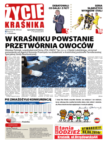 DEBATOWALI CO DALEJ Z FŁT? DWUTYGODNIK NR 8 (22) Polub nas na Facebooku SERIA SŁABSZYCH WYNIKÓW STALI egzemplarz bezpłatny 1-14 czerwca 2014 W kraśniku powstanie Przetwórnia OWOCÓW Wiesław Pyśniak, współwłaściciel firmy „POL-OWOC” Sp. z o. o. z Opola Lubelskiego, otrzymał pozwolenie od Agencji Rozwoju Przemysłu na działalność w kraśnickiej podstrefie Tarnobrzeskiej Specjalnej Strefy Ekonomicznej. I nwestor z Opola posiada certyfikat ISO 22000, HAACP oraz jest członkiem Związku Ochronnego Przemysłu Sokowego (SGF). Produkuje najwyższej jakości mrożone oraz schładzane owoce. Możliwości handlowe zakładu wynoszą ok. 10 000 ton. Wyroby „POL-OWOCU” przeznaczone są w większości na eksport i trafiają do najbardziej wymagających klientów. – Miasto wykorzystało swój atut, jakim jest dobre położenie i specjalizacja produkcji rolnej. Biorąc pod uwagę, że malina jest owocem delikatnym, trudnym do transportu, konieczne jest usytuowanie zakładów przetwórczych w jak najbliższym sąsiedztwie plantacji. Kraśnik jest więc idealnym miejscem na tego rodzaju działalność. Kraśnik czekał na tę inwestycję wiele, wiele lat. To ogromny sukces – mówi burmistrz Mirosław Włodarczyk. Według wstępnych planów zakład ma zatrudniać na stałe kilkunastu, a sezonowo około 50 pracowników. Nie jest to liczba, która uzdrowi lokalny rynek pracy. Ważniejszy jest odbiór surowca od lokalnych producentów i stabilniejsza cena owoców. Nie jest tajemnicą, że w okolicznych miejscowościach uprawą owoców zajmuje się wielu mieszkańców Kraśnika. Umowa notarialna z inwestorem, na mocy której nabędzie prawo wieczystego użytkowania nieruchomości, zostanie podpisana 2 czerwca 2014 r. Właściciel „POL-OWOCU” spotkał się z burmistrzem Włodarczykiem i PiS ZMIAŻDŻYŁo KONKURENCJę WYNIKI WYBORÓW DO PARLAMENTU EUROPEJSKIEGO Kraśnik 2014 Polska Solidarna PSL PO SLD-UP PiS Europa Polska Razem 44,97 proc. 18,87 10,83 proc. Nowa 6 proc. Plus 3,65 proc. Ruch 1,93 proc. Demokracja Prawica proc. Twój Bezpośrednia 6,46 proc. Narodowy Ruch 0,55 proc. 2,64 proc. 4,11 proc. Frekwencja w Kraśniku REKLAMA KOMENTARZ Jarosław Stawiarski lider Prawa i Sprawiedliwości w powiecie kraśnickim - Osiągnięty wynik to nasza wielka wygrana. Na pewno jest to efekt oceny pracy burmistrza Włodarczyka, rekomendowanego na to stanowisko przez PiS, a także jego współpracowników. Pragnę podziękować naszym wyborcom i poprosić o równie duże poparcie w jesiennych wyborach samorządowych. Kolejne cztery lata pozwolą nam zakończyć porządkowanie spraw miasta, pora też rozpocząć taki sam proces w powiecie. poinformował, że po podpisaniu umowy natychmiast przystąpi do gromadzenia dokumentacji. Ma już wybraną firmę projektową oraz wykonawców. Pierwsze prace chce rozpocząć na począt- ku listopada. Zakład ma być oddany do użytku w maju 2015 roku. Burmistrz zobowiązał się do udzielenia w trakcie procesu inwestycyjnego wszelkiej, możliwej pomocy. 13 maja burmistrz wystosował pismo do dyrektora Rejonu Energetycznego Puławy z informacją, że pojawił się podmiot gospodarczy, który będzie realizował inwestycję na terenie objętym TSSE w Kraśniku. Kiedy będą kolejni inwestorzy i czy naszym miastem interesują się nowe podmioty? - Obserwujemy stałe zainteresowanie podmiotów gospodarczych terenami inwestycyjnymi w Strefie Inwestycji Kraśnik, jednakże na tym etapie rozmów nie jestem uprawniony do udzielania jakichkolwiek informacji – przekazał naszej redakcji Wojciech Gołoś, pełnomocnik burmistrza miasta Kraśnik ds. pozyskiwania inwestorów. (M.Sz.) ZAOSTRZA SIĘ WALKA POLITYCZNA W połowie maja zawrzało w Internecie za sprawą modułu kraśnickiego portalu naszemiasto.pl. 12 maja ukazał się tam wpis „Przegląd prasy w Kraśniku. Radna miejska: Mam w d***e Regionalną Izbę Obrachunkową”. We wpisie cytowana jest rzekoma wypowiedź radnej Kraśnika: - W d***e mam RIO - w taki sposób Wioletta Kudła, radna miejska z Kraśnika, skomentowała sprawę dachu na kościele. Pisze o tym Głos Kraśnicki. Pod tym wstępem do artykułu ukazało się zdjęcie radnej przy mikrofonie, zrobione w trakcie obrad samorządu, co sugerowało, że cytowane słowa powiedziano do mikrofonu. Wpis został zamieszczony także na popularnym portalu społecznościowym FACEBOOK. Tym sposobem radna, lekarka, stała się obiektem różnego poziomu komentarzy. Przejrzeliśmy dokładnie wydanie GŁOSU z 7 maja, z zamieszczoną relacją z sesji z Przygotowania do sesji, z lewej radny J. Madejek (dawniej PiS) oraz P. Świderski (PO) 24 kwietnia, podczas której nie pierwszy już raz - toczyła się burzliwa dyskusja na temat bubla jakiego „podrzuciło” Kraśnikowi środowisko polityczne Jarosława Czerwa. Chodzi o uchwałę wprowadzającą tzw. Budżet Obywatelski. W relacji z sesji jest cytowana inna wypowiedź radnej, nie ta, która wywołała tyle emocji. Na stronie 4 GŁOSU odnajdujemy jednak felieton i już w pierwszym zdaniu czytamy: „W d....e mam RIO powiedziała w sprawie dachu kościoła podczas sesji jedna wykształcona rada. Potem już do protokołu i mikrofonu powiedziała...” I tu cytowane są słowa, których zapis znajdzie się w protokole. Autor felietonu nie pozostawia złudzeń, że pisząc o wykształconej radnej ma na myśli Wiolettę Kudłę. Rozumiem więc, że chodzi o... wypowiedź kuluarową, czyli nieoficjalną. Skoro pewne słowa padły gdzieś z boku, to czy na pewno ktoś je dobrze usłyszał? Czy na tej podstawie można tworzyć fakty i budować wizerunek innej osoby, jeżeli ma się dobre intencje? Według naszych źródeł radna będzie zabiegała u wy- PRZEKONAĆ WYBORCÓW dawcy portalu o sprostowanie, gdyż twierdzi, że nie użyła cytowanego zwrotu. Do sprostowania droga może być jednak długa i kręta. Nie wszyscy też muszą je przeczytać. A więc media sympatyzujące z PO, środowiskiem politycznym, któr