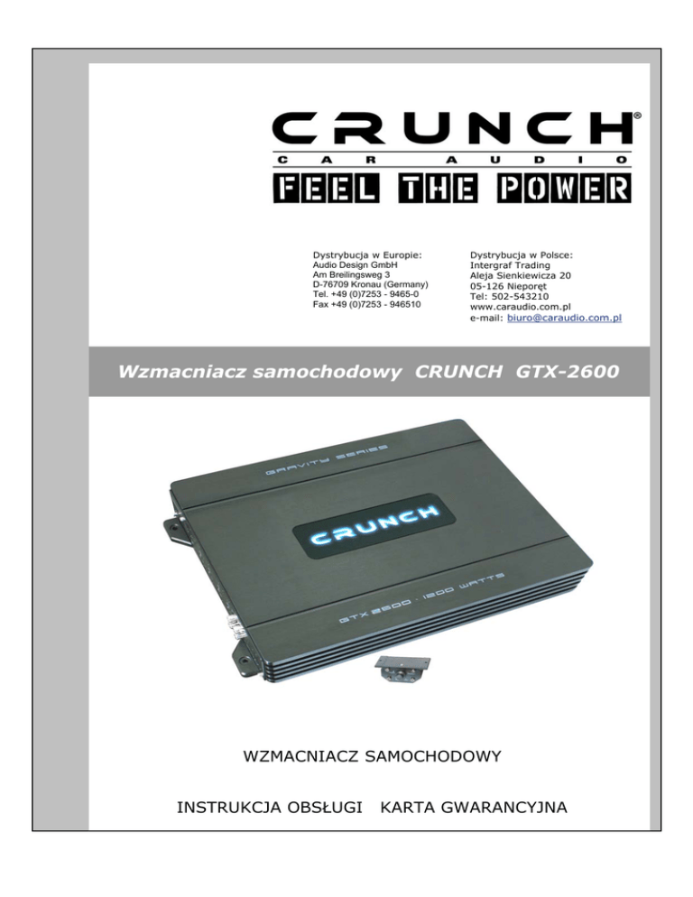 Dystrybucja w Europie: Audio Design GmbH Am Breilingsweg 3 D-76709 Kronau (Germany) Tel. +49 (0)7253 - 9465-0 Fax +49 (0)7253 - 946510 Dystrybucja w Polsce: Intergraf Trading Aleja Sienkiewicza 20 05-126 Nieporęt Tel: 502-543210 www.caraudio.com.pl e-mail: [email protected] Wzmacniacz samochodowy CRUNCH GTX-2600 WZMACNIACZ SAMOCHODOWY INSTRUKCJA OBSŁUGI KARTA GWARANCYJNA Recykling sprzętu elektronicznego Strona 17 WZMACNIACZ SAMOCHODOWY INSTRUKCJA OBSŁUGI Dystrybucja w Europie: Audio Design GmbH Am Breilingsweg 3 D-76709 Kronau (Germany) Tel. +49 (0)7253 - 9465-0 Fax +49 (0)7253 - 946510 Dystrybucja w Polsce: Intergraf Trading Aleja Sienkiewicza 20 05-126 Nieporęt Tel: 502-543210 e-mail: [email protected] Wzmacniacz samochodowy CRUNCH GTX-2600 Dziękujemy za zakup wzmacniacza samochodowego marki CRUNCH. Mamy nadzieję, że użytkowanie tego produktu sprawi Państwu wiele radości i spełni Państwa oczekiwania. Przed przystąpieniem do użytkowania proszę zapoznać się z niniejszą instrukcją. Wszystkich zainteresowanych poszerzeniem wiedzy na temat sprzętu car audio zapraszamy do odwiedzenia strony internetowej www.caraudio.com.pl WAŻNE INFORMACJE BARDZO WAŻNE ZALECENIA DOTYCZĄCE INSTALACJI I EKSPLOATACJI W NOWYCH SAMOCHODACH W pojazdach z ostatnich lat produkcji – od około 2002 – stosowane są komputerowe systemy sterowania i diagnostyki, jak CAN-BUS lub interfejsy MOST-BUS. Podczas instalacji wzmacniacza nowe urządzenie pojawia się w 12-Voltowym systemie elektrycznym, które może w kilku przypadkach powodować wyświetlanie komunikatów o błędach lub może przerwać pracę fabrycznego systemu diagnostycznego w rezultacie pojawienia się wysokich poziomów sygnału i większego zużycia energii. W związku z tym, w zależności od modelu i producenta, niektóre systemy wspomagające bezpieczną jazdę lub odpowiedzialne za bezpieczeństwo mogą zostać przerwane. Jeżeli planujesz używanie wzmacniacza w samochodzie i posiadasz samochód wyposażony w komputerowe systemy sterowania i diagnostyki, stosuj się do następujących zaleceń: − − − − powierz instalację profesjonalnej firmie, która zajmuje się profesjonalnym instalowaniem sprzętu lub usługami naprawczymi i konserwacyjnymi i jest obeznana z systemem elektrycznym pojazdu. po instalacji zleć przeprowadzenie komputerowego sprawdzenia poprawności działania systemu w celu wykrycia ewentualnych nieprawidłowości lub komunikatów o błędach. jeżeli praca systemu elektrycznego została zakłócona przez instalację wzmacniacza, zainstalowanie kondensatora może ustabilizować układ elektryczny i zapewnić prawidłowe i stabilne działanie. Najlepszym rozwiązaniem jest integracja drugiego systemu elektrycznego 12V zasilanego z niezależnego akumulatora do zasilenia całego systemu audio. W RAZIE JAKICHKOLWIEK WĄTPLIWOŚCI SKONSULTUJ SIĘ Z WYSPECJALIZOWANĄ FIRMĄ USŁUGOWĄ - 1 - Wzmacniacz samochodowy CRUNCH GTX-2600 Informacje dotyczące bezpieczeństwa Urządzenie zostało zaprojektowane i wyprodukowane w sposób zapewniający bezpieczeństwo użytkowania. Jednakże niewłaściwa obsługa może spowodować porażenie elektryczne, pożar lub inne uszkodzenia. Podczas użytkowania prosimy o przestrzeganie poniższych zasad: Wzmacniacz przystosowany jest do pracy wyłącznie z zasilaniem 12V z ujemnym biegunem na masie samochodu. Z uwagi na zagrożenie pożarowe, zagrożenie porażenia prądem elektrycznym i inne szkody zabronione jest używanie urządzenia w pojazdach z innym zasilaniem. Nie należy używać wzmacniacza, gdy napięcie akumulatora jest za niskie, grozi to uszkodzeniem urządzenia. Zabronione jest wykonywanie jakichkolwiek operacji na systemie audio, które wymagają dłuższej uwagi i odwracają uwagę kierowcy od prowadzenia pojazdu. Aby uniknąć zagrożenia wypadkiem czynności te należy dokonywać tylko podczas postoju pojazdu w bezpiecznym miejscu. Głośność systemu podczas jazdy powinna być tak dobrana, by nie zakłócała uwagi kierowcy i jego kontaktu z otoczeniem. Wysokiej jakości systemy audio mogą generować wysokie ciśnienie akustyczne. Długotrwałe słuchanie muzyki na ekstremalnie wysokim poziomie głośności może spowodować utratę zdolności słuchowych i zaburzenia słuchowe. Poziom głośności słuchanej muzyki nie może osłabiać odbierania sygnałów ostrzegawczych w ruchu na drodze. W interesie wspólnego bezpieczeństwa zalecamy słuchanie muzyki na niższych poziomach głośności podczas jazdy, aby uniknąć ryzyka wypadku. Przed przystąpieniem do instalacji należy odłączyć co najmniej ujemny biegun akumulatora. Patrz rozdział Instalacja. Wzmacniacz powinien być zamontowany w miejscu pozbawionym kurzu i zapewniającym dobrą wentylację, zabezpieczonym przed działaniem wilgoci lub dostaniem się deszczu. Aby uniknąć zwarcia elektrycznego należy chronić wzmacniacz przed dostaniem się jakiegokolwiek płynu do jego wnętrza. Nie należy wrzucać jakichkolwiek przedmiotów do wewnątrz wzmacniacza przez otwory wentylacyjne czy jakiekolwiek inne otwory w urządzeniu. Wzmacniacz nie może być przykryty lub zamontowany w miejscu uniemożliwiającym cyrkulację powietrza. W szczególnych przypadkach należy zamontować wentylatory chłodzące. Kumulacja ciepła we wzmacniaczu stwarza zagrożenie pożarem. Wewnątrz wzmacniacza występuje niebezpieczne napięcie. Nie należy otwierać urządzenia, gdyż grozi to porażeniem i/lub uszkodzeniem wzmacniacza. Otwieranie urządzenia przez osoby niepowołane powoduje utratę gwarancji. W przypadku przepalenia się bezpieczników sprawdzić poprawność instalacji systemu. Wymienić bezpiecznik na nowy o tym samym nominale. - 2 - Wzmacniacz samochodowy CRUNCH GTX-2600 Informacje dotyczące bezpieczeństwa Nie używaj urządzenia, jeżeli wykazuje jakiekolwiek błędy w działaniu. Sprawdź możliwą przyczynę w rozdziale Rozwiązywanie problemów. W razie powtarzającego się problemu nal