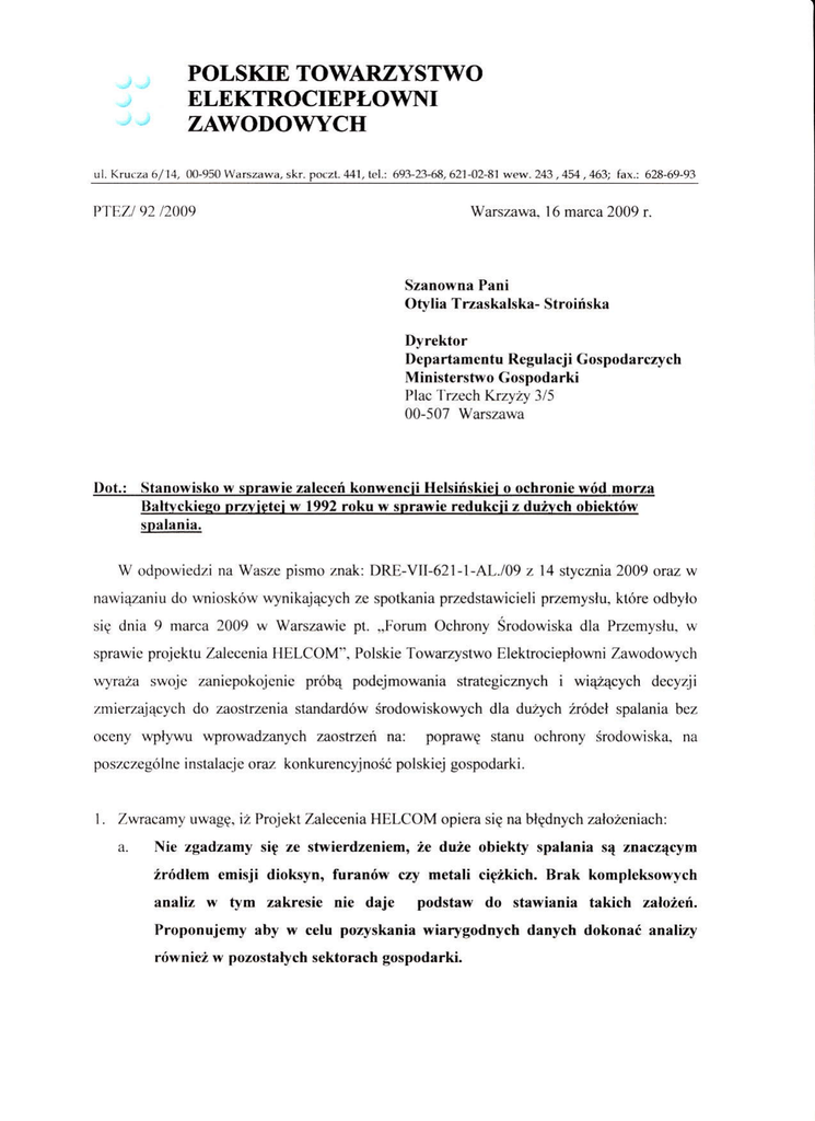 POLSKIE TOWARZYSTWO ELEKTRocIEPŁowNI ZAWODOWYCH !|- Krlcza 6/14, 00'950 Wa.snwa, skr. pfuzL'Ą4.|,Icl-.693.23-a' 621.02.8]wew 243,451,463; fax': ó28.ó9.93 P1'b.Z/92 /2009 Warszawa.16 marca2009r. SzanownaPani otylia Trzaskalska. stroińska Dyrektor DepańamcntuReguIacjicospodarcrych MinistersfwoGospodarki P|ac Tftech Klzyży 3/5 00-507 Warszawa I)ot.: Stanowiskow sprawiezaleceńkonwencii He|sińskieio ochroniewód morza Bałtvckiegoorzvietei w 1992roku w sorawie redukcii z dużvcbobiektów W odpowiedzina Waszepismo znak:DRE-Vll-621-1-AL.l09z 14 stlcznia f009 oraz w nawiązaniudo wnioskówwynikającychze spotkaniap.zedstawicieliprzemysłu, które odbyło pt' ''Forum ochrony Srodowiskad|a Przemysłu,w się dnia 9 marca 2009 w Warsza\-vie sprawieprojektuZaleceniaHELcoM''. PolskieTowaŹystwoElektrociepłowni Zawodowych wyraża swoje zaniepokojeniepróbą podejmowaniastratcgicznychi wiązącychdecyzji zmierzającychdo '.aostlzeniastandardówśrodowiskowych d|a dułch źródełspa|aniabez oceny lłptrł'tr wprowadzanych mostrzeń na: poplawę stanu ochrony środowiska.na poszc7€ g óIneinsta|acje polskiejgospodarki. oraz konkurencyjność ]' Zw€ c amy uwagę'iŹ ProjektZaleceniaHELcoM opierasię na Mędnychzałożeniach: a. Nie zgadzamy się ze stwierdz€ n i€ m ' że duże obiekty spa|ania są znaczącym źródlem cmisji dioksyn' furanów czy mota|i ciężkich' Brak ko pleksowych analiz w tym zakr€ s ie nie daj€ podŚtaw do statłiania takich załoźeń. Proponujemy aby w ce|u pozyskania wiarygodnych danych dokonać ana|iry równicżw pozostałychsektorachgospodarki. b. objęcie instalacji energetycmego spa|ania paliw wymaganiami w zakresie monitorowania zAniecryszczeń do Powietrza przepisami' które mają obecnie fastosowaniewyłączniedla insta|acjispalającychodpady. możedoprowadzićdo nieuzasadnionego, zaostrzenił wymagań poprfez rozszerzenie zakresu moritorow.nycb z'Bieczyszczeń. 2. Ustosunkowująpsię do postawionęgow drugiej częściPaństwa pisma pytania o możliwość ustanowieniaw Polsce metodmonitorowaniazgodniez normami:PN _EN 14181 :2005oraz PN EN 13 284 -2 informujemy,że są onęjuf stosowanew zakresie wykon1.rłaniai nadzorowania systemów służącychdo monitorowania emisji spalin ze źródełspalania'co pozwalanarn na posługiwarrie się wiarygodnymiwielkościami'ich ustanowienieznalazłoodzwierciedleńe w przepisach p|awa tj. |ozporzĄdzęniuMinistra Środowiska z dnia 4listopada 2008 w sprawie wymagan w zakresie prowadzenia pomiarów wielkościemisji oraz pomiarów ilościpobieranejwody (Dz.U.2008Nr206 poz'218| załączniknr l)' dlatego też kolejne wprowadzanie zaleceń w lym obszarze lwai^my ,Ą zbyteczne. Dlatego też Polskie Towarzystwo Elektrociepłowni Zawodowych wyraża negatytłną opinię odnośniezalecenia ustanowięnia bardziej restrykcyjnych wymogów w zakesie zrzutów substancjiniebezpięcznychdo wód powięrzchniovych i podziemnych'obejmującego duże obiekty spalania' oraz obowiązku wprowadzenia systemu ciągłegomonitolowania stężeńmasowychmetali cięzkich oraz dioksyn i ńrranów. Ewentualnezalecenie,o i|ejest ono w ogóle koniecne' powinno urłzględniać fakt, ii' duiLe obiekty spalania są niewielkim emitentemtych zanieczyszczei i wstarczAjącejest pifeprowadfanie w nich okresowych (np. raz na rok) pomiarów tych substancji.NależTpodkrcślić,że zarówno prowadzenieciągłego monitoringu'jak i ewenfualnepodejmowaniedzia,łń ograaiczającychemisję dioksyn i metali cięŹkich' przyniesie efekĘ aiewspó|mierne do poniesionych kosztów, zwajry,łs4, ii! ograniczanie 7AĄieczyszczeń najmniejszych emisji jest technologicznie najtrudniejsze i naibardziei kosztowne