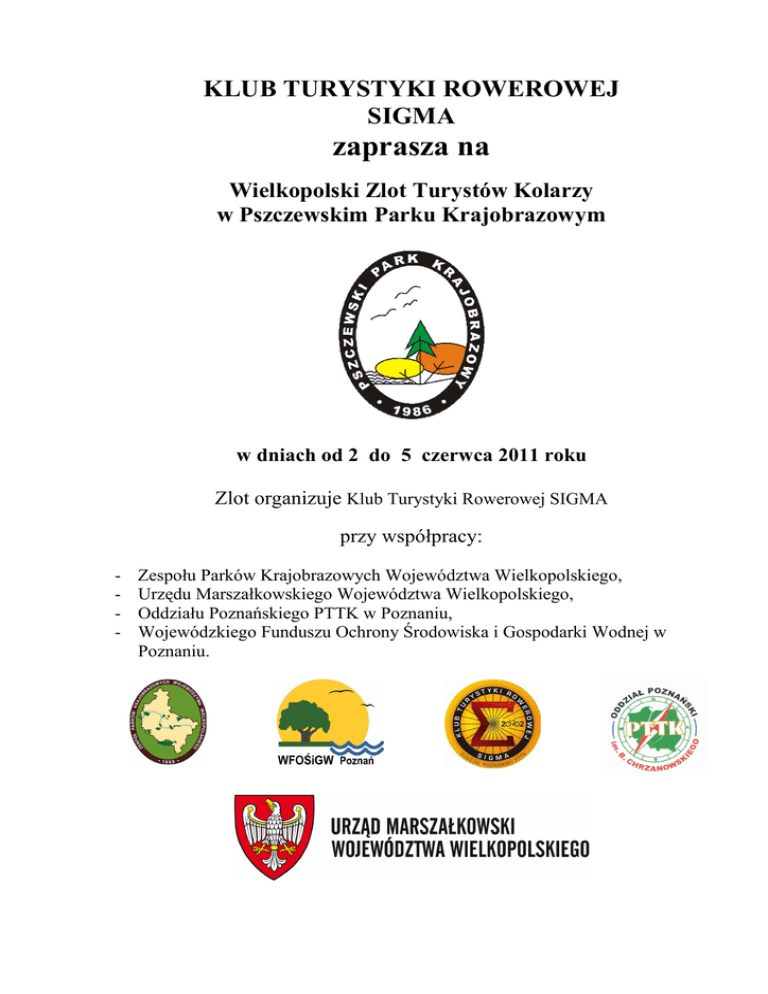 KLUB TURYSTYKI ROWEROWEJ SIGMA zaprasza na Wielkopolski Zlot Turystów Kolarzy w Pszczewskim Parku Krajobrazowym w dniach od 2 do 5 czerwca 2011 roku Zlot organizuje Klub Turystyki Rowerowej SIGMA przy współpracy: - Zespołu Parków Krajobrazowych Województwa Wielkopolskiego, Urzędu Marszałkowskiego Województwa Wielkopolskiego, Oddziału Poznańskiego PTTK w Poznaniu, Wojewódzkiego Funduszu Ochrony Środowiska i Gospodarki Wodnej w Poznaniu. KOMITET ORGANIZACYJNY ZLOTU 1. WIESŁAWA KIL 2. RYSZARD RURKA 3. BEATA NOWICKA 4. GERTRUDA BIECHOWIAK 5. ANDRZEJ SZYMAŃSKI - KOMANDOR - WICEKOMANDOR - KONKURSY - SEKRETARIAT - PROWADZENIE TRAS I. Cele zlotu - poznanie walorów przyrodniczych i kulturowych Pszczewskiego Parku Krajobrazowego - popularyzacja turystyki kolarskiej jako jednej z form czynnego wypoczynku - nawiązywanie nowych kontaktów między uczestnikami zlotu II.Termin zlotu - zlot odbędzie się w dniach od czwartku 2 czerwca do niedzieli 5 czerwca 2011 roku III.Miejsce zlotu - Pszczewski Park Krajobrazowy Baza zlotu – Ośrodek Wypoczynkowy Wodnik, 66-330 Pszczew ul. Wybudowanie 11 IV.Zgłoszenia i wpisowe Zgłoszenia na zlot wraz z kserokopią dowodu wpłaty kosztów uczestnictwa naleŜy nadesłać na adres: Oddział Poznański PTTK 61-773 Poznań Stary Rynek 89/90 z dopiskiem „Pszczew – 2011 „ w nieprzekraczalnym terminie do dnia 25 maja 2011 r. Wpisowe moŜna będzie wpłacać na organizowanym przez klub zlocie „Wiosna z Koziołkami” w terminie 20-22.05.2011 w Poznaniu Wpisowe ( w tym zawarty jest koszt noclegów z pościelą) w wysokości: - członkowie PTTK - 105 zł - pozostali - 115 zł naleŜy wpłacić na podane niŜej konto bankowe : PKO BP 1 Oddział w Poznaniu nr: 50 1020 4027 0000 1902 0323 2196 z dopiskiem „Pszczew-2011” Ilość miejsc ograniczona !!! Kontakt z organizatorem – 0-604 620 825 e-mail [email protected] O przyjęciu na zlot decyduje kolejność zgłoszeń i komitet organizacyjny V. Świadczenia organizatorów - okolicznościowy znaczek zlotu - materiały krajoznawcze - odcisk okolicznościowej pieczęci - wklejka okolicznościowa - potwierdzenie punktów na KOT - posiłek turystyczny w dniu 3 i 4 czerwca 2011r - nagrody dla zwycięzców konkursów VI. Obowiązki uczestników - członkowie PTTK podlegają ubezpieczenie od NNW i OC zgodnie z zasadami określonymi w zarządzeniach Sekretarza Generalnego ZG PTTK, obowiązek ubezpieczenia pozostałych uczestników spoczywa na zainteresowanych. - przestrzeganie Karty Turysty, Regulaminu Zlotu i Regulaminu Ośrodka - posiadanie sprawnego roweru, wyposaŜonego zgodnie z przepisami kodeksu drogowego - przestrzeganie przepisów ruchu drogowego - aktywny udział w konkursach proponowanych przez organizatorów - posiadanie dowodu toŜsamości i aktualnej legitymacji PTTK VII Postanowienia końcowe - młodzieŜ do lat 18 moŜe wziąć udział w zlocie tylko pod opieką osoby pełnoletniej - organizatorzy zlotu nie biorą odpowiedzialności za szkody wyrządzone przez uczestników zlotu osobom trzecim i na odwrót - uczestnik zlotu ponosi prawną odpowiedzialność za szkody wynikłe z jego winy - impreza odbędzie się w przewidzianym terminie bez względu na pogodę - w razie nie przybycia na zlot wpisowe oraz opłata noclegów nie podlegają zwrotowi - ostateczna interpretacja regulaminu naleŜy do organizatorów PROGRAM ZLOTU CZWARTEK - 02.06.2011r. od godz. 16.00 – przyjmowanie i zakwaterowanie uczestników zlotu w Pszczewie godz. 20.00 – spotkanie organizacyjne, informacja o programie zlotu oraz prelekcja na temat walorów przyrodniczych i kulturowych Pszczewskiego Parku Krajobrazowego PIĄTEK - 03.06.2011r. godz. 9.00 - wyjazd na trasę po Pszczewskim Parku Krajobrazowym – długość trasy – około 60 km ( trasę poprowadzą przodownicy turystyki kolarskiej , członkowie KTR Sigma ) godz. 18.00 - konkursy krajoznawcze i rekreacyjne , zajęcia integracyjne w podgrupach SOBOTA - 04.06.2011r. godz. 9.00 - wyjazd na trasę po Pszczewskim Parku Krajobrazowym - długość trasy – około 60 km ( trasę poprowadzą przodownicy turystyki kolarskiej , członkowie KTR Sigma ) godz. 18.00 - konkursy krajoznawcze i rekreacyjne , zajęcia integracyjne w podgrupach godz. 21.00 - podsumowanie zlotu NIEDZIELA - 05.06.2011r. godz. 10.00 - zakończenie zlotu – *** Pszczewski Park Krajobrazowy został utworzony w 1986 roku. Jego powierzchnia wraz z otuliną wynosi 45 tys. ha. Park składa się z dwóch oddzielnych kompleksów. Większy obejmuje duŜą rynnę glacjalną z największymi jeziorami parku oraz dolinę rzeki Obry. Mniejszy kompleks chroni najcenniejszą przyrodniczo i krajobrazowo część doliny rzeki Kamionki w okolicach Międzychodu. O zróŜnicowaniu przyrodniczym i krajobrazowym decydują trzy podstawowe strefy krajobrazowe: morenowa, sandrowa i dolinna. Strefę morenową charakteryzuje obecność pojedynczych wzniesień lub ich ugrupowań o często duŜych róŜnicach wysokości względnej ciągnących się wałem od wsi Rokitno aŜ po Tuczępy. NajwyŜszym z nich nadano nawet miano gór o ciekawych nazwach. Zdobyć więc moŜemy Królewską Górę, Górę Trębacza czy Kozie Góry. Obszary te porastają przewaŜnie lasy liściaste i mieszane, szczególnie malownicze w porze jesiennej. W obniŜeniach między wzgórzami występują często obszary podmokłe, torfowiska, olsy bądź małe jeziora. Do wsi Brzezie od zachodu przylega rozległy obszar mokradeł zwany "Moczarami brzeskimi". Wraz z ciągnącym się południkowo wałem ozowym stanowią one dogodne siedlisko Ŝółwia błotnego. Od południa do strefy morenowej przylega Jezioro Lubikowskie, największe i najgłębsze jezioro Pszczewskiego Parku Krajobrazowego. Czyste o duŜej przejrzystości wody i urozmaiconym dnie często odwiedzane jest przez płetwonurków. Piaszczystą strefę sandrową o powierzchni lekko pofalowanej upiększają liczne wzniesienia (ozy, wydmy, kemy). Szczególnie malownicza jest tu przebiegająca po
