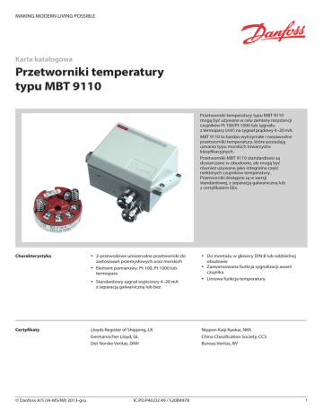MAKING MODERN LIVING POSSIBLE Karta katalogowa Przetworniki temperatury typu MBT 9110 Przetworniki temperatury typu MBT 9110 mogą być używane w celu zamiany rezystancji czujników Pt 100/Pt 1000 lub sygnału z termopary (mV) na sygnał prądowy 4–20 mA. MBT 9110 to bardzo wytrzymałe i niezawodne przetworniki temperatury, które posiadają uznania typu morskich towarzystw klasyfikacyjnych. Przetworniki MBT 9110 standardowo są dostarczane w obudowie, ale mogą być również używane jako integralna część niektórych czujników temperatury. Przetworniki dostępne są w wersji standardowej, z separacją galwaniczną lub z certyfikatem EEx. Charakterystyka yy 2-przewodowe uniwersalne przetworniki do zastosowań przemysłowych oraz morskich yy Element pomiarowy: Pt 100, Pt 1000 lub termopara yy Standardowy sygnał wyjściowy 4–20 mA z separacją galwaniczną lub bez Certyfikaty © Danfoss A/S (IA-MS/IM) 2013-gru. yy Do montażu w głowicy DIN B lub oddzielnej obudowie yy Zaawansowana funkcja sygnalizacji awarii czujnika yy Liniowa funkcja temperatury Lloyds Register of Shipping, LR Nippon Kaiji Kyokai, NKK Germanischer Lloyd, GL China Classification Society, CCS Det Norske Veritas, DNV Bureau Veritas, BV IC.PD.P40.O2.49 / 520B4978 1 Karta katalogowa Przetwornik temperatury typu MBT 9110 Dane techniczne Specyfikacja Dokładność podstawowa Pt 100 Termopara typu E, J, K, L, N, T, U Termopara typu B, R, S Błąd liniowości < 0,1% zakresu Współczynnik temperaturowy < ±0,01% zakresu/Kotocz. Czas reakcji Programowany: 1–60 s Standardowy: 1 s Kompensacja zimnych lutów (CJC) < ±1,0°C Czas rozgrzewania 5 min Czas aktualizowania 440 ms Efekt rezystancji przewodu czujnika (3/4 przewody) < 0,002Ω/Ω < ±0,3°C < ±1,0°C < ±2,0°C Kotocz. = Zmiana temperatury otoczenia Charakterystyka elektryczna Napięcie zasilania 8–35 V d.c. Wpływ wahań napięcia zasilania < 0,005% zakresu/V d.c Sygnał wyjściowy 4–20 mA Funkcja sygnalizacji awarii czujnika Namur NE43, skalowanie do 23 mA Standard Pt 100 (EN 60751) 2-, 3-przewodowe, -200–800°C Pt 1000 (EN 60751) 2-, 3-przewodowe Separacja galwaniczna Pt 100 (EN 60751) 2-, 3-, 4-przewodowe, -200–800°C Pt 1000 (EN 60751) 2-, 3-przewodowe Termopara (EN 60584) Wejście Stosunek sygnału do szumu Co najmniej 60 dB Maksymalny przekrój przewodów 1×1,5 mm² Maksymalna rezystancja przewodów 5 Ω/żyłę Warunki pracy Klasa napięciowa izolacji 1500 V AC Zabezpieczenia przed zakłóceniami elektromagnetycznymi (EMC) EN 61326-1 Drgania/uderzenia IEC 60068-2-6/IEC 60068-2-84 Wstrząsy 4 g/2–100 Hz Wilgotność Wilgotność względna 0–98%, zgodnie z normą IEC 60068-1, IEC 60068-2-2 Temperatura otoczenia od -40 do 85°C Stopień ochrony (obudowa/styki) IP68/IP00 W dodatkowej obudowie IP54 Charakterystyka mechaniczna © Danfoss A/S (IA-MS/IM) 2013-gru. Maksymalne przesunięcie 50% maksymalnej wartości wejściowej (Pt 100: 400°C) (termopara typu R: 650°C) Masa Z podwyższoną pokrywą do głowicy złącza B: 0,080 kg W dodatkowej obudowie: 0,360 kg IC.PD.P40.O2.49 / 520B4978 2 Karta katalogowa Przetwornik temperatury typu MBT 9110 Zamawianie Czujnik Typ MBT 9110 Zastosowanie Przemysł, okrętownictwo Typ Standard Element pomiarowy Czujnik typu Pt 100 Termopara typu K, NiCr-Ni Czujnik typu Pt 1000 Inny Połączenie 2 przewody 3 przewody1) 4 przewody 0 0 1 2 3 4 5 6 7 8 9 0 0 5 D 9 0 1 0 9 A B C G H A B D E ) Standard - podłączenie 3-przewodowe 1 Wersje zalecane © Danfoss A/S (IA-MS/IM) 2013-gru. M O 0 1 2 3 4 5 6 7 8 9 Nastawa przetwornika (maks. zakresu pomiarowego) 0°C (lub brak) 1. cyfra - części setne 2. cyfra - części dziesiętne Przykłady: Zakres temperatury 220°C = 22 Zakres temperatury 150°C = 15 Inna Nastawa przetwornika (min. zakresu pomiarowego) Brak 0°C -50°C Inna Typ przetwornika: Blok styków Standardowy Z separacją galwaniczną W podwyższonej pokrywie Standardowy Z separacją galwaniczną W dodatkowej obudowie Standardowy Z separacją galwaniczną W dodatkowej obudowie z metalową pokrywą Standardowy Z separacją galwaniczną IC.PD.P40.O2.49 / 520B4978 3 Karta katalogowa Przetwornik temperatury typu MBT 9110 Wymiary W dodatkowej obudowie PG13.5 Wszystkie wymiary podane są w milimetrach W dodatkowej obudowie ø 4 6 .9 ø69 6.5 2×ø5.3 Wszystkie wymiary podane są w milimetrach © Danfoss A/S (IA-MS/IM) 2013-gru. IC.PD.P40.O2.49 / 520B4978 4