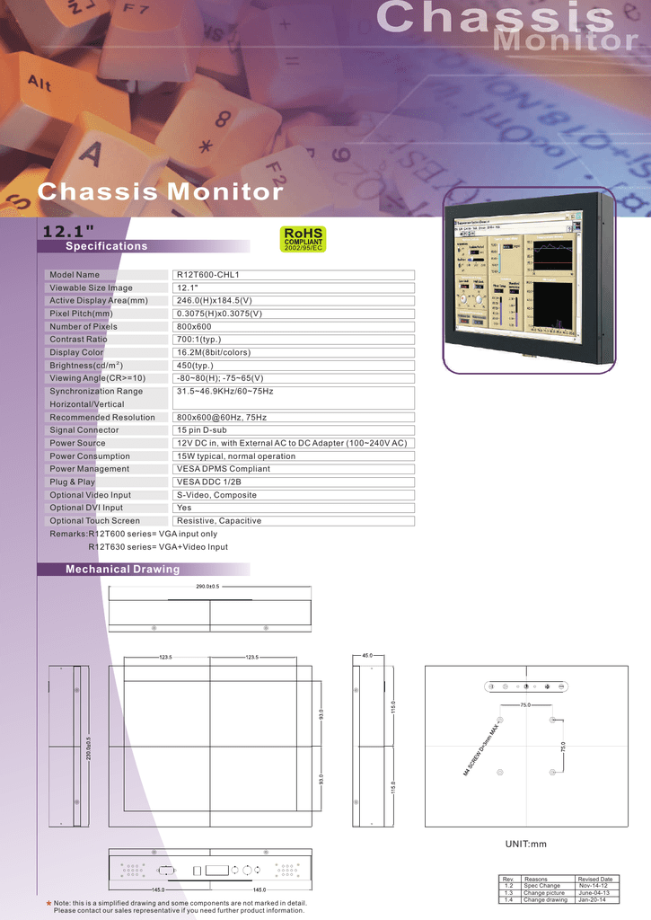 Chassis Monitor 12.1" Specifications Model Name R12T600-CHL1 Viewable Size Image 12.1" Active Display Area(mm) 246.0(H)x184.5(V) Pixel Pitch(mm) 0.3075(H)x0.3075(V) Number of Pixels 800x600 Contrast Ratio 700:1(typ.) Display Color 16.2M(8bit/colors) Brightness(cd/m 2 ) 450(typ.) Viewing Angle(CR>=10) -80~80(H); -75~65(V) Synchronization Range 31.5~46.9KHz/60~75Hz Horizontal/Vertical Recommended Resolution 800x600@60Hz, 75Hz Signal Connector 15 pin D-sub Power Source 12V DC in, with External AC to DC Adapter (100~240V AC) Power Consumption 15W typical, normal operation Power Management VESA DPMS Compliant Plug & Play VESA DDC 1/2B Optional Video Input S-Video, Composite Optional DVI Input Yes Optional Touch Screen Resistive, Capacitive Remarks:R12T600 series= VGA input only R12T630 series= VGA+Video Input Mechanical Drawing UNIT:mm Note: this is a simplified drawing and some components are not marked in detail. Please contact our sales representative if you need further product information. Rev. 1.2 1.3 1.4 Reasons Spec Change Change picture Change drawing Revised Date Nov-14-12 June-04-13 Jan-20-14