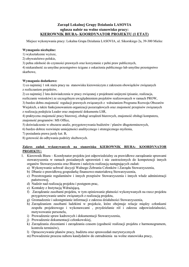 Zarząd Lokalnej Grupy Działania LASOVIA ogłasza nabór na wolne stanowisko pracy: KIEROWNIK BIURA- KOORDYNATOR PROJEKTU (1 ETAT) Miejsce wykonywania pracy: Lokalna Grupa Działania LASOVIA, ul. Sikorskiego 2a, 39-300 Mielec Wymagania niezbędne: 1) wykształcenie wyższe, 2) obywatelstwo polskie, 3) pełna zdolność do czynności prawnych oraz korzystanie z pełni praw publicznych, 4) niekaralność za umyślne przestępstwo ścigane z oskarżenia publicznego lub umyślne przestępstwo skarbowe, Wymagania dodatkowe: 1) co najmniej 1 rok stażu pracy na stanowisku kierowniczym z zakresem obowiązków związanych z rozliczaniem projektów, 2) co najmniej 2 lata doświadczenia w pracy związanej z projektami unijnymi (pisanie, realizacja, rozliczanie wniosków) ze szczególnym uwzględnieniem projektów realizowanych w ramach PROW, 3) bardzo dobra znajomość regulacji prawnych związanych z wdrażaniem Programu Rozwoju Obszarów Wiejskich, a także funkcjonowaniem organizacji pozarządowych oraz znajomość przepisów związanych z realizacją podejścia Leader oraz znajomość dokumentu LSR, 4) praktyczna znajomość pracy biurowej, obsługi urządzeń biurowych, znajomość obsługi komputera, znajomość programów: MS Office, 5) doświadczenie w obszarze analiz, przygotowywania budżetów / planów długoterminowych, 6) bardzo dobrze rozwinięte umiejętności analitycznego i strategicznego myślenia, 7) posiadania prawa jazdy kat. B, 8) gotowość do odbywania podróży służbowych. Zakres zadań wykonywanych na stanowisku KIEROWNIK BIURA- KOORDYNATOR PROJEKTU: 1. Kierownik Biura – Koordynator projektu jest odpowiedzialny za prawidłowe zarządzanie sprawami stowarzyszenia w ramach posiadanych uprawnień i nie zastrzeżonych do kompetencji innych organów Stowarzyszenia oraz Biurem i należyta realizacją następujących zadań: a) Wykonywanie uchwał/ decyzji Walnego Zebrania Członków i Zarządu Stowarzyszenia, b) Dbanie o prawidłową gospodarkę finansowo-materiałową Stowarzyszenia, c) Przestrzeganie regulaminów i innych przepisów Stowarzyszenia i innych władz administracji państwowej, d) Nadzór nad realizacją projektu i postępem prac, e) Kontakty z Instytucją Wdrażającą, f) Zarządzanie zasobami projektu, w tym opiniowanie płatności wykonywanych na rzecz projektu przygotowywanie umów związanych z realizacją projektu, g) Gromadzenie i udostępnianie informacji z zakresu działalności Stowarzyszenia, h) Zarządzaniem zasobami ludzkimi w projekcie, które obejmuje relacje między członkami zespołu projektowego i wykonawcami , przydzielanie ról i zakresu odpowiedzialności, motywowanie personelu, i) Prowadzenie spraw kadrowych i dokumentacji Stowarzyszenia, j) Prowadzenie dokumentacji członkowskiej, k) Zarządzania zleceniami i zarządzania czasem (zgodność realizacji projektu z harmonogramem, kontrola terminów), l) Opracowywanie planów pracy, budżetu oraz sprawozdań merytorycznych m) Prowadzenie procesu naboru kandydatów do zatrudnienia na wolne stanowiska pracy, n) Udział w różnego rodzaju naradach, sympozjach, konferencjach, seminariach, szkoleniach, uroczystościach związanych z działalnością Stowarzyszenia, o) Przyjmowanie i ewidencjonowanie wniosków beneficjentów Stowarzyszenia, p) Sprawowanie pieczy nad sprzętem biurowym oraz zlecanie przeprowadzania jego konserwacji lub naprawy. q) Stały monitoring i ewaluacja projektu. Wymagane dokumenty: a) list motywacyjny, b) kwestionariusz osobowy, c) kserokopia dokumentu tożsamości, d) kserokopie świadectw pracy, e) kserokopie dyplomów potwierdzających wykształcenie, f) kserokopie zaświadczeń o ukończonych kursach, szkoleniach, g) oświadczenie kandydata o korzystaniu z pełni praw publicznych i o niekaralności za przestępstwo popełnione umyślnie, h) oświadczenie o wyrażeniu zgody na przetwarzanie danych osobowych do celów rekrutacyjnych. Oferty wraz z wymaganymi załącznikami należy składać w nieprzekraczalnym terminie od dnia 08.02.2017r. do dnia 21.02.2017r. w godz. 700 do 1500 w Biurze Lokalnej Grupy Działania LASOVIA, ul. Sikorskiego 2a, 39-300 Mielec, pokój nr 5. Dokumenty należy składać w zamkniętej kopercie, opatrzonej napisem: „Nabór na wolne stanowisko pracy: KIEROWNIK BIURA- KOORDYNATOR PROJEKTU”, adres i telefon składającego ofertę. Aplikacje które wpłyną do Biura Lokalnej Grupy Działania LASOVIA po wyżej określonym terminie nie będą rozpatrywane. Informacja o wyniku naboru będzie umieszczona na stronie internetowej www.lasovia.com.pl oraz tablicy ogłoszeń Lokalnej Grupy Działania LASOVIA. Inne dokumenty poza wskazanymi powyżej nie będą przyjmowane i nie mają wpływu na procedurę rekrutacyjną. * druk kwestionariusza można otrzymać w siedzibie Lokalnej Grupy Działania LASOVIA lub pobrać ze strony www.lasovia.com.pl. Uwagi: Wymagane dokumenty aplikacyjne: list motywacyjny, szczegółowe CV (z uwzględnieniem dokładnego przebiegu kariery zawodowej), powinny być opatrzone klauzulą: Wyrażam zgodę na przetwarzanie moich danych osobowych zawartych w ofercie pracy dla potrzeb niezbędnych do realizacji procesu rekrutacji zgodnie z ustawą z dnia 29 sierpnia 1997 r. o ochronie danych osobowych (Dz. U. z 2015 r., poz. 2135 z późn, zm.)