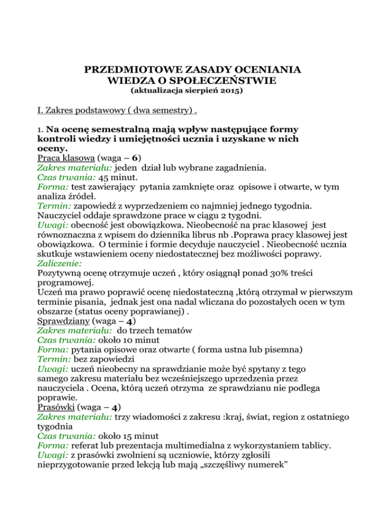 PRZEDMIOTOWE ZASADY OCENIANIA WIEDZA O SPOŁECZEŃSTWIE (aktualizacja sierpień 2015) I. Zakres podstawowy ( dwa semestry) . 1. Na ocenę semestralną mają wpływ następujące formy kontroli wiedzy i umiejętności ucznia i uzyskane w nich oceny. Praca klasowa (waga – 6) Zakres materiału: jeden dział lub wybrane zagadnienia. Czas trwania: 45 minut. Forma: test zawierający pytania zamknięte oraz opisowe i otwarte, w tym analiza źródeł. Termin: zapowiedź z wyprzedzeniem co najmniej jednego tygodnia. Nauczyciel oddaje sprawdzone prace w ciągu 2 tygodni. Uwagi: obecność jest obowiązkowa. Nieobecność na prac klasowej jest równoznaczna z wpisem do dziennika librus nb .Poprawa pracy klasowej jest obowiązkowa. O terminie i formie decyduje nauczyciel . Nieobecność ucznia skutkuje wstawieniem oceny niedostatecznej bez możliwości poprawy. Zaliczenie: Pozytywną ocenę otrzymuje uczeń , który osiągnął ponad 30% treści programowej. Uczeń ma prawo poprawić ocenę niedostateczną ,którą otrzymał w pierwszym terminie pisania, jednak jest ona nadal wliczana do pozostałych ocen w tym obszarze (status oceny poprawianej) . Sprawdziany (waga – 4) Zakres materiału: do trzech tematów Czas trwania: około 10 minut Forma: pytania opisowe oraz otwarte ( forma ustna lub pisemna) Termin: bez zapowiedzi Uwagi: uczeń nieobecny na sprawdzianie może być spytany z tego samego zakresu materiału bez wcześniejszego uprzedzenia przez nauczyciela . Ocena, którą uczeń otrzyma ze sprawdzianu nie podlega poprawie. Prasówki (waga – 4) Zakres materiału: trzy wiadomości z zakresu :kraj, świat, region z ostatniego tygodnia Czas trwania: około 15 minut Forma: referat lub prezentacja multimedialna z wykorzystaniem tablicy. Uwagi: z prasówki zwolnieni są uczniowie, którzy zgłosili nieprzygotowanie przed lekcją lub mają „szczęśliwy numerek” Inne oceny: (waga – 4) Ustna odpowiedź (z trzech tematów lekcyjnych) Praca domowa Referat Ćwiczenia Praca na lekcji ( zadania w grupie, indywidualne) Aktywność na lekcji Projekty edukacyjne, prezentacje multimedialne, udział w zdarzeniach szkolnych o charakterze edukacyjnym. Olimpiady, konkursy Uczniowie, którzy brali udział w olimpiadach: Polska i Świat Współczesny, Praw Człowieka oraz Wiedzy o Unii Europejskiej a także innych konkursach tematycznych i otrzymali tytuł laureata bądź finalisty otrzymują ocenę celującą na koniec roku szkolnego. 2. Nieprzygotowania Uczeń ma prawo do zgłoszenia jednego nieprzygotowania w semestrze. Uczeń zgłasza nieprzygotowanie przed rozpoczęciem zajęć. Za nieprzygotowanie uważa się brak: pracy domowej, zeszytu z pracą domową lub podręcznika oraz brak znajomości zakresu materiału dotyczącego ostatnich trzech tematów. Uczeń nieobecny na zajęciach ma obowiązek uzupełnić notatki i przygotować się do lekcji, zaś nauczyciel ma prawo zapytać ucznia z tego zakresu. 3. Szczęśliwy numerek Nie uznaje się szczęśliwego numerka w przypadku zapowiedzianego sprawdzianu, prasówki. 4. Obliczanie oceny semestralnej a) Ocena semestralna - jest średnią ważoną wszystkich ocen cząstkowych uzyskanych w danym semestrze. Ocenę dopuszczającą uczeń otrzyma jeśli uzyska min. 1.7 pkt; dostateczną – 2,50 pkt; dobrą – 3,50pkt; bardzo dobrą – 4,50 pkt b) ocena roczna – jest średnią ważoną ocen uzyskanych w pierwszym i drugim semestrze I semestr II semestr ocena roczna Ocena pkt (np. 4,22) | + | ocena w pkt (np. 3,88) | : 2 | dobry (4,0 Nauczyciel może podwyższyć ocenę semestralna lub roczną uczniowi, który osiągnął min. 90% frekwencji na zajęciach i aktywnie w nich uczestniczył. Ponadto uczeń może otrzymać dodatkową ocenę za szczególny wkład w popularyzację wiedzy dotyczącej WOS na forum szkoły bądź środowiska lokalnego. Uczeń ma prawo poprawić ocenę roczną przed wystawieniem oceny ostatecznej poddając się kontroli w formie pisemnej z materiału wiedzy z całego roku. Podstawą klasyfikacji jest uzyskanie powyżej 50% frekwencji na zajęciach przedmiotowych oraz zdobycie przez ucznia przynajmniej 1ej oceny z każdej kategorii oceniania zastosowanej w skali semestru bądź roku przez nauczyciela. PRZEDMIOTOWE ZASADY OCENIANIA ELEMENTY WIEDZY O ŚWIECIE WSPÓŁCZESNYM (aktualizacja sierpień 2015) I. Zakres rozszerzony ( cztery semestry) . 1. Na ocenę semestralną mają wpływ następujące formy kontroli wiedzy i umiejętności ucznia i uzyskane w nich oceny. Praca klasowa (waga – 6) Zakres materiału: jeden dział lub wybrane zagadnienia. Czas trwania: 45 minut. Forma: test zawierający pytania zamknięte oraz opisowe i otwarte, w tym analiza źródeł. . Termin: zapowiedź z wyprzedzeniem co najmniej jednego tygodnia. Nauczyciel oddaje sprawdzone prace w ciągu 2 tygodni. Uwagi: obecność na pracy klasowej jest obowiązkowa .W przypadku nieobecności uczeń otrzymuje wpis do dziennika librus nb ( nieobecny ) . Uczeń ma obowiązek przystąpić do pracy klasowej w drugim terminie. . O terminie i formie decyduje nauczyciel. Nieobecność ucznia skutkuje otrzymaniem oceny niedostatecznej bez możliwości poprawy. Zaliczenie: Pozytywną ocenę otrzymuje uczeń który osiągnął ponad 30% treści programowej. Uczeń ma obowiązek poprawić ocenę niedostateczną , jednak jest ona nadal wliczana do pozostałych ocen w tym obszarze (status oceny poprawianej) . Sprawdziany (waga – 5) Zakres materiału: do trzech tematów Czas trwania: około 10 minut Forma: pytania opisowe oraz otwarte ( forma ustna lub pisemna) Termin: bez zapowiedzi Uwagi: uczeń nieobecny na sprawdzianie może być spytany z tego samego zakresu materiału bez wcześniejszego uprzedzenia przez nauczyciela Prasówki (waga – 4) Zakres materiału: trzy wiadomości z zakresu :kraj, świat, region z ostatniego tygodnia Czas trwania: około 15 minut ( od II semestru klasy II – prasówka w formie sprawdzianów pisemnych) Forma: referat lub prezentacja multimedial