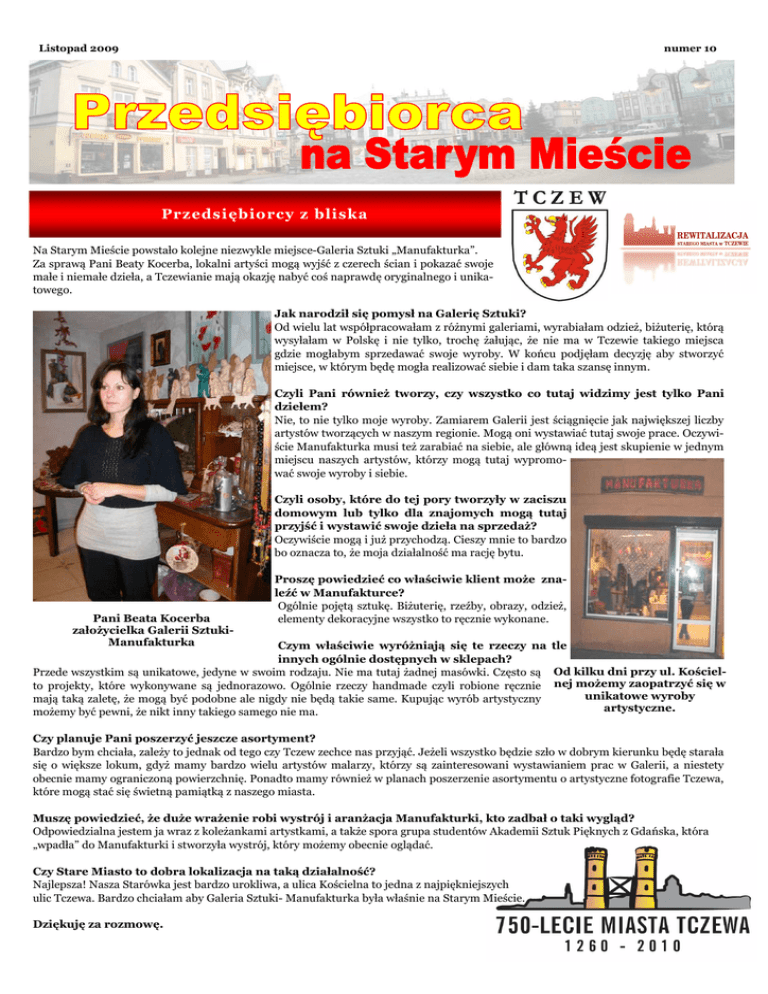 Listopad 2009 numer 10 Przedsiębiorcy z bliska Na Starym Mieście powstało kolejne niezwykle miejsce-Galeria Sztuki „Manufakturka”. Za sprawą Pani Beaty Kocerba, lokalni artyści mogą wyjść z czerech ścian i pokazać swoje małe i niemałe dzieła, a Tczewianie mają okazję nabyć coś naprawdę oryginalnego i unikatowego. Jak narodził się pomysł na Galerię Sztuki? Od wielu lat współpracowałam z różnymi galeriami, wyrabiałam odzież, biżuterię, którą wysyłałam w Polskę i nie tylko, trochę żałując, że nie ma w Tczewie takiego miejsca gdzie mogłabym sprzedawać swoje wyroby. W końcu podjęłam decyzję aby stworzyć miejsce, w którym będę mogła realizować siebie i dam taka szansę innym. Czyli Pani również tworzy, czy wszystko co tutaj widzimy jest tylko Pani dziełem? Nie, to nie tylko moje wyroby. Zamiarem Galerii jest ściągnięcie jak największej liczby artystów tworzących w naszym regionie. Mogą oni wystawiać tutaj swoje prace. Oczywiście Manufakturka musi też zarabiać na siebie, ale główną ideą jest skupienie w jednym miejscu naszych artystów, którzy mogą tutaj wypromować swoje wyroby i siebie. Czyli osoby, które do tej pory tworzyły w zaciszu domowym lub tylko dla znajomych mogą tutaj przyjść i wystawić swoje dzieła na sprzedaż? Oczywiście mogą i już przychodzą. Cieszy mnie to bardzo bo oznacza to, że moja działalność ma rację bytu. Pani Beata Kocerba założycielka Galerii SztukiManufakturka Proszę powiedzieć co właściwie klient może znaleźć w Manufakturce? Ogólnie pojętą sztukę. Biżuterię, rzeźby, obrazy, odzież, elementy dekoracyjne wszystko to ręcznie wykonane. Czym właściwie wyróżniają się te rzeczy na tle innych ogólnie dostępnych w sklepach? Przede wszystkim są unikatowe, jedyne w swoim rodzaju. Nie ma tutaj żadnej masówki. Często są Od kilku dni przy ul. Kościelto projekty, które wykonywane są jednorazowo. Ogólnie rzeczy handmade czyli robione ręcznie nej możemy zaopatrzyć się w unikatowe wyroby mają taką zaletę, że mogą być podobne ale nigdy nie będą takie same. Kupując wyrób artystyczny artystyczne. możemy być pewni, że nikt inny takiego samego nie ma. Czy planuje Pani poszerzyć jeszcze asortyment? Bardzo bym chciała, zależy to jednak od tego czy Tczew zechce nas przyjąć. Jeżeli wszystko będzie szło w dobrym kierunku będę starała się o większe lokum, gdyż mamy bardzo wielu artystów malarzy, którzy są zainteresowani wystawianiem prac w Galerii, a niestety obecnie mamy ograniczoną powierzchnię. Ponadto mamy również w planach poszerzenie asortymentu o artystyczne fotografie Tczewa, które mogą stać się świetną pamiątką z naszego miasta. Muszę powiedzieć, że duże wrażenie robi wystrój i aranżacja Manufakturki, kto zadbał o taki wygląd? Odpowiedzialna jestem ja wraz z koleżankami artystkami, a także spora grupa studentów Akademii Sztuk Pięknych z Gdańska, która „wpadła” do Manufakturki i stworzyła wystrój, który możemy obecnie oglądać. Czy Stare Miasto to dobra lokalizacja na taką działalność? Najlepsza! Nasza Starówka jest bardzo urokliwa, a ulica Kościelna to jedna z najpiękniejszych ulic Tczewa. Bardzo chciałam aby Galeria Sztuki- Manufakturka była właśnie na Starym Mieście. Dziękuję za rozmowę. Kalendarium imprez na Starym Mieście Listopad 2009 W grudnia Stare Miasto rozbłyśnie Już kilka tygodni przed Bożym Narodzeniem mieszkańcy i odwiedzający Stare Miasto poczują świąteczny nastrój. Cały Plac Hallera i dochodzące do niego uliczki będą przepięknie oświetlone, a to za sprawą świątecznych dekoracji. Właściciele sklepów mają jeszcze trochę czasu aby przygotować swoje placówki handlowe na ten najbardziej „gorący" okres w całym roku handlowym. Warto zastanowić się nad wystrojem świątecznym na zewnątrz i wewnątrz sklepu oraz doborem asortymentu w sklepie. Dobrze dobrany wystrój z pew- Już w grudniu Stare Miasto rozbłyśnie kolorowymi światełkami, nością przyciągnie uwagę klientów upiększającymi okolice. oraz zachęci do wejścia do sklepu, a także wyróżni go z otoczenia. Świąteczna aranżacja wystaw sklepowych (choinki, lampki) wraz z udekorowanymi ulicami stworzą niepowtarzalny nastrój, sprzyjający nie tylko spacerom ale również nadchodzącemu „zakupowemu szaleństwu”. Kiedy? Co? Gdzie? 4 Zaduszki pamięci Mieczysława Izydorka "Lekcja pt. 2 X M" CWRDW 6.11-13.12 Wystawa Stanisława Ignacego Witkiewicza Centrum Kultury i Sztuki 7 6 edycja Tczewskiego Konkursu Twórczości CKiS 7 Koncert Renaty Przemyk & Akustik Trio CKiS 7 Uliczny Bieg Sambora TCSiR 8 Premiera próby czytanej sztuki "Trup" Barbary Świąder CWRDW 10 10-lecie „Bramy” z Marianem Opanią CKiS 11 Koncert na Dzień Niepodległości CKiS 13-14 Ogólnopolski zjazd dzieł Kolpinga CKiS 15 Koncert Żanny Biczewskiej CKiS 16 Konferencja "Współtwórcy i liderzy Komitetów Obywatelskich na Pomorzu w latach 1989 - 1990" Miejska Biblioteka Publiczna 16 Publiczna debata na temat budżetu miasta na 2010 rok Urząd Miejski 17 Spotkanie z Jackiem Dehnelem Miejska Biblioteka Publiczna 18 25-lecie Marka Wróbla CWRDW 26 Szkolenie dla przewodników PTTK CWRDW 27.1118.12 Plecionkarskim szlakiem Wisły-wystawa i warsztaty Muzeum Wisły 28 Gala piosenki CKiS Wigilia Miejska W niedzielę 20 grudnia zapraszamy do tradycyjnego świątecznego poczęstunku, śpiewania kolęd, łamania się opłatkiem i składania życzeń podczas corocznej Miejskiej Wigilii. Spotkanie w Parku Kopernika rozpocznie się o godz. 15.00 od tradycyjnych życzeń i błogosławieństwa biskupa diecezjalnego. Uczestnicy, którzy przyjdą już o godz. 15.00 otrzymają upominek w postaci specjalnie przygotowanych śpiewników. Przewidziane są również atrakcje dla dzieci-żywy żłóbek, jasełka. Nie zabraknie występów chórów, zespołów wokalnych. Przewidziano również poczęstunek dla uczestników