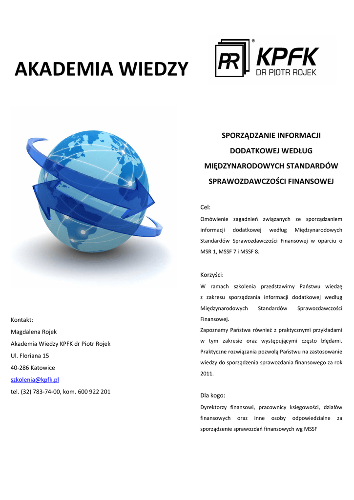 AKADEMIA WIEDZY SPORZĄDZANIE INFORMACJI DODATKOWEJ WEDŁUG MIĘDZYNARODOWYCH STANDARDÓW SPRAWOZDAWCZOŚCI FINANSOWEJ Cel: Omówienie zagadnień związanych ze sporządzaniem informacji dodatkowej według Międzynarodowych Standardów Sprawozdawczości Finansowej w oparciu o MSR 1, MSSF 7 i MSSF 8. Korzyści: W ramach szkolenia przedstawimy Państwu wiedzę z zakresu sporządzania informacji dodatkowej według Międzynarodowych Standardów Sprawozdawczości Kontakt: Finansowej. Magdalena Rojek Zapoznamy Państwa również z praktycznymi przykładami Akademia Wiedzy KPFK dr Piotr Rojek w tym zakresie oraz występującymi często błędami. Ul. Floriana 15 40-286 Katowice [email protected] tel. (32) 783-74-00, kom. 600 922 201 Praktyczne rozwiązania pozwolą Państwu na zastosowanie wiedzy do sporządzenia sprawozdania finansowego za rok 2011. Dla kogo: Dyrektorzy finansowi, pracownicy księgowości, działów finansowych oraz inne osoby odpowiedzialne sporządzenie sprawozdań finansowych wg MSSF za Program szkolenia: 1. Prezentacja sprawozdań finansowych – MSR 1 · podstawowe definicje, · zawartość informacji dodatkowej w sprawozdaniach finansowych, · ujawnianie ogólnych informacji dotyczących podmiotu sprawozdawczego i sprawozdania finansowego, · prezentacja szczegółowych pozycji sprawozdania z sytuacji finansowej, sprawozdania z całkowitych dochodów oraz zestawienia zmian w kapitale własnym, · ujawnianie przyjętych zasad rachunkowości, · ujawnianie przyczyn niepewności dotyczących wielkości szacunkowych, · ujawnianie informacji na temat kapitału własnego, · pozostałe ujawnienia informacji. 2. Instrumenty finansowe: ujawnianie informacji – MSSF 7 · podstawowe definicje, · ujawnienia informacji dotyczących istotności wpływu instrumentów finansowych na sytuację finansową i wynik działalności, · ujawnienia informacji dotyczących charakteru i zakresu ryzyka związanego z instrumentami finansowymi. 3. Segmenty operacyjne – MSSF 8 · określenie segmentów operacyjnych, · określenie segmentów sprawozdawczych, · ogólne ujawnienia dotyczące segmentów operacyjnych, · ujawnienia informacji o zyskach lub stratach segmentów oraz ich aktywach i zobowiązaniach, · ujawnienia informacji dotyczących sposobów pomiaru zysków lub strat segmentów oraz ustalania wartości ich aktywów i zobowiązań, · ujawnienia informacji dotyczących podmiotu sprawozdawczego jako całości, · ujawnienia informacji dotyczących segmentów operacyjnych w sprawozdaniach śródrocznych. Prowadzący: Anna Kazirod - Biegły rewident – Partner w KPFK dr Piotr Rojek. Absolwentka Akademii Ekonomicznej im. Karola Adamieckiego w Katowicach. Stypendystka Funduszu Know-How w University of the West of England Bristol w Wielkiej Brytanii. Uczestniczyła w pracach grupy roboczej auditingu w Europejskiej Federacji Księgowych FEE w Brukseli. Specjalizuje się w badaniu sprawozdań finansowych według przepisów prawa polskiego, Międzynarodowych Standardów Sprawozdawczości Finansowej oraz zasad grup kapitałowych. Prowadzi szkolenia z zakresu rachunkowości według przepisów prawa polskiego i Międzynarodowych Standardów Sprawozdawczości Finansowej. Materiały: Uczestnicy szkolenia otrzymają materiały szkoleniowe, które będą wykorzystywane w procesie dydaktycznym. Materiały zostały przygotowane przez wykładowców. Terminy szkoleń: Proponujemy Państwu termin szkolenia 12 października 2011. Miejsce szkolenia: Szkolenie odbędzie się w sali wykładowej w siedzibie KPFK dr Piotr Rojek znajdującej w Katowicach się przy ulicy Floriana 15. Godziny szkolenia: Szkolenie odbywać się będzie od 9 do 15.30. Koszt szkolenia: -390 zł +23% VAT dla jednej osoby - 220 zł +23% VAT dla jednej osoby dla obecnych Klientów KPFK dr Piotr Rojek - 320 zł +23% VAT dla jednej osoby dla Klientów, którzy współpracowali z KPFK dr Piotr Rojek w latach poprzednich - 300 zł +23% VAT dla jednej osoby w przypadku uczestnictwa, co najmniej dwóch osób z jednej firmy Cena obejmuje uczestnictwo w zajęciach, materiały szkoleniowe oraz poczęstunek. Zgłoszenie Przyjęcie zgłoszenia następuje z chwilą otrzymania przez nas wypełnionego formularza z nazwą firmy, numerem NIP oraz danymi personalnymi uczestnika szkolenia. Jest to równoznaczne z przyjęciem warunków oferty. Prosimy o przesłanie formularza zgłoszeniowego na adres mailowy: [email protected] lub listownie z dopiskiem szkolenia na adres: Floriana 15, 40-286 Katowice. Prosimy o przesłanie wypełnionego formularza do 6 października 2011 roku. Potwierdzenie Potwierdzenia zawierające informację o miejscu szkolenia oraz harmonogram zajęć, wysyłamy do uczestników szkolenia najpóźniej na 5 dni przed jego rozpoczęciem, na adres mailowy podany w zgłoszeniu. Jeżeli potwierdzenie ma zostać przesłane do innej niż podana jako uczestnik szkolenia osoby, prosimy zaznaczyć ten fakt w zgłoszeniu. Wpłata Prosimy o dokonanie wpłaty na 7 dni przed rozpoczęciem szkolenia na konto: BRE BANK S.A. 79 1140 1078 0000 4034 9400 1004 Odwołanie szkolenia KPFK dr Piotr Rojek Sp. z o.o. zastrzega sobie prawo do odwołania planowanego szkolenia z przyczyn od siebie niezależnych oraz w przypadku niewystarczającego zainteresowania terminem.