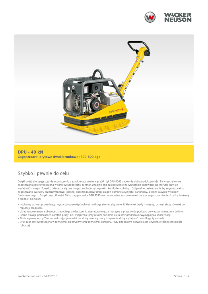 DPU - 40 kN Zagęszczarki płytowe dwukierunkowe (300-800 kg) Szybko i pewnie do celu Dzięki dużej sile zagęszczania w połączeniu z szybkim posuwem w przód i tył DPU 4045 zapewnia dużą produktywność. Ta wszechstronna zagęszczarka jest wyposażona w silnik wysokoprężny Yanmar, znajdzie ona zastosowanie na wszystkich budowach, na których liczy się wydajność maszyn. Ponadto odznacza się ona długą żywotnością i wysokim komfortem obsługi. Optymalne zastosowanie tej zagęszczarki to zagęszczanie warstwy przeciwmrozowej i nośnej podczas budowy dróg, ciągów komunikacyjnych i parkingów, a także zasypki wykopów fundamentowych. Dzięki częstotliwości 69 Hz zagęszczarka DPU 4545 ma uniwersalne zastosowanie i dobrze zagęszcza również kostkę brukową o średniej ciężkości. ● ● ● ● ● Intuicyjny uchwyt prowadzący: wystarczy przełożyć uchwyt na drugą stronę, aby zmienić kierunek jazdy maszyny, uchwyt służy również do regulacji prędkości. Układ rozpoznawania obecności zapobiega zakleszczeniu operatora między maszyną a przeszkodą podczas prowadzenia maszyny do tyłu. Liczne funkcje podnoszące komfort pracy: np. wyłączenie przy niskim poziomie oleju oraz prądnica niewymagająca konserwacji. Silnik wysokoprężny Yanmar o dużej pojemności ma dużą rezerwę mocy i zapewnia dużą wydajność oraz długą żywotność. DPU 4045 jest wyposażona w rozrusznik elektryczny oraz rozrusznik korbowy. Płyty dodatkowe pozwalają na uzyskanie różnej szerokości roboczej. wackerneuson.com – 04.03.2013 Strona : 1 / 4 DPU 4045 jest uruchamiana za pomocą kluczyka. Głośny dźwięk ostrzega przed niepotrzebnym wyładowaniem akumulatora. wackerneuson.com – 04.03.2013 Strona : 2 / 4 DPU - 40 kN Zagęszczarki płytowe dwukierunkowe (300-800 kg) Parametry techniczne DPU 4045Ye parametry eksploatacyjne ciężar roboczy 356 kg siła odśrodkowa 40 kN rozmiar płyty roboczej (B x L) 450 x 900 mm grubość płyty roboczej 12 mm wysokość (bez dyszla) 725 mm szerokość robocza (bez dodatkowej płyty) 460 mm szerokość robocza (z dodatkową płytą) 600 mm częstotliwość 69 Hz posuw do przodu maks. (w zależności od gruntu i od czynników zewnętrznych) 24 m/min wydajność powierzchniowa maks. (w zależności od gruntu i od czynników zewnętrznych) 864 m²/h parametry silnika typ silnika Silnik Diesla, jednocylindrowy, czterosuwowy, chłodzony powietrzem producent silnika Yanmar silnik L70N pojemność skokowa 320 cm³ moc silnika maks. (DIN ISO 3046) 4,9 kW przy prędkości obrotowej 3.600 1/min moc robocza maks. (DIN ISO 3046) 4,3 kW przy prędkości obrotowej 3.000 1/min zużycie paliwa napędowego 1,4 l/h pojemność baku (paliwo) 3,3 l transmisja siły Od silnika napędowego przez automatyczny napęd pasowy odśrodkowy i pas klinowy bezpośrednio do wzbudnicy typ paliwa napędowego Diesel wackerneuson.com – 04.03.2013 Strona : 3 / 4 Informacje na temat współpracujących akcesoriów są dostępne na naszej stronie internetowej. Z zastrzeżeniem zmian dla dobra ciągłego rozwoju. Szczegółowe informacje na temat wydajności silnika znajdują się w instrukcji obsługi. Rzeczywista moc urządzenia uwarunkowana jest konkretnymi warunkami eksploatacji. Informacje na temat współpracujących akcesoriów są dostępne na naszej stronie internetowej. Szczegółowe informacje na temat wydajności silnika znajdują się w instrukcji obsługi; rzeczywista moc urządzenia uwarunkowana jest konkretnymi warunkami eksploatacji. Z zastrzeżeniem zmian i pomyłek. Dotyczy również ilustracji. Copyright © 2013 Wacker Neuson SE. wackerneuson.com – 04.03.2013 Strona : 4 / 4