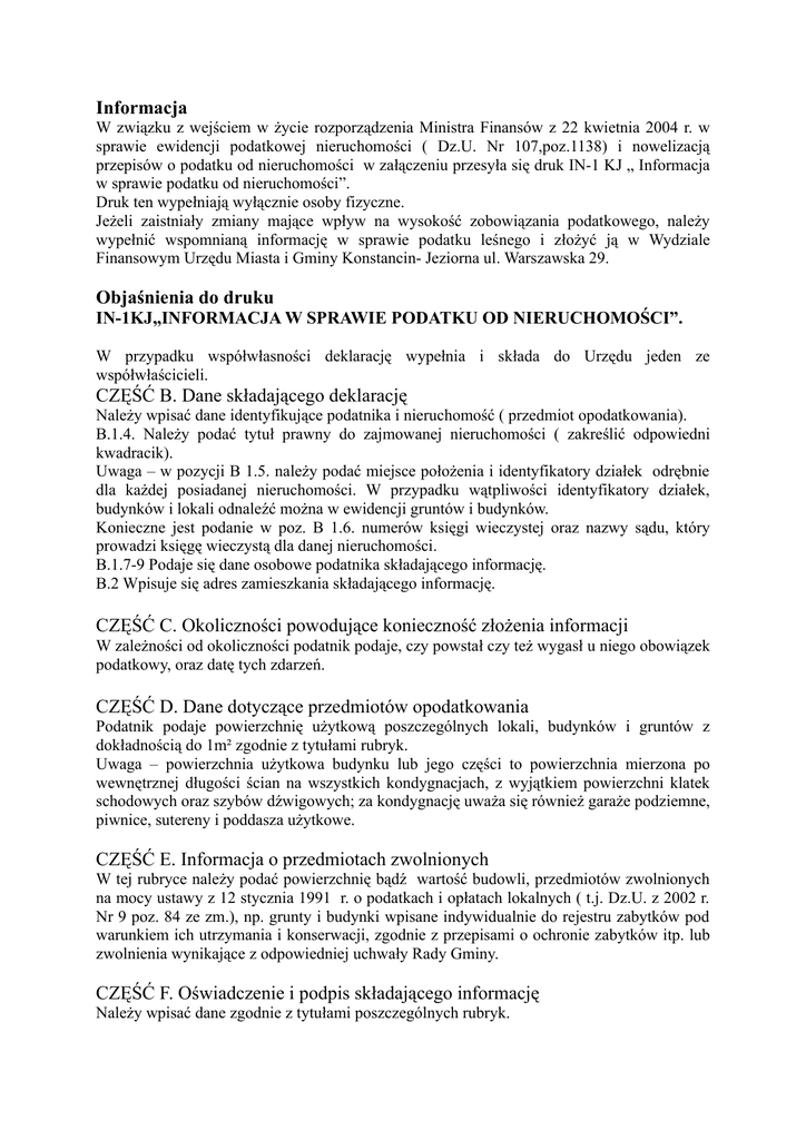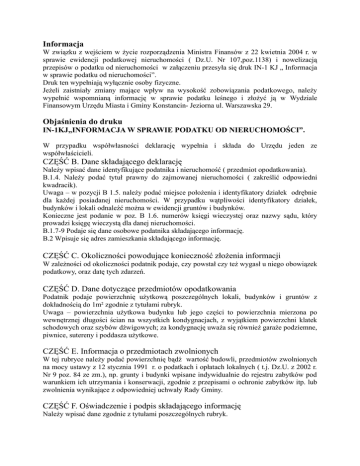 Informacja W związku z wejściem w życie rozporządzenia Ministra Finansów z 22 kwietnia 2004 r. w sprawie ewidencji podatkowej nieruchomości ( Dz.U. Nr 107,poz.1138) i nowelizacją przepisów o podatku od nieruchomości w załączeniu przesyła się druk IN-1 KJ „ Informacja w sprawie podatku od nieruchomości”. Druk ten wypełniają wyłącznie osoby fizyczne. Jeżeli zaistniały zmiany mające wpływ na wysokość zobowiązania podatkowego, należy wypełnić wspomnianą informację w sprawie podatku leśnego i złożyć ją w Wydziale Finansowym Urzędu Miasta i Gminy Konstancin- Jeziorna ul. Warszawska 29. Objaśnienia do druku IN-1KJ„INFORMACJA W SPRAWIE PODATKU OD NIERUCHOMOŚCI”. W przypadku współwłasności deklarację wypełnia i składa do Urzędu jeden ze współwłaścicieli. CZĘŚĆ B. Dane składającego deklarację Należy wpisać dane identyfikujące podatnika i nieruchomość ( przedmiot opodatkowania). B.1.4. Należy podać tytuł prawny do zajmowanej nieruchomości ( zakreślić odpowiedni kwadracik). Uwaga – w pozycji B 1.5. należy podać miejsce położenia i identyfikatory działek odrębnie dla każdej posiadanej nieruchomości. W przypadku wątpliwości identyfikatory działek, budynków i lokali odnaleźć można w ewidencji gruntów i budynków. Konieczne jest podanie w poz. B 1.6. numerów księgi wieczystej oraz nazwy sądu, który prowadzi księgę wieczystą dla danej nieruchomości. B.1.7-9 Podaje się dane osobowe podatnika składającego informację. B.2 Wpisuje się adres zamieszkania składającego informację. CZĘŚĆ C. Okoliczności powodujące konieczność złożenia informacji W zależności od okoliczności podatnik podaje, czy powstał czy też wygasł u niego obowiązek podatkowy, oraz datę tych zdarzeń. CZĘŚĆ D. Dane dotyczące przedmiotów opodatkowania Podatnik podaje powierzchnię użytkową poszczególnych lokali, budynków i gruntów z dokładnością do 1m² zgodnie z tytułami rubryk. Uwaga – powierzchnia użytkowa budynku lub jego części to powierzchnia mierzona po wewnętrznej długości ścian na wszystkich kondygnacjach, z wyjątkiem powierzchni klatek schodowych oraz szybów dźwigowych; za kondygnację uważa się również garaże podziemne, piwnice, sutereny i poddasza użytkowe. CZĘŚĆ E. Informacja o przedmiotach zwolnionych W tej rubryce należy podać powierzchnię bądź wartość budowli, przedmiotów zwolnionych na mocy ustawy z 12 stycznia 1991 r. o podatkach i opłatach lokalnych ( t.j. Dz.U. z 2002 r. Nr 9 poz. 84 ze zm.), np. grunty i budynki wpisane indywidualnie do rejestru zabytków pod warunkiem ich utrzymania i konserwacji, zgodnie z przepisami o ochronie zabytków itp. lub zwolnienia wynikające z odpowiedniej uchwały Rady Gminy. CZĘŚĆ F. Oświadczenie i podpis składającego informację Należy wpisać dane zgodnie z tytułami poszczególnych rubryk.