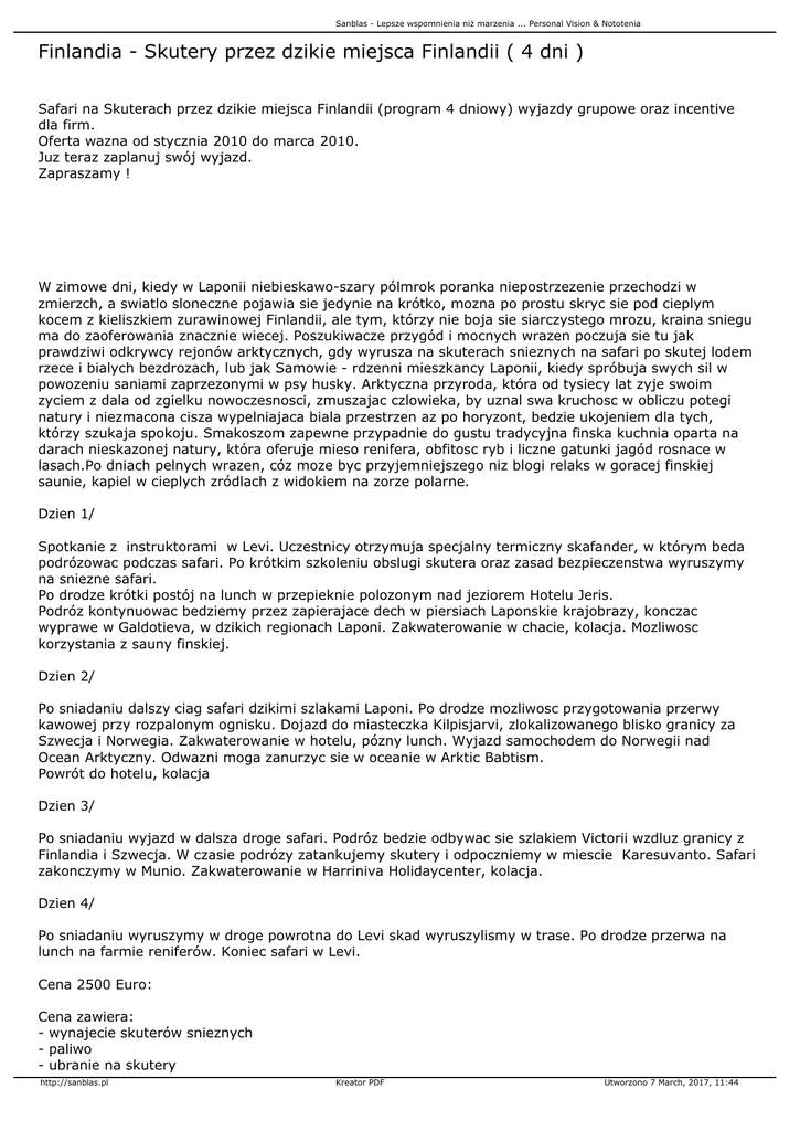Sanblas - Lepsze wspomnienia niż marzenia ... Personal Vision & Nototenia Finlandia - Skutery przez dzikie miejsca Finlandii ( 4 dni ) Safari na Skuterach przez dzikie miejsca Finlandii (program 4 dniowy) wyjazdy grupowe oraz incentive dla firm. Oferta wazna od stycznia 2010 do marca 2010. Juz teraz zaplanuj swój wyjazd. Zapraszamy ! W zimowe dni, kiedy w Laponii niebieskawo-szary pólmrok poranka niepostrzezenie przechodzi w zmierzch, a swiatlo sloneczne pojawia sie jedynie na krótko, mozna po prostu skryc sie pod cieplym kocem z kieliszkiem zurawinowej Finlandii, ale tym, którzy nie boja sie siarczystego mrozu, kraina sniegu ma do zaoferowania znacznie wiecej. Poszukiwacze przygód i mocnych wrazen poczuja sie tu jak prawdziwi odkrywcy rejonów arktycznych, gdy wyrusza na skuterach snieznych na safari po skutej lodem rzece i bialych bezdrozach, lub jak Samowie - rdzenni mieszkancy Laponii, kiedy spróbuja swych sil w powozeniu saniami zaprzezonymi w psy husky. Arktyczna przyroda, która od tysiecy lat zyje swoim zyciem z dala od zgielku nowoczesnosci, zmuszajac czlowieka, by uznal swa kruchosc w obliczu potegi natury i niezmacona cisza wypelniajaca biala przestrzen az po horyzont, bedzie ukojeniem dla tych, którzy szukaja spokoju. Smakoszom zapewne przypadnie do gustu tradycyjna finska kuchnia oparta na darach nieskazonej natury, która oferuje mieso renifera, obfitosc ryb i liczne gatunki jagód rosnace w lasach.Po dniach pelnych wrazen, cóz moze byc przyjemniejszego niz blogi relaks w goracej finskiej saunie, kapiel w cieplych zródlach z widokiem na zorze polarne. Dzien 1/ Spotkanie z instruktorami w Levi. Uczestnicy otrzymuja specjalny termiczny skafander, w którym beda podrózowac podczas safari. Po krótkim szkoleniu obslugi skutera oraz zasad bezpieczenstwa wyruszymy na sniezne safari. Po drodze krótki postój na lunch w przepieknie polozonym nad jeziorem Hotelu Jeris. Podróz kontynuowac bedziemy przez zapierajace dech w piersiach Laponskie krajobrazy, konczac wyprawe w Galdotieva, w dzikich regionach Laponi. Zakwaterowanie w chacie, kolacja. Mozliwosc korzystania z sauny finskiej. Dzien 2/ Po sniadaniu dalszy ciag safari dzikimi szlakami Laponi. Po drodze mozliwosc przygotowania przerwy kawowej przy rozpalonym ognisku. Dojazd do miasteczka Kilpisjarvi, zlokalizowanego blisko granicy za Szwecja i Norwegia. Zakwaterowanie w hotelu, pózny lunch. Wyjazd samochodem do Norwegii nad Ocean Arktyczny. Odwazni moga zanurzyc sie w oceanie w Arktic Babtism. Powrót do hotelu, kolacja Dzien 3/ Po sniadaniu wyjazd w dalsza droge safari. Podróz bedzie odbywac sie szlakiem Victorii wzdluz granicy z Finlandia i Szwecja. W czasie podrózy zatankujemy skutery i odpoczniemy w miescie Karesuvanto. Safari zakonczymy w Munio. Zakwaterowanie w Harriniva Holidaycenter, kolacja. Dzien 4/ Po sniadaniu wyruszymy w droge powrotna do Levi skad wyruszylismy w trase. Po drodze przerwa na lunch na farmie reniferów. Koniec safari w Levi. Cena 2500 Euro: Cena zawiera: - wynajecie skuterów snieznych - paliwo - ubranie na skutery http://sanblas.pl Kreator PDF Utworzono 7 March, 2017, 11:44 Sanblas - Lepsze wspomnienia niż marzenia ... Personal Vision & Nototenia - ubezpieczenie przewodnik wyzywienie zakwaterowanie przygotowanie trasy Cena nie zawiera: - biletu lotniczego http://sanblas.pl Kreator PDF Utworzono 7 March, 2017, 11:44