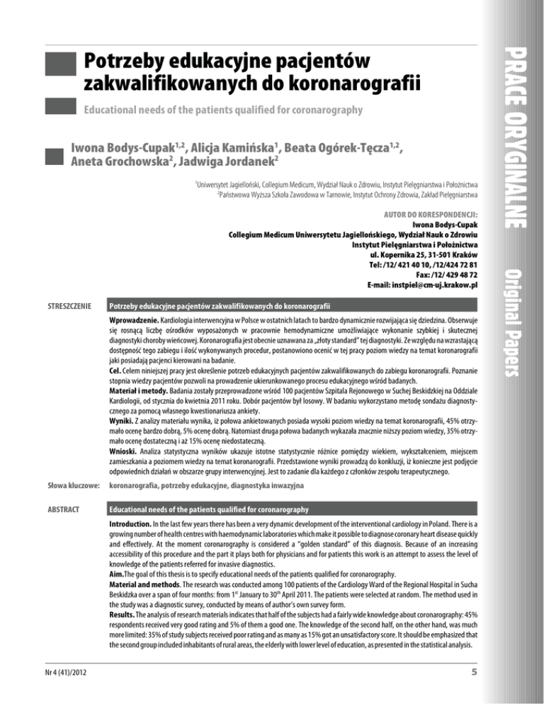 Potrzeby edukacyjne pacjentów zakwalifikowanych do koronarografii Educational needs of the patients qualified for coronarography Iwona Bodys-Cupak1,2, Alicja Kamińska1, Beata Ogórek-Tęcza1,2, Aneta Grochowska2, Jadwiga Jordanek2 1 Uniwersytet Jagielloński, Collegium Medicum, Wydział Nauk o Zdrowiu, Instytut Pielęgniarstwa i Położnictwa 2 Państwowa Wyższa Szkoła Zawodowa w Tarnowie, Instytut Ochrony Zdrowia, Zakład Pielęgniarstwa AUTOR DO KORESPONDENCJI: Iwona Bodys-Cupak Collegium Medicum Uniwersytetu Jagiellońskiego, Wydział Nauk o Zdrowiu Instytut Pielęgniarstwa i Położnictwa ul. Kopernika 25, 31-501 Kraków Tel: /12/ 421 40 10, /12/424 72 81 Fax: /12/ 429 48 72 E-mail: [email protected] STRESZCZENIE Potrzeby edukacyjne pacjentów zakwalifikowanych do koronarografii Wprowadzenie. Kardiologia interwencyjna w Polsce w ostatnich latach to bardzo dynamicznie rozwijająca się dziedzina. Obserwuje się rosnącą liczbę ośrodków wyposażonych w pracownie hemodynamiczne umożliwiające wykonanie szybkiej i skutecznej diagnostyki choroby wieńcowej. Koronarografia jest obecnie uznawana za „złoty standard” tej diagnostyki. Ze względu na wzrastającą dostępność tego zabiegu i ilość wykonywanych procedur, postanowiono ocenić w tej pracy poziom wiedzy na temat koronarografii jaki posiadają pacjenci kierowani na badanie. Cel. Celem niniejszej pracy jest określenie potrzeb edukacyjnych pacjentów zakwalifikowanych do zabiegu koronarografii. Poznanie stopnia wiedzy pacjentów pozwoli na prowadzenie ukierunkowanego procesu edukacyjnego wśród badanych. Materiał i metody. Badania zostały przeprowadzone wśród 100 pacjentów Szpitala Rejonowego w Suchej Beskidzkiej na Oddziale Kardiologii, od stycznia do kwietnia 2011 roku. Dobór pacjentów był losowy. W badaniu wykorzystano metodę sondażu diagnostycznego za pomocą własnego kwestionariusza ankiety. Wyniki. Z analizy materiału wynika, iż połowa ankietowanych posiada wysoki poziom wiedzy na temat koronarografii, 45% otrzymało ocenę bardzo dobrą, 5% ocenę dobrą. Natomiast druga połowa badanych wykazała znacznie niższy poziom wiedzy, 35% otrzymało ocenę dostateczną i aż 15% ocenę niedostateczną. Wnioski. Analiza statystyczna wyników ukazuje istotne statystycznie różnice pomiędzy wiekiem, wykształceniem, miejscem zamieszkania a poziomem wiedzy na temat koronarografii. Przedstawione wyniki prowadzą do konkluzji, iż konieczne jest podjęcie odpowiednich działań w obszarze grupy interwencyjnej. Jest to zadanie dla każdego z członków zespołu terapeutycznego. Słowa kluczowe: koronarografia, potrzeby edukacyjne, diagnostyka inwazyjna ABSTRACT Educational needs of the patients qualified for coronarography Introduction. In the last few years there has been a very dynamic development of the interventional cardiology in Poland. There is a growing number of health centres with haemodynamic laboratories which make it possible to diagnose coronary heart disease quickly and effectively. At the moment coronarography is considered a “golden standard” of this diagnosis. Because of an increasing accessibility of this procedure and the part it plays both for physicians and for patients this work is an attempt to assess the level of knowledge of the patients referred for invasive diagnostics. Aim.The goal of this thesis is to specify educational needs of the patients qualified for coronarography. Material and methods. The research was conducted among 100 patients of the Cardiology Ward of the Regional Hospital in Sucha Beskidzka over a span of four months: from 1st January to 30th April 2011. The patients were selected at random. The method used in the study was a diagnostic survey, conducted by means of author’s own survey form. Results. The analysis of research materials indicates that half of the subjects had a fairly wide knowledge about coronarography: 45% respondents received very good rating and 5% of them a good one. The knowledge of the second half, on the other hand, was much more limited: 35% of study subjects received poor rating and as many as 15% got an unsatisfactory score. It should be emphasized that the second group included inhabitants of rural areas, the elderly with lower level of education, as presented in the statistical analysis. Nr 4 (41)/2012 5 Potrzeby edukacyjne pacjentów zakwalifikowanych do koronarografii Conclusions. Statistical analysis of the results shows statistically significant differences between age, education, place of residence and the knowledge about coronarography. Presented results lead to a conclusion about the necessity to initiate appropriate activities in relation to the intervention group. This is the task of all the members of each therapeutic group. Keywords: coronarography, educational needs, invasive diagnostics WPROWADZENIE W ostatnich latach obserwuje się dynamiczny rozwój współczesnej medycyny. Mimo tego choroby układu krążenia są nadal jednym z głównych problemów zdrowotnych krajów wysokorozwiniętych. Główną siłą napędową stała się kardiologia interwencyjna pozwalająca na coraz lepsze i skuteczniejsze leczenie chorób układu krążenia. W ciągu ostatnich 30 lat kardiologia stała się najaktywniejszą dyscypliną nauk medycznych m.in. dzięki wprowadzeniu do praktyki klinicznej wielu osiągnięć technicznych, z których kardiologia interwencyjna skorzystała najwięcej. Obecnie każdy nowoczesny ośrodek kardiologiczny wyposażony jest w pracownię hemodynamiczną umożliwiającą szybką diagnostykę inwazyjną. Już od około 50 lat referencyjną metodą diagnostyczną w schorzeniach układu krążenia jest angiografia naczyń wieńcowych, zwana koronarografią [1]. Stanowi ona obecnie złoty standard w rozpoznawaniu choroby wieńcowej, ma istotne znaczenie nie tylko diagnostyczne, ale jest również pomocna w ocenie ryzyka, oraz wyborze strategii terapeutycznej. Koronarografia jest radiologicznym zabiegiem dia