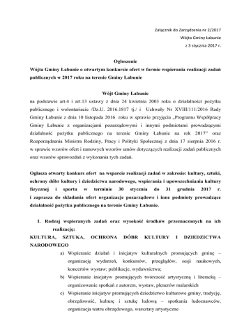 Załącznik do Zarządzenia nr 2/2017 Wójta Gminy Łabunie z 3 stycznia 2017 r. Ogłoszenie Wójta Gminy Łabunie o otwartym konkursie ofert w formie wspierania realizacji zadań publicznych w 2017 roku na terenie Gminy Łabunie Wójt Gminy Łabunie na podstawie art.4 i art.13 ustawy z dnia 24 kwietnia 2003 roku o działalności pożytku publicznego i wolontariacie /Dz.U. 2016.1817 tj./ i Uchwały Nr XVIII/111/2016 Rady Gminy Łabunie z dnia 10 listopada 2016 roku w sprawie przyjęcia „Programu Współpracy Gminy Łabunie z organizacjami pozarządowymi i innymi podmiotami prowadzącymi działalność pożytku publicznego na terenie Gminy Łabunie na rok 2017” oraz Rozporządzenia Ministra Rodziny, Pracy i Polityki Społecznej z dnia 17 sierpnia 2016 r. w sprawie wzorów ofert i ramowych wzorów umów dotyczących realizacji zadań publicznych oraz wzorów sprawozdań z wykonania tych zadań. Ogłasza otwarty konkurs ofert na wsparcie realizacji zadań w zakresie: kultury, sztuki, ochrony dóbr kultury i dziedzictwa narodowego, wspierania i upowszechniania kultury fizycznej i sportu w terminie 30 stycznia do 31 grudnia 2017 r. i zaprasza do składania ofert organizacje pozarządowe i inne podmioty prowadzące działalność pożytku publicznego na terenie Gminy Łabunie. I. Rodzaj wspieranych zadań oraz wysokość środków przeznaczonych na ich realizację: KULTURA, SZTUKA, OCHRONA DÓBR KULTURY I DZIEDZICTWA NARODOWEGO a) Wspieranie działań i inicjatyw kulturalnych promujących gminę – organizację wydarzeń, konkursów, przeglądów, sesji naukowych, koncertów wystaw; publikacje, wydawnictwa; b) Wspieranie inicjatyw promujących twórczość artystyczną i literacką – organizowanie spotkań z autorem, wystaw, plenerów malarskich c) Wspieranie inicjatyw promujących dziedzictwo kulturowe gminy, tradycję, obrzędowość, kulturę i sztukę ludową – spotkania ludoznawców, organizacja teatru obrzędowego, warsztaty artystyczne Na wsparcie realizacji zadania Wójt Gminy zaplanował dotację w wysokości 3.000 zł (słownie: trzy tysiące złotych). W ubiegłym roku przeznaczono kwotę 1.500 zł. WSPIERANIE I UPOWSZECHNIANIE KULTURY FIZYCZNEJ I SPORTU a) Upowszechnianie kultury fizycznej wśród dzieci i młodzieży poprzez prowadzenie zajęć w różnych dyscyplinach sportu; b) Organizowanie imprez sportowych i sportowo- rekreacyjnych o zasięgu gminnym, powiatowym, wojewódzkim; c) Wspieranie udziału gminnych reprezentacji w imprezach i zawodach sportowych o zasięgu ponadgminnym, utrzymanie zaplecza szkoleniowego sekcji piłki nożnej; d) Propagowanie wychowania zdrowotnego, aktywnego wypoczynku i zdrowego stylu życia; Na wsparcie realizacji zadania Wójt Gminy zaplanował dotację w wysokości 60.000 zł (słownie: sześćdziesiąt tysięcy złotych). W 2016 r. przeznaczono kwotę 55.000 zł. II. Zasady przyznawania dotacji: 1. Podmiotami uprawnionymi do złożenia ofert są organizacje pozarządowe i inne podmioty prowadzące działalność pożytku publicznego w rozumieniu Ustawy z dnia 24 kwietnia 2003 r. o działalności pożytku publicznego i o wolontariacie /Dz.U. 2016.1817 tj./. 2. Złożenie oferty nie jest równoznaczne z przyznaniem dotacji lub przyznaniem dotacji w oczekiwanej wysokości. Kwota przyznanej dotacji może być niższa od określonej w ofercie. W takim przypadku oferent zobowiązany jest do przedstawienia korekty kosztorysu i harmonogramu realizacji zadania w terminie 14 dni od dnia ogłoszenia o rozstrzygnięciu konkursu ofert. 3. Dopuszcza się możliwość realizacji zadania przez więcej niż jednego oferenta (oferta wspólna). 4. Przewidywana dotacja nie może być wykorzystana na nagrody pieniężne. 5. Warunkiem przekazania dotacji jest zawarcie pisemnej umowy z podmiotem, wyłonionym w drodze postępowania konkursowego według wzoru określonego w Rozporządzenia Ministra Rodziny, Pracy i Polityki Społecznej z dnia 17 sierpnia 2016 r. w sprawie wzorów ofert i ramowych wzorów umów dotyczących realizacji zadań publicznych oraz wzorów sprawozdań z wykonania tych zadań /Dz.U.2016.1300/. 6. Gmina Łabunie może odmówić podmiotowi wyłonionemu w konkursie podpisania umowy, gdy przed jej podpisaniem ujawnione zostaną nieznane wcześniej okoliczności podważające wiarygodność merytoryczną i finansową oferenta. 7. Oferent na realizację zadania zobowiązany jest zabezpieczyć własne środki finansowe w wysokości nie mniej niż 5 % całkowitych kosztów zadania. 8. W konkursie ofert mogą brać udział podmioty prowadzące działalność na rzecz mieszkańców Gminy Łabunie (bez względu na ich siedzibę). III. Termin i warunki realizacji projektów 1.Termin realizacji zadań określa się na okres od 30 stycznia do 31 grudnia 2017 r. 2. Zadanie winno być realizowane z najwyższą starannością, zgodnie z zawartą umową oraz obowiązującymi standardami i przepisami w zakresie opisanym w ofercie. 3. Oferent jest zobowiązany do sporządzania i składania sprawozdań z wykonania zadania publicznego w terminie określonym w umowie. 4. Oferent realizując zadanie zlecone jest zobowiązany do opracowania regulaminów i komunikatów z przeprowadzonych inicjatyw, działań, imprez sportowo- rekreacyjnych i przekazywania ich do Referatu Promocji, Kultury, Sportu i Informacji UG Łabunie w terminie 3 dni od ich realizacji. 5. Koszty, uwzględnione w kosztorysie zadania finansowane z dotacji, mogą być realizowane po zawarciu umowy. 6. Wymagane dokumenty: oferta realizacji zadania publicznego powinna być wypełniona według wzoru ofert, który określa załącznik nr 1 do Rozporządzenia Ministra Rodziny, Pracy i Polityki Społecznej z dnia 17 VIII 2016 r. w sprawie wzorów ofert i ramowych wzorów umów dotyczących realizacji zadań publicznych oraz wzorów sprawozdań z wykonania tych zadań /Dz.U.2016.1300/. załączniki do oferty: - aktualny statut oferenta, jeżeli przystępuje do konkursu po raz pierwszy; - w przypadku 