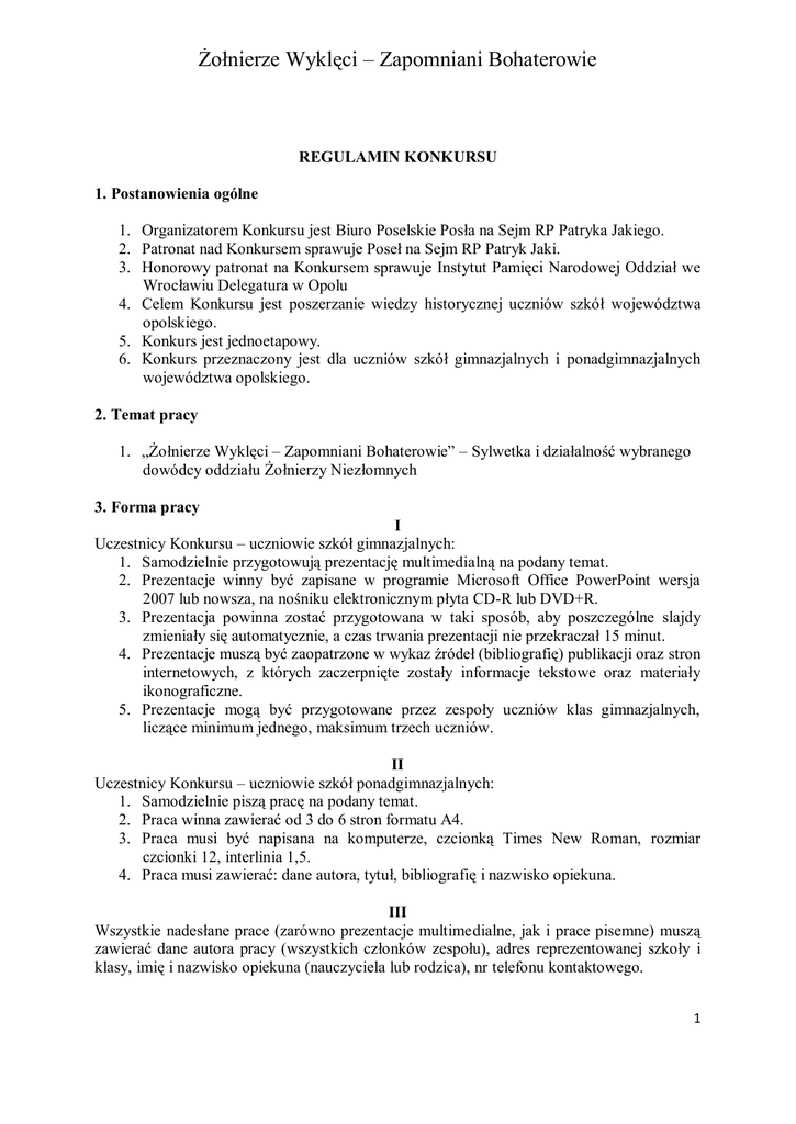 Żołnierze Wyklęci – Zapomniani Bohaterowie REGULAMIN KONKURSU 1. Postanowienia ogólne 1. Organizatorem Konkursu jest Biuro Poselskie Posła na Sejm RP Patryka Jakiego. 2. Patronat nad Konkursem sprawuje Poseł na Sejm RP Patryk Jaki. 3. Honorowy patronat na Konkursem sprawuje Instytut Pamięci Narodowej Oddział we Wrocławiu Delegatura w Opolu 4. Celem Konkursu jest poszerzanie wiedzy historycznej uczniów szkół województwa opolskiego. 5. Konkurs jest jednoetapowy. 6. Konkurs przeznaczony jest dla uczniów szkół gimnazjalnych i ponadgimnazjalnych województwa opolskiego. 2. Temat pracy 1. „Żołnierze Wyklęci – Zapomniani Bohaterowie” – Sylwetka i działalność wybranego dowódcy oddziału Żołnierzy Niezłomnych 3. Forma pracy I Uczestnicy Konkursu – uczniowie szkół gimnazjalnych: 1. Samodzielnie przygotowują prezentację multimedialną na podany temat. 2. Prezentacje winny być zapisane w programie Microsoft Office PowerPoint wersja 2007 lub nowsza, na nośniku elektronicznym płyta CD-R lub DVD+R. 3. Prezentacja powinna zostać przygotowana w taki sposób, aby poszczególne slajdy zmieniały się automatycznie, a czas trwania prezentacji nie przekraczał 15 minut. 4. Prezentacje muszą być zaopatrzone w wykaz źródeł (bibliografię) publikacji oraz stron internetowych, z których zaczerpnięte zostały informacje tekstowe oraz materiały ikonograficzne. 5. Prezentacje mogą być przygotowane przez zespoły uczniów klas gimnazjalnych, liczące minimum jednego, maksimum trzech uczniów. II Uczestnicy Konkursu – uczniowie szkół ponadgimnazjalnych: 1. Samodzielnie piszą pracę na podany temat. 2. Praca winna zawierać od 3 do 6 stron formatu A4. 3. Praca musi być napisana na komputerze, czcionką Times New Roman, rozmiar czcionki 12, interlinia 1,5. 4. Praca musi zawierać: dane autora, tytuł, bibliografię i nazwisko opiekuna. III Wszystkie nadesłane prace (zarówno prezentacje multimedialne, jak i prace pisemne) muszą zawierać dane autora pracy (wszystkich członków zespołu), adres reprezentowanej szkoły i klasy, imię i nazwisko opiekuna (nauczyciela lub rodzica), nr telefonu kontaktowego. 1 Żołnierze Wyklęci – Zapomniani Bohaterowie 4. Laureaci Konkursu Komisja w składzie: dr Ksawery Jasiak, dr Mariusz Patelski, Arkadiusz Karbowiak wyłoni 3 (trzech) laureatów Konkursu w kategorii uczniów szkół gimnazjalnych i 3 (trzech) laureatów Konkursu w kategorii uczniów szkół ponadgimnazjalnych. Laureaci otrzymają nagrody rzeczowe (w przypadku zespołów nagrodę rzeczową otrzyma każdy członek zespołu). 5. Termin nadsyłania prac i rozstrzygnięcia Konkursu 1. Prace należy nadsyłać do dnia 12 maja 2014 roku na adres: Biuro Poselskie Posła na Sejm RP Patryka Jakiego, ul. Damrota 4/37, 45-064 Opole, z dopiskiem KONKURS. Decyduje data wpływu pracy do Biura Poselskiego, prace dostarczone po tym terminie nie będą brały udziału w Konkursie (nie decyduje data stempla pocztowego). 2. Uroczyste ogłoszenie wyników i wręczenie nagród nastąpi w terminie 4 (czterech) tygodni od dnia zakończenia Konkursu. 3. O dokładnym terminie ogłoszenia wyników i miejscu wręczenia nagród, laureaci zostaną powiadomienie telefonicznie. Laureatom, którzy nie będą mogli uczestniczyć w ogłoszeniu wyników, nagrody zostaną przesłane pocztą. 6. Postanowienia końcowe 1. Uczniowie biorący udział w Konkursie zobowiązani są dołączyć do zgłaszanej pracy pisemnej lub prezentacji multimedialnej oświadczenie potwierdzające zrzeczenie się praw autorskich na rzecz organizatorów (w przypadku osób niepełnoletnich podpisane przez rodziców, bądź nauczycieli) oraz zgodę na przetwarzanie danych osobowych na potrzeby Konkursu. 2. Prezentacje nadesłane na Konkurs nie będą zwracane ich autorom. 3. Prezentacje nadesłane na Konkurs przechodzą na własność organizatora z prawem do wykorzystania w celach edukacyjnych z każdorazowym podaniem danych (imię i nazwisko) ich autora/ów oraz szkoły, którą reprezentowali. 4. Nadesłanie pracy na Konkurs jest równoznaczne z akceptacją warunków regulaminu. Uroczyste ogłoszenie wyników i wręczenie nagród nastąpi w terminie 4 (czterech) tygodni od dnia zakończenia Konkursu. 2
