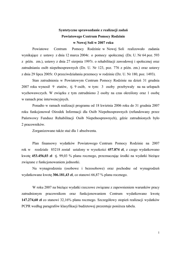 Syntetyczne sprawozdanie z realizacji zadań Powiatowego Centrum Pomocy Rodzinie w Nowej Soli w 2007 roku Powiatowe Centrum Pomocy Rodzinie w Nowej Soli realizowało zadania wynikające z ustawy z dnia 12 marca 2004r. o pomocy społecznej (Dz. U. Nr 64 poz. 593 z późn. zm.), ustawy z dnia 27 sierpnia 1997r. o rehabilitacji zawodowej i społecznej oraz zatrudnianiu osób niepełnosprawnych (Dz. U. Nr 123, poz. 776 z późn. zm.) oraz ustawy z dnia 29 lipca 2005r. O przeciwdziałaniu przemocy w rodzinie (Dz. U. Nr 180, poz. 1493). Stan zatrudnienia w Powiatowym Centrum Pomocy Rodzinie na dzień 31 grudnia 2007 roku wynosił 9 etatów, tj. 9 osób, w tym: 3 osoby przebywały na na urlopach wychowawczych. W związku z tym zatrudniono 2 osoby na czas określony oraz 1 osobę w ramach prac interwencyjnych. Ponadto w ramach realizacji programu od 18 kwietnia 2006 roku do 31 grudnia 2007 roku funkcjonował Ośrodek Informacji dla Osób Niepełnosprawnych (refundowany przez Państwowy Fundusz Rehabilitacji Osób Niepełnosprawnych), gdzie zatrudnionych było 2 pracowników. Zorganizowano także staż dla 1 absolwenta. Plan finansowy wydatków Powiatowego Centrum Pomocy Rodzinie na 2007 rok w rozdziale 85218 został ustalony w wysokości 457.874 zł, z czego wydatkowano kwotę 453.456,03 zł tj. 99,03 % planu rocznego, przeznaczając środki na wydatki bieżące związane z funkcjonowaniem jednostki. Na wynagrodzenia (osobowe i bezosobowe) oraz pochodne od wynagrodzeń wydatkowano kwotę 306.181,43 zł, co stanowi 66,87 % planu rocznego. W roku 2007 na bieżące wydatki rzeczowe związane z zapewnieniem warunków pracy zatrudnionym pracownikom oraz funkcjonowaniem Centrum wydatkowano kwotę 147.274,60 zł co stanowi 32,16% planu rocznego. Szczegółowy stopień realizacji wydatków PCPR według paragrafów klasyfikacji budżetowej prezentuje poniższa tabela. 1 Tabela 1 Wykonanie wydatków PCPR do dnia 31.12.2007r. (kwoty podane w zaokrągleniu do pełnych złotych) Klasyfikacja Nazwa 852-85218§3020 Wyd. osobowe nie zaliczane do wynagr. 852-85218§4010 Wynagrodzenia osobowe pracowników 852-85218§4040 Plan Wykonanie % Saldo 1 090 1 089,90 99,99 0,10 231 319 231 302,87 99,99 16,13 Dodatkowe wynagrodzenia roczne 11 521 11 520,56 99,99 0,44 852-85218§4110 Składki na ubezpieczenie społeczne 43 562 43 352,26 99,51 209,74 852-85218§4120 Składki na Fundusz Pracy 6 708 6 690,98 99,74 17,02 852-85218§4170 Wynagrodzenia bezosobowe 17 105 13 314,76 77,84 3 790,24 852-85218§4210 Zakup materiałów i wyposażenia 36 086 35 864,16 99,38 221,84 852-85218§4260 Zakup energii 10 865 10 864,52 99,99 0,48 852-85218§4270 Zakup usług remontowych 513 512,40 99,88 0,60 852-85218§4280 Zakup usług zdrowotnych 205 205 852-85218§4300 Zakup usług pozostałych 24 208 24 204,17 99,98 3,83 852-85218§4360 Opłaty za telefony komórkowe 1 123 1 099,71 97,92 23,29 852-85218§4370 Opłaty za telefony stacjonarne 7 955 7 954,52 99,99 0,48 852-85218§4410 Podróże służbowe 3 410 3 409,73 99,99 0,27 852-85218§4430 Różne opłaty i składki 177 176,97 99,98 0,03 852-85218§4440 Odpisy na ZFŚS 11 264 11 264 100 852-85218§4740 Papier ksero 2 565 2 564,69 99,98 0,31 852-85218§4750 Akcesoria komputerowe, programy, lic. 16 297 16 286,61 99,93 10,39 852-85218§6060 Wydatki na zakupy inwestycyjne 31 901 31 778,22 99,61 122,78 457 874 453 456,03 99,03 4 417,97 852-85218 RAZEM 100 0 0 Ponadto w roku 2007 Powiatowe Centrum Pomocy Rodzinie uzyskało dochody w wysokości 9.159,39 zł z tytułu częściowej refundacji wynagrodzeń osób zatrudnionych w ramach prac interwencyjnych. Powiatowe Centrum Pomocy Rodzinie posiada rachunek dochodów własnych. W roku 2007 na rachunku dochodów własnych uzyskano dochody w kwocie 71,64 zł (odsetki bankowe). Środków tych nie wydatkowano. Uwzględniając stan środków na dzień 1 stycznia 2007r. w kwocie 2.325,27 zł - stan środków na rachunku dochodów własnych na dzień 31 grudnia 2007r. wynosił 2.396,91 zł. Powiatowe Centrum Pomocy Rodzinie realizowało zadania w I półroczu 2007 roku w następującym zakresie: 1. Organizowanie opieki w rodzinach zastępczych W roku 2007r. pomocą objętych było 131 rodzin zastępczych, w których przebywało 2 łącznie 202 dzieci. I tak: – liczba rodzin zastępczych spokrewnionych – 106 z liczbą dzieci 143; – liczba rodzin zastępczych niespokrewnionych – 21 z liczbą dzieci 32; – liczba zawodowych rodzin zastępczych o charakterze pogotowia rodzinnego - 4 z liczbą dzieci 27. W 11 rodzinach zastępczych funkcjonujących na terenie powiatu nowosolskiego przebywało 20 dzieci pochodzących z terenów innych powiatów. W związku z powyższym zgodnie z zawartymi porozumieniami w sprawie finansowania kosztów pobytu dzieci, Powiat Nowosolski otrzymał dotacje od innych j.s.t. w kwocie 168.827 zł. Ponadto pomocą objęto 16 rodzin zastępczych z terenu innych powiatów, w których przebywało 23 dzieci pochodzących z powiatu nowosolskiego. Centrum na bieżąco pokrywało wydatki związane z utrzymaniem ww. małoletnich w rodzinach zastępczych na terenie innych powiatów w formie dotacji dla innych j.s.t. w łącznej wysokości – 224.687 zł - zgodnie z zawartymi porozumieniami. Łącznie w rozdziale „rodziny zastępcze” uzyskano dochody 168.827 zł, a wydatkowano kwotę 2.030.718 zł /w tym: usamodzielnienia/. Szczegółowo realizację zadania w ujęciu finansowym przedstawia Tabela 2. Tabela 2 Wykonanie wydatków i dochodów rok 2007 – rodziny zastępcze Wydatki Dochody Udzielone świadczenia – rodziny zastępcze spokrewnione i niespokrewnione Udzielone świadczenia – niespokrewnione z dzieckiem zawodowe rodziny zastępcze o charakterze pogotowia rodzinnego Udzielone świadczenia – pomoc pieniężna na kontynuowanie nauki Udzielone świadczenia – pomoc pieniężna na usamodzielnienie Udzielone świadczenia – pomoc na zagospodarowanie w formie rzeczowej Dotacje przekazane innym powiatom Dotacje z innych powi