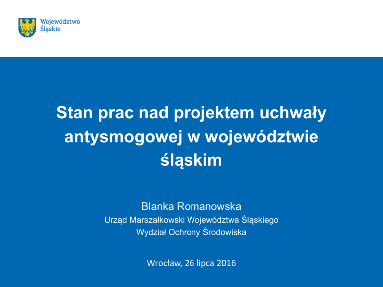 Stan prac nad projektem uchwały antysmogowej w województwie śląskim Blanka Romanowska Urząd Marszałkowski Województwa Śląskiego Wydział Ochrony Środowiska Wrocław, 26 lipca 2016 Plan prezentacji 1. Wprowadzenie 2. Ankietyzacja gmin województwa śląskiego w sprawie tzw. „uchwały antysmogowej” 3. Powołanie Zespołu roboczego ds. ograniczania niskiej emisji 4. Włączenie Województwa Śląskiego do projektu zintegrowanego LIFE 5. Stanowisko Konwentu Marszałków Województw RP Wprowadzenie 1. Marszałek Województwa Śląskiego wyraził wolę przygotowania tzw. „uchwały antysmogowej” 2. Uchwała ta powinna objąć teren całego województwa śląskiego (całe województwo jest objęte Programem Ochrony Powietrza) 3. Uchwała dla terenu całego województwa nie będzie wprowadzała zakazu stosowania paliw stałych Ankietyzacja gmin województwa śląskiego w sprawie tzw. „uchwały antysmogowej” Cel Głównym na temat celem ankietyzacji zainteresowania wprowadzeniem w drodze było gmin uchwały uzyskanie informacji województwa śląskiego Sejmiku Województwa ograniczeń lub zakazów w zakresie eksploatacji instalacji, w których następuje spalanie paliw (z zastrzeżeniem ust. 8 art. 96). Respondenci Dnia 30 listopada 2015 roku do wszystkich gmin województwa śląskiego została wystosowana ankieta dotycząca wdrożenia przepisów zmienionego art. 96 ustawą z dnia 10 września 2015 roku o zmianie ustawy Prawo ochrony środowiska. Odpowiedzi udzieliło 146 na 167 gmin województwa śląskiego (87 %). Wyniki Czy są Państwo zainteresowani wprowadzeniem w drodze uchwały Sejmiku Województwa ograniczeń zakazów lub w zakresie eksploatacji instalacji, w których następuje spalanie paliw (z zastrzeżeniem ust. 8 art. 96)? Liczba gmin 56 46 60 40 20 8 0 1 Tak Nie Tak, pod warunkiem Brak odpowiedzi Powołanie Zespołu roboczego ds. ograniczania niskiej emisji Marszałek Województwa Śląskiego Zarządzeniem nr 33/2016 z dnia 23 maja 2016 roku powołał Zespół roboczy ds. ograniczania niskiej emisji w województwie śląskim. 1. Cele Zespołu Powołuje się Zespół roboczy ds. ograniczania niskiej emisji w celu zapobieżenia negatywnemu oddziaływaniu na zdrowie ludzi i na środowisko. Zadaniem Zespołu jest wypracowanie wspólnego stanowiska i strategii różnych podmiotów dążących do ograniczania niskiej emisji w województwie śląskim. 2. Cele pośrednie Zespołu Stworzenie projektu uchwały, który będzie akceptowany przez gminy województwa i stronę społeczną Wypracowanie sposobów wdrażania uchwały przez jst Wypracowanie metod kontroli zapisów uchwały przez jst Edukacja ekologiczna w zakresie ograniczania niskiej emisji Wypracowanie rekomendacji do aktualizacji Programu ochrony powietrza 3. Skład Zespołu W skład Zespołu roboczego wchodzi 35 osób – przedstawicieli samorządów, instytucji naukowych, uczelni wyższych oraz administracji rządowej. W pracach uczestniczą także parlamentarzyści, przedstawiciele stowarzyszeń oraz fundacji związanych z ochroną środowiska. Swój wkład w przyszły program antysmogowy wnosi także Kościół Katolicki oraz Ewangelicki. 4. Grupy robocze Zespół roboczy ds. ograniczania niskiej emisji został podzielony na 3 grupy zadaniowe: Grupa Techniczna Grupa Edukacyjna Grupa Samorządowa Włączenie Województwa Śląskiego do projektu zintegrowanego LIFE 1. Partnerzy Projektu Województwo Małopolskie – partner koordynujący Województwo Śląskie Związek Gmin Dolnego Dorzecza Rzeki Raby Stowarzyszenie Krakowski Alarm Smogowy Krajowa Agencja Poszanowania Energii S.A. Instytut VITO z Belgii Słowacki Instytut Hydrometeorologiczny Ministerstwo Środowiska Republiki Czeskiej 59 gmin Województwa Małopolskiego 2. Działania w projekcie Województwo Śląskie będzie uczestniczyło w dwóch działaniach przewidzianych w projekcie: Działanie C6: Przygotowanie regionalnej inwentaryzacji emisji zanieczyszczeń i modelowania warunków meteorologicznych Działanie E3: Tworzenie sieci wymiany doświadczeń z innymi projektami Powyższe działania będą realizowane przez cały okres trwania projektu tj. w latach 2016 – 2023. 2.1. Działanie C6 W ramach realizacji działania C6 zostanie wykonana: baza danych o emisji z terenu województwa śląskiego, scenariusze wdrażania działań naprawczych określonych w POP i analiza otrzymanych efektów. Wykonana inwentaryzacja województwa śląskiego emisji zostanie zanieczyszczeń również aktualizacji Programu ochrony powietrza. dla obszaru wykorzystana przy 2.1. Działanie C6 Inwentaryzacja emisji zanieczyszczeń, w tym m.in.: • Wywiad bezpośredni na reprezentatywnej próbie • Wyznaczenie zużycia energii cieplnej na cele grzewcze i przygotowanie c.w.u oraz szacunkowej ilości użytkowanych kotłów, piecy i kominków na paliwa stałe Dostosowanie bazy inwentaryzacji do wymagań modelu w Life Scenariusze możliwych rozwiązań w ramach POP (też uchwała antysmogowa) 2.2. Działanie E3 W ramach działania E3 będą prowadzone działania informacyjnoedukacyjne skierowane do mieszkańców województwa śląskiego. opracowanie koncepcji działań opracowanie identyfikacji wizualnej przygotowanie krótkich filmów edukacyjnych przygotowanie materiałów edukacyjnych utworzenie i utrzymanie profilu na portalu społecznościowym 3. Zakładane efekty projektu Przyspieszenie wdrożenia działań określonych Sieć współpracy w Programie ochrony i wymiany doświadczeń powietrza dla na poziomie regionalnym województwa śląskiego i międzynarodowym Wzrost świadomości mieszkańców w zakresie potrzeby poprawy jakości powietrza Stanowisko Konwentu Marszałków Województw RP (czerwiec 2016) W dniu 22 czerwca 2016 r. zostało przyjęte Stanowisko nr 29 Konwentu Marszałków Województw RP w sprawie norm jakości dla paliw stałych oraz kotłów małej mocy (do 1 MW), którego projekt został przygotowany przez Województwo Śląskie. Postulatem Stanowiska 