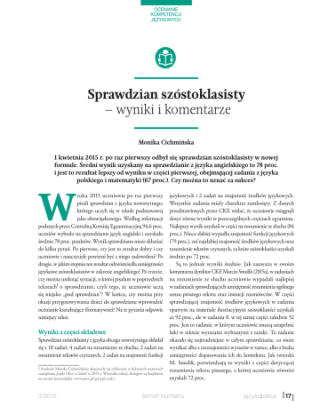 OCENIANIE KOMPETENCJI JĘZYKOWYCH Sprawdzian szóstoklasisty – wyniki i komentarze Monika Cichmińska 1 kwietnia 2015 r. po raz pierwszy odbył się sprawdzian szóstoklasisty w nowej formule. Średni wynik uzyskany na sprawdzianie z języka angielskiego to 78 proc. i jest to rezultat lepszy od wyniku w części pierwszej, obejmującej zadania z języka polskiego i matematyki (67 proc.). Czy można to uznać za sukces? W roku 2015 uczniowie po raz pierwszy pisali sprawdzian z języka nowożytnego, którego uczyli się w szkole podstawowej jako obowiązkowego. Według informacji podanych przez Centralną Komisję Egzaminacyjną 94,6 proc. uczniów wybrało na sprawdzianie język angielski i uzyskało średnio 78 proc. punktów. Wynik sprawdzianu może skłaniać do kilku pytań. Po pierwsze, czy jest to rezultat dobry i czy uczniowie i nauczyciele powinni być z niego zadowoleni? Po drugie, w jakim stopniu ten rezultat odzwierciedla umiejętności językowe szóstoklasistów w zakresie angielskiego? Po trzecie, czy można uniknąć sytuacji, o której pisałam w poprzednich tekstach1 o sprawdzianie, czyli tego, że uczniowie uczą się niejako „pod sprawdzian”? W końcu, czy można przy okazji przygotowywania dzieci do sprawdzianu wprowadzić ocenianie kształtujące (formatywne)? Na te pytania odpowie niniejszy tekst. Wyniki a części składowe Sprawdzian szóstoklasisty z języka obcego nowożytnego składał się z 10 zadań: 4 zadań na rozumienie ze słuchu, 2 zadań na rozumienie tekstów czytanych, 2 zadań na znajomość funkcji 1 Artykuły Moniki Cichmińskiej ukazywały się cyklicznie w kolejnych numerach czasopisma Języki Obce w Szkole w 2014 r. Wszystkie teksty dostępne są bezpłatnie na stronie kwartalnika: www.jows.pl [przypis red.]. 3/2015 językowych i 2 zadań na znajomość środków językowych. Wszystkie zadania miały charakter zamknięty. Z danych przedstawionych przez CKE widać, że uczniowie osiągnęli dosyć równe wyniki w poszczególnych częściach egzaminu. Najlepszy wynik uzyskali w części na rozumienie ze słuchu (84 proc.). Nieco słabiej wypadła znajomość funkcji językowych (79 proc.), zaś najsłabiej znajomość środków językowych oraz rozumienie tekstów czytanych, za które szóstoklasiści uzyskali średnio po 72 proc. Są to jednak wyniki średnie. Jak zauważa w swoim komentarzu dyrektor CKE Marcin Smolik (2015a), w zadaniach na rozumienie ze słuchu uczniowie wypadali najlepiej w zadaniach sprawdzających umiejętność rozumienia ogólnego sensu prostego tekstu oraz intencji rozmówców. W części sprawdzającej znajomość środków językowych w zadaniu opartym na materiale ilustracyjnym szóstoklasiści uzyskali aż 92 proc., ale w zadaniu 8. w tej samej części zaledwie 52 proc. Jest to zadanie, w którym uczniowie muszą uzupełnić luki w tekście wyrazami wybranymi z ramki. To zadanie okazało się najtrudniejsze w całym sprawdzianie, co może wynikać albo z nieznajomości wyrazów w ramce, albo z braku umiejętności dopasowania ich do kontekstu. Jak twierdzi M. Smolik, potwierdzają to wyniki z części dotyczącej rozumienia tekstu pisanego, z której uczniowie również uzyskali 72 proc. temat numeru [ 17 ] OCENIANIE KOMPETENCJI JĘZYKOWYCH Podsumowując: wynik sprawdzianu z języka angielskiego oraz innych języków obcych (z których wyniki było zbliżone) można uznać za satysfakcjonujący. Różnice procentowe pomiędzy częściami egzaminu są czymś zupełnie naturalnym i występują na wszystkich egzaminach pisemnych. Te różnice były również zgodne z przewidywaniami większości ekspertów i nauczycieli: to, że szóstoklasiści najlepiej wypadli w części na rozumienie ze słuchu nie jest niczym zaskakującym – w trakcie nauki języka obcego w szkole podstawowej to właśnie słuchanie jest tą umiejętnością, z którą uczniowie mają do czynienia najczęściej, szczególnie w pierwszych kilku latach nauki. Nie można też nie doceniać codziennej styczności dzieci z językiem angielskim, np. w czasie słuchania anglojęzycznych piosenek, oglądania kreskówek czy grania w różnego rodzaju gry. Nie dziwi też dobry wynik w części obejmującej znajomość funkcji językowych – zadania dotyczą bowiem języka znanego dzieciom z dialogów słuchanych w klasie, w których pojawia się typowy język funkcyjny. Nie dziwi również fakt, że najsłabiej wypadło zadanie nr 8, w którym należało uzupełnić luki w tekście. Nie od dziś to właśnie znajomość środków językowych wypada na egzaminach najgorzej – dotyczy to też egzaminu gimnazjalnego i maturalnego. Można więc chyba zaryzykować twierdzenie, że wyniki sprawdzianu odzwierciedlają realne umiejętności językowe uczniów. Nie można oczywiście wykluczać pewnej przypadkowości wyników, która jest naturalną cechą wszystkich testów o charakterze zamkniętym: zawsze może się zdarzyć, że uczeń będzie „strzelał” i przypadkiem wybierze prawidłową odpowiedź (statystycznie rzecz biorąc, nie można jednak założyć, że wszyscy uczniowie „strzelali” i średnio uzyskali 78 proc.). Pojawiają się również głosy krytyczne odnoszące się do poziomu trudności sprawdzaniu – że jest on zbyt łatwy jak na sześć lat nauki w szkole. Należy jednak pamiętać, że sześciu lat nauki języka przez młodsze dzieci nie da się porównać z sześcioma latami nauki przez nastolatków czy dorosłych: inne są postępy, inne tempo przyswajania nowych informacji i nabywania nowych umiejętności. Poza tym nadal widoczne są istotne różnice pomiędzy wynikiem sprawdzianu na terenach miejskich i wiejskich: według danych CKE średnia w miastach powyżej 100 tys. mieszkańców była najwyższa i wyniosła 83 proc., w miastach od 20 do 100 tys. – 80 proc., w miastach do 20 tys. – 76 proc., a na terenach wiejskich – 74 proc. Dyrektor CKE Marcin Smolik (2015b), odpierając zarzuty [ 18 ] Należy pamiętać, 