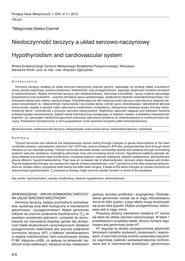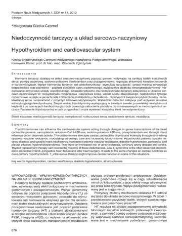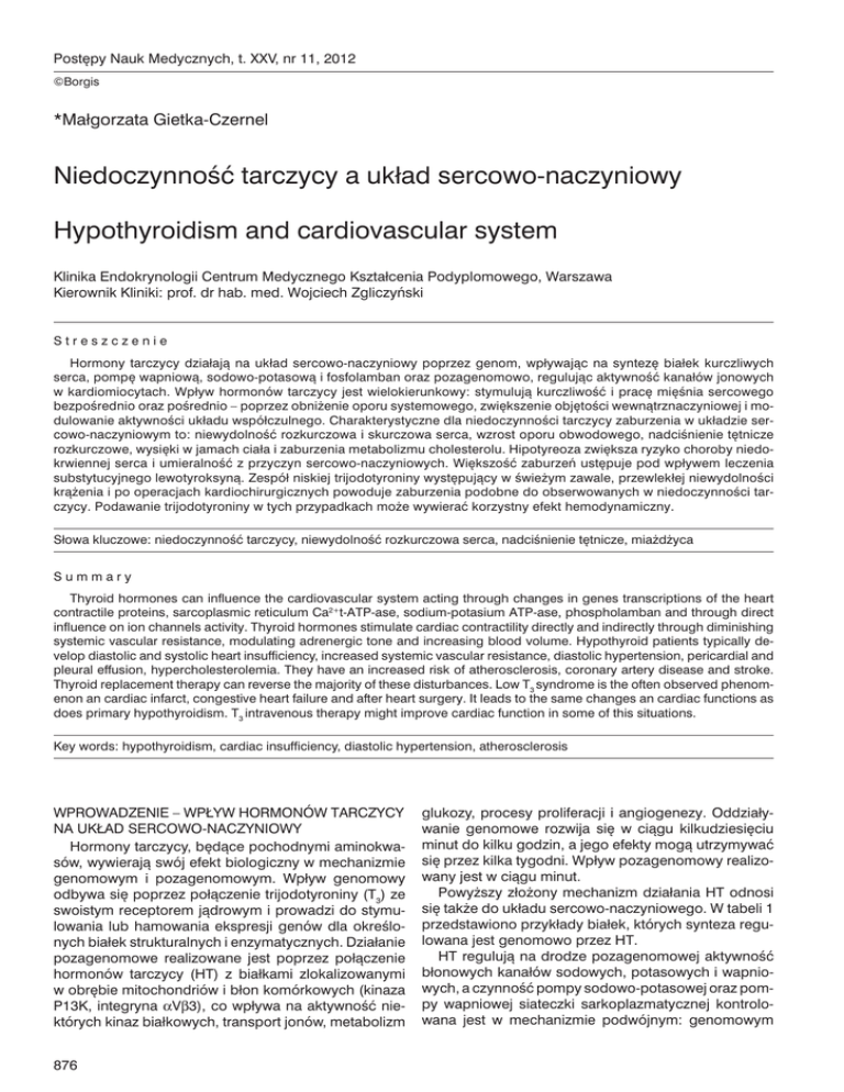 Postępy Nauk Medycznych, t. XXV, nr 11, 2012 ©Borgis *Małgorzata Gietka-Czernel Niedoczynność tarczycy a układ sercowo-naczyniowy Hypothyroidism and cardiovascular system Klinika Endokrynologii Centrum Medycznego Kształcenia Podyplomowego, Warszawa Kierownik Kliniki: prof. dr hab. med. Wojciech Zgliczyński Streszczenie Hormony tarczycy działają na układ sercowo-naczyniowy poprzez genom, wpływając na syntezę białek kurczliwych serca, pompę wapniową, sodowo-potasową i fosfolamban oraz pozagenomowo, regulując aktywność kanałów jonowych w kardiomiocytach. Wpływ hormonów tarczycy jest wielokierunkowy: stymulują kurczliwość i pracę mięśnia sercowego bezpośrednio oraz pośrednio – poprzez obniżenie oporu systemowego, zwiększenie objętości wewnątrznaczyniowej i modulowanie aktywności układu współczulnego. Charakterystyczne dla niedoczynności tarczycy zaburzenia w układzie sercowo-naczyniowym to: niewydolność rozkurczowa i skurczowa serca, wzrost oporu obwodowego, nadciśnienie tętnicze rozkurczowe, wysięki w jamach ciała i zaburzenia metabolizmu cholesterolu. Hipotyreoza zwiększa ryzyko choroby niedokrwiennej serca i umieralność z przyczyn sercowo-naczyniowych. Większość zaburzeń ustępuje pod wpływem leczenia substytucyjnego lewotyroksyną. Zespół niskiej trijodotyroniny występujący w świeżym zawale, przewlekłej niewydolności krążenia i po operacjach kardiochirurgicznych powoduje zaburzenia podobne do obserwowanych w niedoczynności tarczycy. Podawanie trijodotyroniny w tych przypadkach może wywierać korzystny efekt hemodynamiczny. Słowa kluczowe: niedoczynność tarczycy, niewydolność rozkurczowa serca, nadciśnienie tętnicze, miażdżyca Summary Thyroid hormones can influence the cardiovascular system acting through changes in genes transcriptions of the heart contractile proteins, sarcoplasmic reticulum Ca2+t-ATP-ase, sodium-potasium ATP-ase, phospholamban and through direct influence on ion channels activity. Thyroid hormones stimulate cardiac contractility directly and indirectly through diminishing systemic vascular resistance, modulating adrenergic tone and increasing blood volume. Hypothyroid patients typically develop diastolic and systolic heart insufficiency, increased systemic vascular resistance, diastolic hypertension, pericardial and pleural effusion, hypercholesterolemia. They have an increased risk of atherosclerosis, coronary artery disease and stroke. Thyroid replacement therapy can reverse the majority of these disturbances. Low T3 syndrome is the often observed phenomenon an cardiac infarct, congestive heart failure and after heart surgery. It leads to the same changes an cardiac functions as does primary hypothyroidism. T3 intravenous therapy might improve cardiac function in some of this situations. Key words: hypothyroidism, cardiac insufficiency, diastolic hypertension, atherosclerosis WPROWADZENIE – WPŁYW HORMONÓW TARCZYCY NA UKŁAD SERCOWO-NACZYNIOWY Hormony tarczycy, będące pochodnymi aminokwasów, wywierają swój efekt biologiczny w mechanizmie genomowym i pozagenomowym. Wpływ genomowy odbywa się poprzez połączenie trijodotyroniny (T3) ze swoistym receptorem jądrowym i prowadzi do stymulowania lub hamowania ekspresji genów dla określonych białek strukturalnych i enzymatycznych. Działanie pozagenomowe realizowane jest poprzez połączenie hormonów tarczycy (HT) z białkami zlokalizowanymi w obrębie mitochondriów i błon komórkowych (kinaza P13K, integryna αVβ3), co wpływa na aktywność niektórych kinaz białkowych, transport jonów, metabolizm 876 glukozy, procesy proliferacji i angiogenezy. Oddziaływanie genomowe rozwija się w ciągu kilkudziesięciu minut do kilku godzin, a jego efekty mogą utrzymywać się przez kilka tygodni. Wpływ pozagenomowy realizowany jest w ciągu minut. Powyższy złożony mechanizm działania HT odnosi się także do układu sercowo-naczyniowego. W tabeli 1 przedstawiono przykłady białek, których synteza regulowana jest genomowo przez HT. HT regulują na drodze pozagenomowej aktywność błonowych kanałów sodowych, potasowych i wapniowych, a czynność pompy sodowo-potasowej oraz pompy wapniowej siateczki sarkoplazmatycznej kontrolowana jest w mechanizmie podwójnym: genomowym Niedoczynność tarczycy a układ sercowo-naczyniowy Tabela 1. Regulacja genomowa syntezy białek serca przez hormony tarczycy. Regulacja pozytywna Regulacja negatywna – Ciężki łańcuch α-miozyny – Ca2+-ATP-aza siateczki sarkoplazmatycznej – Na+/K+ ATP-aza – Receptor β1-adrenergiczny – Przedsionkowy i mózgowy hormon natriuretyczny – Kanały potasowe regulowane woltażem (Kv1.5, Kv4.2, Kv4.3) – Ciężki łańcuch β-miozyny – Fosfolamban – Wymiennik Na+/Ca2+ – Cyklaza adenylowa typu V i VI i pozagenomowym. HT działają na układ sercowo-naczyniowy wielokierunkowo, wpływając na: – kardiomiocyty bezpośrednio, – obniżając opór systemowy, – zwiększając objętość krwi krążącej, – modulując aktywność układu współczulnego, – przyspieszając metabolizm lipidów, – zwiększając zużycie tlenu. Hormony tarczycy pobudzają syntezę łańcuchów ciężkich miozyny typu α (MHC – ang. myosin heavy chains) odpowiedzialnych za szybki skurcz mięśnia sercowego. W ludzkim sercu dominuje jednak izoforma MHC typu β, która znajduje się pod negatywną kontrolą T3. HT stymulują syntezę aktyny i troponiny I. Dodanie T3 do hodowli kardiomiocytów powoduje zwiększenie syntezy białek, czego nie stwierdza się dodając T3 do hodowli fibroblastów. HT regulują dostępność jonów wapnia dla kardiomiocytów, wpływając pobudzająco na aktywność błonowych kanałów Ca2+, wymienników Na+/Ca2+ oraz kanałów Ca2+ (tzw. kanały rianodynowe – ang. ryanodine channels) i pompy wapniowej (Ca2+-ATP-azy) siateczki sarkoplazmatycznej. Pompa wapniowa aktywnie sekwestruje jony wapniowe w zbiornikach siateczki sarkoplazmatycz