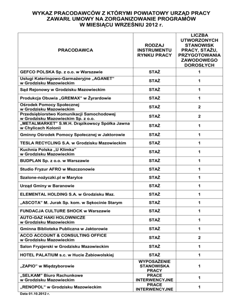 WYKAZ PRACODAWCÓW Z KTÓRYMI POWIATOWY URZĄD PRACY ZAWARŁ UMOWY NA ZORGANIZOWANIE PROGRAMÓW W MIESIĄCU WRZEŚNIU 2012 r. RODZAJ INSTRUMENTU RYNKU PRACY LICZBA UTWORZONYCH STANOWISK PRACY, STAŻU, PRZYGOTOWANIA ZAWODOWEGO DOROSŁYCH GEFCO POLSKA Sp. z o.o. w Warszawie STAŻ 1 Usługi Kateringowo-Garmażeryjne „AGANET” w Grodzisku Mazowieckim STAŻ 1 Sąd Rejonowy w Grodzisku Mazowieckim STAŻ 1 Produkcja Obuwia „GREMAX” w Żyrardowie STAŻ 1 STAŻ 2 STAŻ 2 STAŻ 1 Gminny Ośrodek Pomocy Społecznej w Jaktorowie STAŻ 1 TESLA RECYCLING S.A. w Grodzisku Mazowieckim STAŻ 1 Kuchnia Polska „U Klimka” w Grodzisku Mazowieckim STAŻ 1 BUDPLAN Sp. z o.o. w Warszawie STAŻ 1 Studio Fryzur AFRO w Mszczonowie STAŻ 1 Szalone-nożyczki.pl w Marylce STAŻ 1 Urząd Gminy w Baranowie STAŻ 1 ELEMENTAL HOLDING S.A. w Grodzisku Maz. STAŻ 1 „ASCOTA” M. Jurak Sp. kom. w Sękocinie Starym STAŻ 1 FUNDACJA CULTURE SHOCK w Warszawie STAŻ 1 AUTO-GAZ HAKI HOLOWNICZE w Grodzisku Mazowieckim STAŻ 1 Gminna Biblioteka Publiczna w Jaktorowie STAŻ 1 ACCO ACCOUNT & CONSULTING OFFICE w Grodzisku Mazowieckim STAŻ 2 Salon Fryzjerski w Grodzisku Mazowieckim STAŻ 1 HOTEL PALATIUM s.c. w Hucie Żabiowolskiej STAŻ 1 PRACODAWCA Ośrodek Pomocy Społecznej w Grodzisku Mazowieckim Przedsiębiorstwo Komunikacji Samochodowej w Grodzisku Mazowieckim Sp. z o.o. „METALMARKET” S.W.H. Drązikowscy Spółka Jawna w Chylicach Kolonii „ZAPIO” w Międzyborowie „SELKAM” Biuro Rachunkowe w Grodzisku Mazowieckim „RENOPOL” w Grodzisku Mazowieckim Data 01.10.2012 r. WYPOSAŻENIE STANOWISKA PRACY PRACE INTERWENCYJNE PRACE INTERWENCYJNE 1 1 1