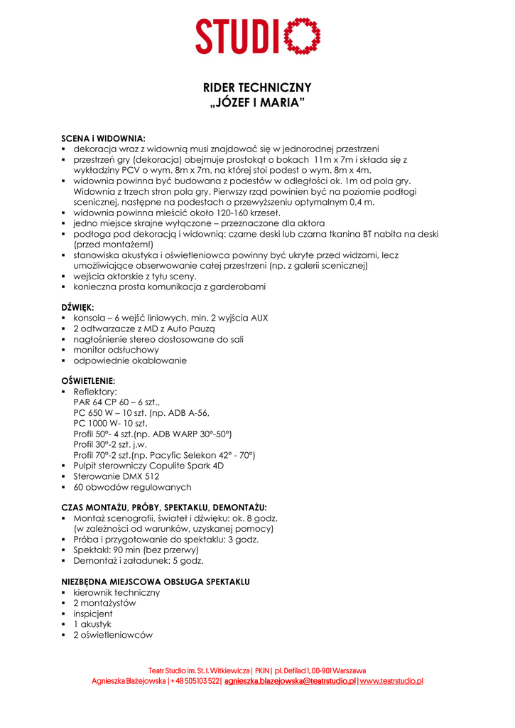 RIDER TECHNICZNY „JÓZEF I MARIA” SCENA i WIDOWNIA: dekoracja wraz z widownią musi znajdować się w jednorodnej przestrzeni przestrzeń gry (dekoracja) obejmuje prostokąt o bokach 11m x 7m i składa się z wykładziny PCV o wym. 8m x 7m, na której stoi podest o wym. 8m x 4m. widownia powinna być budowana z podestów w odległości ok. 1m od pola gry. Widownia z trzech stron pola gry. Pierwszy rząd powinien być na poziomie podłogi scenicznej, następne na podestach o przewyższeniu optymalnym 0,4 m. widownia powinna mieścić około 120-160 krzeseł. jedno miejsce skrajne wyłączone – przeznaczone dla aktora podłoga pod dekoracją i widownią: czarne deski lub czarna tkanina BT nabita na deski (przed montażem!) stanowiska akustyka i oświetleniowca powinny być ukryte przed widzami, lecz umożliwiające obserwowanie całej przestrzeni (np. z galerii scenicznej) wejścia aktorskie z tyłu sceny. konieczna prosta komunikacja z garderobami DŹWIĘK: konsola – 6 wejść liniowych, min. 2 wyjścia AUX 2 odtwarzacze z MD z Auto Pauzą nagłośnienie stereo dostosowane do sali monitor odsłuchowy odpowiednie okablowanie OŚWIETLENIE: Reflektory: PAR 64 CP 60 – 6 szt., PC 650 W – 10 szt. (np. ADB A-56, PC 1000 W- 10 szt. Profil 50°- 4 szt.(np. ADB WARP 30°-50°) Profil 30°-2 szt. j.w. Profil 70°-2 szt.(np. Pacyfic Selekon 42° - 70°) Pulpit sterowniczy Copulite Spark 4D Sterowanie DMX 512 60 obwodów regulowanych CZAS MONTAŻU, PRÓBY, SPEKTAKLU, DEMONTAŻU: Montaż scenografii, świateł i dźwięku: ok. 8 godz. (w zależności od warunków, uzyskanej pomocy) Próba i przygotowanie do spektaklu: 3 godz. Spektakl: 90 min (bez przerwy) Demontaż i załadunek: 5 godz. NIEZBĘDNA MIEJSCOWA OBSŁUGA SPEKTAKLU kierownik techniczny 2 montażystów inspicjent 1 akustyk 2 oświetleniowców ZESPÓŁ Z RAMIENIA TEATRU STUDIO: 3 aktorów (2 kobiety, 1 mężczyzna), inspicjent (1 kobieta), koordynator wyjazdu (1 kobieta) kierownik techniczny montażyści sceny (5 mężczyzn – w tym brygadzista ), elektryk - oświetleniowiec (2 mężczyzn), akustyk (1 mężczyzna), rekwizytor ( do ustalenia – kobieta czy mężczyzna ) garderobiana (1 kobieta), charakteryzatorka (1 kobieta), kierowca (2 lub 3 mężczyzn w zależności od dat przyjazdu ). Skład zespołu technicznego może ulec zmianie w zależności od potrzeb oraz uzyskanej pomocy w realizacji spektaklu. TRANSPORT do przewozu ekipy technicznej - bus do przewozu dekoracji - samochód ciężarowy do przewozu artystów – PKP lub bus GARDEROBY 2 garderoby do dyspozycji aktorów (2 kobiety oraz 1 mężczyzna) zaopatrzone w dobrze oświetlone lustra (ewentualnie 1 lampka biurowa), wieszak metalowy, wodę mineralną, deskę do prasowania i żelazko zapewnione proste dojście na scenę 1-2 pomieszczenia dla obsługi technicznej spektaklu PROWIZORYCZNY HARMONOGRAM PRACY 1 dzień: przejazd na trasie Warszawa – „Miasto Prezentacji”; 18-22 rozładunek, montaż. 2 dzień: 10-15 montaż cd.; 15-17 próba; 17-19 korekty; 19-20.20 spektakl; 20.30-0.30 demontaż i załadunek. 3 dzień: przejazd na trasie „Miasto Prezentacji” – Warszawa.