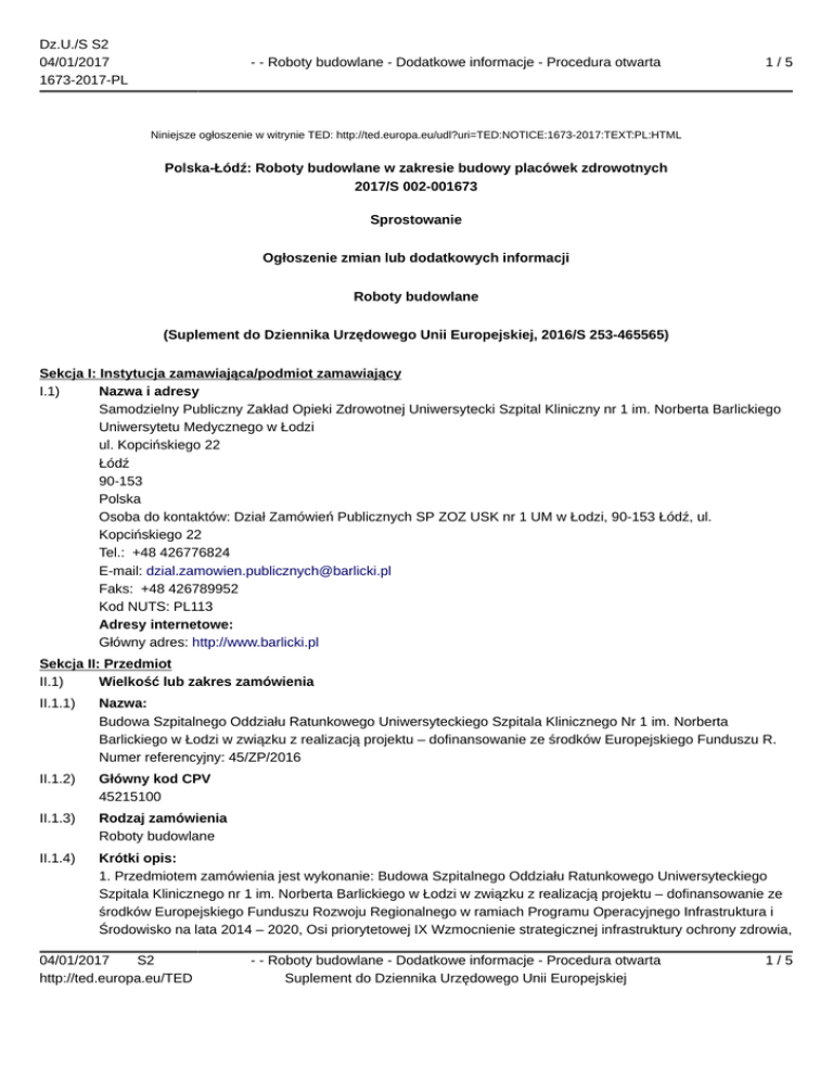 Dz.U./S S2 04/01/2017 1673-2017-PL - - Roboty budowlane - Dodatkowe informacje - Procedura otwarta 1/5 Niniejsze ogłoszenie w witrynie TED: http://ted.europa.eu/udl?uri=TED:NOTICE:1673-2017:TEXT:PL:HTML Polska-Łódź: Roboty budowlane w zakresie budowy placówek zdrowotnych 2017/S 002-001673 Sprostowanie Ogłoszenie zmian lub dodatkowych informacji Roboty budowlane (Suplement do Dziennika Urzędowego Unii Europejskiej, 2016/S 253-465565) Sekcja I: Instytucja zamawiająca/podmiot zamawiający I.1) Nazwa i adresy Samodzielny Publiczny Zakład Opieki Zdrowotnej Uniwersytecki Szpital Kliniczny nr 1 im. Norberta Barlickiego Uniwersytetu Medycznego w Łodzi ul. Kopcińskiego 22 Łódź 90-153 Polska Osoba do kontaktów: Dział Zamówień Publicznych SP ZOZ USK nr 1 UM w Łodzi, 90-153 Łódź, ul. Kopcińskiego 22 Tel.: +48 426776824 E-mail: [email protected] Faks: +48 426789952 Kod NUTS: PL113 Adresy internetowe: Główny adres: http://www.barlicki.pl Sekcja II: Przedmiot II.1) Wielkość lub zakres zamówienia II.1.1) Nazwa: Budowa Szpitalnego Oddziału Ratunkowego Uniwersyteckiego Szpitala Klinicznego Nr 1 im. Norberta Barlickiego w Łodzi w związku z realizacją projektu – dofinansowanie ze środków Europejskiego Funduszu R. Numer referencyjny: 45/ZP/2016 II.1.2) Główny kod CPV 45215100 II.1.3) Rodzaj zamówienia Roboty budowlane II.1.4) Krótki opis: 1. Przedmiotem zamówienia jest wykonanie: Budowa Szpitalnego Oddziału Ratunkowego Uniwersyteckiego Szpitala Klinicznego nr 1 im. Norberta Barlickiego w Łodzi w związku z realizacją projektu – dofinansowanie ze środków Europejskiego Funduszu Rozwoju Regionalnego w ramiach Programu Operacyjnego Infrastruktura i Środowisko na lata 2014 – 2020, Osi priorytetowej IX Wzmocnienie strategicznej infrastruktury ochrony zdrowia, 04/01/2017 S2 http://ted.europa.eu/TED - - Roboty budowlane - Dodatkowe informacje - Procedura otwarta Suplement do Dziennika Urzędowego Unii Europejskiej 1/5 Dz.U./S S2 04/01/2017 1673-2017-PL - - Roboty budowlane - Dodatkowe informacje - Procedura otwarta 2/5 Działania 9.1 Infrastruktura ratownictwa medycznego na realizację Projektu „Budowa Szpitalnego Oddziału Ratunkowego Uniwersyteckiego Szpitala Klinicznego nr 1 im. N. Barlickiego w Łodzi, zgodnie z dokumentacją projektowo-kosztorysową stanowiącą załączniki nr 1C do SIWZ. 2. Szczegółowy zakres przedmiotu zamówienia zawarty jest w dokumentacji projektowo-kosztorysowej (załączniki nr 1C do SIWZ). 3. Typ i rodzaj aparatury, (RTG i TK) która zostanie zainstalowana w wybudowanych pomieszczeniach, zostanie podana przez Zamawiającego w dniu wejścia Wykonawcy na budowę. Sekcja VI: Informacje uzupełniające VI.5) Data wysłania niniejszego ogłoszenia: 02/01/2017 VI.6) Numer pierwotnego ogłoszenia Numer ogłoszenia w Dz.Urz. UE – OJ/S: 2016/S 253-465565 Sekcja VII: Zmiany VII.1) Informacje do zmiany lub dodania VII.1.2) Tekst, który należy poprawić w pierwotnym ogłoszeniu Numer sekcji: II.2.6 Zamiast: Szacunkowa wartość Wartość bez VAT: 4 771 930.42 EUR. Powinno być: Szacunkowa wartość Wartość bez VAT: 4 771 930,42 PLN Numer sekcji: III.1.1 Zamiast: Wykaz i krótki opis warunków: 1. W postępowaniu mogą wyłącznie wziąć udział Wykonawcy, którzy spełniają warunki określone w SIWZ oraznie podlegają wykluczeniu z postępowania na podstawie ar. 24 ust. 1 pkt 12 -23 (przesłanki obligatoryjne) orazart. 24 ust. 5 pkt. 1, 3 i 8 (przesłanki fakultatywne) ustawy prawo zamówień publicznych. 2. Spełniają warunki udziału w postępowaniu, o ile zostały one określone przez Zamawiającego w ogłoszeniu ozamówieniu. Wstępne potwierdzenie, a w przypadku gdy złożenie dokumentów na potwierdzenie, że wykonawca spełniawarunki udziału w postępowaniu oraz nie podlega wykluczeniu nie jest wymagane przez Zamawiającego topotwierdzenie, że Wykonawca nie podlega wykluczeniu oraz spełnia warunki udziału w postępowaniu stanowiaktualne na dzień składania ofert Oświadczenie Wykonawcy w trybie art. 25a ust. 1 ustawy Pzp w formieStandardowego Formularzu Jednolitego Europejskiego Dokumentu Zamówienia, stanowiącego Załącznik nr 2do SIWZ. Powinno być: Numer sekcji: III.1.1 Zamiast: 1. Do oferty załącza się: 1.1 Jednolity Europejski Dokument Zamówienia – JEDZ 1.2 Pełnomocnictwo do podpisywania oferty (w formie oryginału lub kopii poświadczonej przez notariusza).Pełnomocnictwo należy załączyć do oferty tylko w przypadki, gdy oferta jest podpisana przez osobę niefigurującą w rejestrze lub wpisie do centralnej ewidencji działalności gospodarczej. 04/01/2017 S2 http://ted.europa.eu/TED - - Roboty budowlane - Dodatkowe informacje - Procedura otwarta Suplement do Dziennika Urzędowego Unii Europejskiej 2/5 Dz.U./S S2 04/01/2017 1673-2017-PL - - Roboty budowlane - Dodatkowe informacje - Procedura otwarta 3/5 1.3 Kopie dowodu wpłaty wadium lub oryginały dokumentów potwierdzających wniesienie wadium (dotyczywadium wnoszonego w innych niż pieniężna forma). 2. Wykonawca w terminie 3 dni od dnia zamieszczenia na stronie internetowej Zamawiającego informacji zotwarcia ofert przekazuje Zamawiającemu: 2.1 oświadczenie o przynależności lub braku przynależności do tej samej grupy kapitałowej, o której mowaw art. 24 ust. 1 pkt 23 ustawy. Wraz ze złożeniem oświadczenia, Wykonawca może przedstawić dowody, żepowiązania z innym wykonawcą nie prowadzą do zakłócenia konkurencji w postępowaniu o udzielenie zamówienia. Powinno być: Numer sekcji: III.1.1 Zamiast: 3. Wykonawca, każdy uczestnik Konsorcjum, podmiot udostępniający potencjał na zasadach wynikających zart. 22a ustawy Pzp wskazany w ofercie przez Wykonawcę – składają własne Jednolite Europejskie DokumentyZamówienia jako załączniki do formularza oferty. 4. Jednolity Europejski Dokument Zamówienia składany jest w formie pisemnej – z oryginalnym podpisempodmiotu składającego. 5. Oświadczenia, o których mowa w niniejszej S