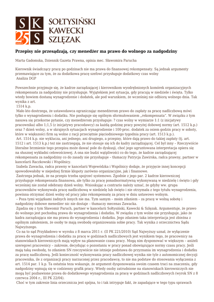 Przepisy nie przesądzają, czy menedżer ma prawo do wolnego za nadgodziny Marta Gadomska, Dziennik Gazeta Prawna, opinia mec. Sławomira Parucha Kierownik świadczący pracę po godzinach nie ma prawa do finansowej rekompensaty. Są jednak argumenty przemawiające za tym, że za dodatkowa pracę szefowi przysługuje dodatkowy czas wolny Analiza DGP Powszechnie przyjmuje się, że kadrze zarządzającej i kierownikom wyodrębnionych komórek organizacyjnych rekompensata za nadgodziny nie przysługuje. Wyjątekiem jest sytuacja, gdy pracują w niedziele i święta. Tylko wtedy bowiem dostaną wynagrodzenie i dodatek, ale pod warunkiem, że wcześniej nie odbiorą wolnego dnia. Tak wynika z art. 1514 k.p. Mało kto dostrzega, że ustawodawca ograniczając menedżerom prawo do zapłaty za pracę nadliczbową mówi tylko o wynagrodzeniu i dodatku. Nie posługuje się ogólnym sformułowaniem „rekompensata”. W związku z tym nasuwa się przekorne pytanie, czy menedżerom przysługuje: ? czas wolny w wymiarze 1:1 (z inicjatywy pracownika) albo 1;1,5 (z inicjatywy pracodawcy) za każdą godzinę pracy powyżej dobowej normy (art. 1512 k.p.) oraz ? dzień wolny, a w skrajnych sytuacjach wynagrodzenie i 100-proc. dodatek za osiem godzin pracy w soboty, które w większości firm są wolne z racji przeciętnie pięciodniowego tygodnia pracy (art. 1513 k.p.). Art. 1514 k.p. nie wyklucza, ani jednego, ani drugiego, a przepisy, które dają prawo do takiej zapłaty (tj. art. 1512 i art. 1513 k.p.) też nie zastrzegają, że nie stosuje się ich do kadry zarządzającej. Cel był inny – Rzeczywiście literalne brzmienie tego przepisu może dawać pole do dyskusji, choć jego ugruntowana interpretacja opiera się na słusznej wykładni celowościowej. A ona nie budzi wątpliwości co do tego, że kadrze zarządzającej rekompensata za nadgodziny co do zasady nie przysługuje – tłumaczy Patrycja Zawirska, radca prawny, partner w kancelarii Raczkowski i Wspólnicy. Izabela Zawacka, radca prawny w kancelarii Wojewódzka i Wspólnicy dodaje, że przyjęcie innej koncepcji spowodowałoby w niejednej firmie kłopoty zarówno organizacyjne, jak i finansowe. Zastrzega jednak, że na przepis trzeba spojrzeć systemowo. Zgodnie z jego par. 2 kadrze kierowniczej przysługuje rekompensata finansowa, ale tylko za pracę ponadnormatywną wykonywaną w niedzielę i święto i gdy wcześniej nie został odebrany dzień wolny. Wnioskując a contrario należy uznać, że gdyby ww. grupa pracowników wykonywała pracę nadliczbową w niedzielę lub święto i nie otrzymała z tego tytułu wynagrodzenia, powinna otrzymać dzień wolny od pracy jako rekompensatę za pracę w dniu ustawowo wolnym. – Poza tymi wyjątkami żadnych innych nie ma. Tym samym – moim zdaniem – za pracę w wolną sobotę i nadgodziny dobowe menedżer nic nie dostaje – tłumaczy mecenas Zawacka. Zgadza się z tym Sławomir Paruch, partner w kancelarii Sołtysiński, Kawecki & Szlęzak. Argumentuje, że prawo do wolnego jest pochodną prawa do wynagrodzenia i dodatku. W związku z tym wolne nie przysługuje, jako że kadra zarządzająca nie ma prawa do wynagrodzenia i dodatku. Jego zdaniem taka interpretacja jest zbieżna z ogólnym założeniem, że osoby te mają swobodę organizowania sobie pracy. Tak wynika z orzecznictwa Sądu Najwyższego. Co na to sąd Przykładowo w wyroku z 8 marca 2011 r. (II PK 221/2010) Sąd Najwyższy uznał, że wyłączenie prawa do wynagrodzenia i dodatku za pracę w godzinach nadliczbowych jest wynikiem tego, że pracownicy na stanowiskach kierowniczych mają wpływ na planowanie czasu pracy. Mogą nim dysponować w większym – aniżeli szeregowi pracownicy – zakresie, decydując o pozostaniu w pracy ponad obowiązujące normy czasu pracy. Jeśli mają taką swobodę, to zdaniem SN rzeczywiście nie istnieje podstawa do przyznania im wynagrodzenia i dodatku za pracę nadliczbową. Jeśli konieczność wykonywania pracy nadliczbowej wynika nie tyle z autonomicznej decyzji pracownika, ile z organizacji pracy narzuconej przez pracodawcę, to nie ma podstaw do stosowania wyłączenia z art. 1514 par. 1 k.p. Ta ostatnia teza wskazuje, że argument dysponowania swoim czasem traci na znaczeniu, gdy nadgodziny wpisują się w codzienny grafik pracy. Wtedy osoby zatrudnione na stanowiskach kierowniczych nie mogą być pozbawione prawa do dodatkowego wynagrodzenia za pracę w godzinach nadliczbowych (wyrok SN z 8 czerwca 2004 r., III PK 22/04). Choć w tym zakresie linia orzecznicza jest spójna, to i tak intryguje fakt, że zapadające w tego typu sprawach orzeczenia tak samo jak kodeks pracy odnoszą się każdorazowo do wynagrodzenia i dodatku za nadgodziny.
