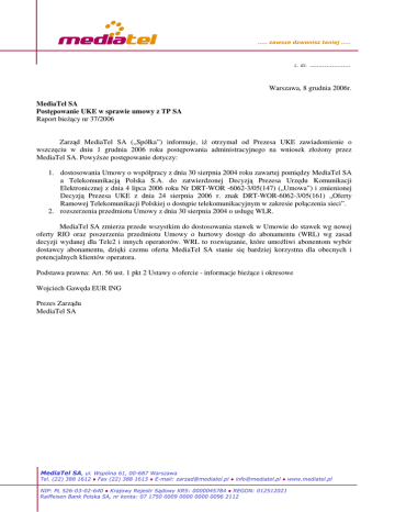 Warszawa, 8 grudnia 2006r. MediaTel SA Post powanie UKE w sprawie umowy z TP SA Raport bie cy nr 37/2006 Zarz d MediaTel SA („Spółka”) informuje, i otrzymał od Prezesa UKE zawiadomienie o wszcz ciu w dniu 1 grudnia 2006 roku post powania administracyjnego na wniosek zło ony przez MediaTel SA. Powy sze post powanie dotyczy: 1. dostosowania Umowy o współpracy z dnia 30 sierpnia 2004 roku zawartej pomi dzy MediaTel SA a Telekomunikacj Polska S.A. do zatwierdzonej Decyzj Prezesa Urz du Komunikacji Elektronicznej z dnia 4 lipca 2006 roku Nr DRT-WOR -6062-3/05(147) („Umowa”) i zmienionej Decyzj Prezesa UKE z dnia 24 sierpnia 2006 r. znak DRT-WOR-6062-3/05(161) „Oferty Ramowej Telekomunikacji Polskiej o dost pie telekomunikacyjnym w zakresie poł czenia sieci”. 2. rozszerzenia przedmiotu Umowy z dnia 30 sierpnia 2004 o usług WLR. MediaTel SA zmierza przede wszystkim do dostosowania stawek w Umowie do stawek wg nowej oferty RIO oraz poszerzenia przedmiotu Umowy o hurtowy dost p do abonamentu (WRL) wg zasad decyzji wydanej dla Tele2 i innych operatorów. WRL to rozwi zanie, które umo liwi abonentom wybór dostawcy abonamentu, dzi ki czemu oferta MediaTel SA stanie si bardziej korzystna dla obecnych i potencjalnych klientów operatora. Podstawa prawna: Art. 56 ust. 1 pkt 2 Ustawy o ofercie - informacje bie ce i okresowe Wojciech Gaw da EUR ING Prezes Zarz du MediaTel SA ! "# ()*# * + 0 "&& " 5 , 6 *' 6 17 .' / 0 . 6' % # % 12 ' / -01# + 8 $! " % ,+ , 8 " &'$! " % 0 34(# + ! " %