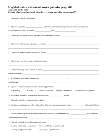 Przykład testu z astronomicznych podsatw geografii Uzupełnić puste pola : __________________ Wybarć własciwe odpowiedzi a,b,c,d,e ... . (moŜe byc kilka poprawnych!!) 1. Astronomia zajmuje się badaniem ______________________________________________________________________ ______________________________________________________________________________________________________ 2. Z powodu zjawiska ____________________ z przestrzeni kosmicznej do powierzchni Ziemi docierają fale elektromagnetyczne tylko w zakresie __________________ oraz _______________________ 3. Obserwacje pozycyjne (inaczej astrometryczne) polegają na badaniu ___________________________________________ ______________________________________________________________________________________________________ 4. Obserwacje fotometryczne polegają na badaniu ___________________________________________________________ ______________________________________________________________________________________________________ 5. Obserwacje spektroskopowe polegają na badaniu __________________________________________________________ _____________________________________________________________________________________________________ 6. Obserwacje polarymetryczne polegają na badaniu _________________________________________________________ ______________________________________________________________________________________________________ 7. Lunety i teleskopy róŜnią się tym, Ŝe lunety ______________________________________________________________ natomiast teleskopy _____________________________________________________________________________________ 8. WyróŜnia się następujące rodzaje lunet ________________________________, ______________________________ oraz teleskopów ________________________________, ______________________________ 9. Oprócz światła informacji o kosmosie dostarczają równieŜ: a) meteoryty b) lasery c) inne cywilizacje d) cząstki elementarne e) sondy lecące do gwiazd 10. Największe teleskopy optyczne mają średnice rzędu ________________ metrów 11. Zdolność rozdzielcza teleskopu zaleŜy od jego ______________________________________ 12. Szybkie migotanie gwiazd jakie widać gołym okiem jest spowodowane zjawiskiem _______________, które jest efektem _____________________________________________________________________________________________________ 13. W efekcie refrakcji atmosferycznej obserwowana wysokość ciał niebieskich jest ___________________ niŜ rzeczywista, a obserwowany azymut jest ______________________________________________________________________________ 14. Wartość poprawki r na refrakcję atmosferyczną: a) zaleŜy od ciśnienia i temperatury b) wynosi 35’ dla wszystkich ciał c) zaleŜy od wysokości ciała d) zaleŜy od azymutu ciała 15. Jednostka astronomiczna jest _________________________________________________________________________ ______________________________________________________________________________ jej długość to _________ km 16. Za pomocą lat świetlnych mierzy się: a) wiek gwiazd b) odległość ciał niebieskich c) wiek Wszechświata d) średnicę gwiazd e) jasność gwiazd f) jasności absolutne 17. Parsek jest to ______________________________________________________________________________________ _______________________________________________________________ jego długość to około ___________________ 18. Wielkości gwiazdowe określają: a) wiek gwiazd b) odległość ciał niebieskich c) wiek Wszechświata d) średnicę gwiazd e) jasność gwiazd f) jasności absolutne 19. Jasność absolutna gwiazd jest _________________________________________________________________________ ______________________________________________________________________________________________________ 20. Jasność obserwowana gwiazd zaleŜy od : _____________________ oraz __________________ ____________ gwiazdy 21. Koło wielkie to _____________________________________________________________________________________ 22. Horyzont to ________________________________________________________________________________________ 23. Równik niebieski to _________________________________________________________________________________ 24. Zaznacz punkty przecięcia pionu ze sferą niebieską: a) Biegun niebieski N b) Biegun niebieski S f) N i) E g) S h) W c) Zenit j) punkt Barana k) punkt Wagi d) Nadir e) środek sfery l)g.Polarna m) środek Ziemi d) Nadir e) środek sfery l)g.Polarna m) środek Ziemi d) Nadir e) środek sfery l)g.Polarna m) środek Ziemi d) Nadir e) środek sfery l)g.Polarna m) środek Ziemi 25. Zaznacz punkty przecięcia osi świata ze sferą niebieską: a) Biegun niebieski N b) Biegun niebieski S f) N i) E g) S h) W c) Zenit j) punkt Barana k) punkt Wagi 26. Zaznacz punkty przecięcia południka niebieskiego z horyzontem: a) Biegun niebieski N b) Biegun niebieski S f) N i) E g) S h) W c) Zenit j) punkt Barana k) punkt Wagi 27. Zaznacz punkty przecięcia równika niebieskiego z horyzontem: a) Biegun niebieski N b) Biegun niebieski S f) N i) E g) S h) W c) Zenit j) punkt Barana k) punkt Wagi 28. Zaznacz punkty przecięcia ekliptyki z równikiem niebieskim: a) Biegun niebieski N b) Biegun niebieski S f) N i) E g) S h) W c) Zenit j) punkt Barana k) punkt Wagi d) Nadir e) środek sfery l)g.Polarna m) środek Ziemi 29. Gwiazda góruje w chwili gdy _________________________________________________________________________, a dołuje gdy ___________________________________________________________________________________________ 30. Wymień współrzędne układu horyzontalnego: a) deklinacja b) kąt godzinny c) wysokość d) inklinacja e) azymut f) rektascensja 31. Wymień współrzędne układu równikowego-równonocnego: a) deklinacja b) kąt godzinny c) wysokość d) inklinacja e) azymut f) rektascensja 32. Deklinacja jest to kąt pomiędzy _____________________________ a płaszczyzną _______________________________ 33. Kąt godziny jest to