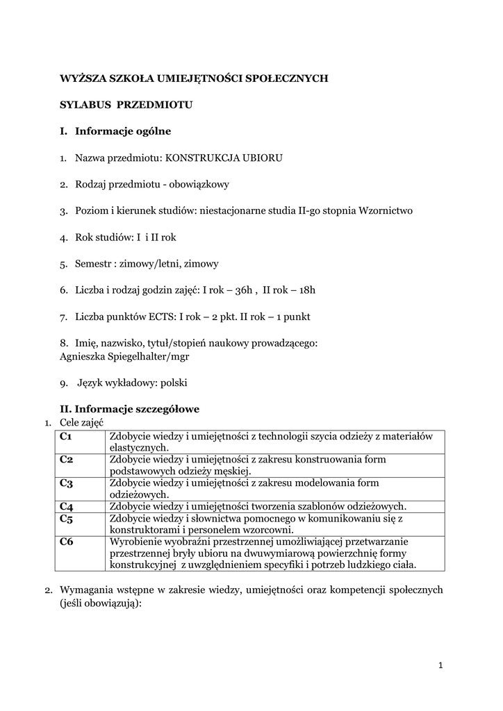 KONSTRUKCJA UBIORU 2 - Wyższa Szkoła Umiejętności