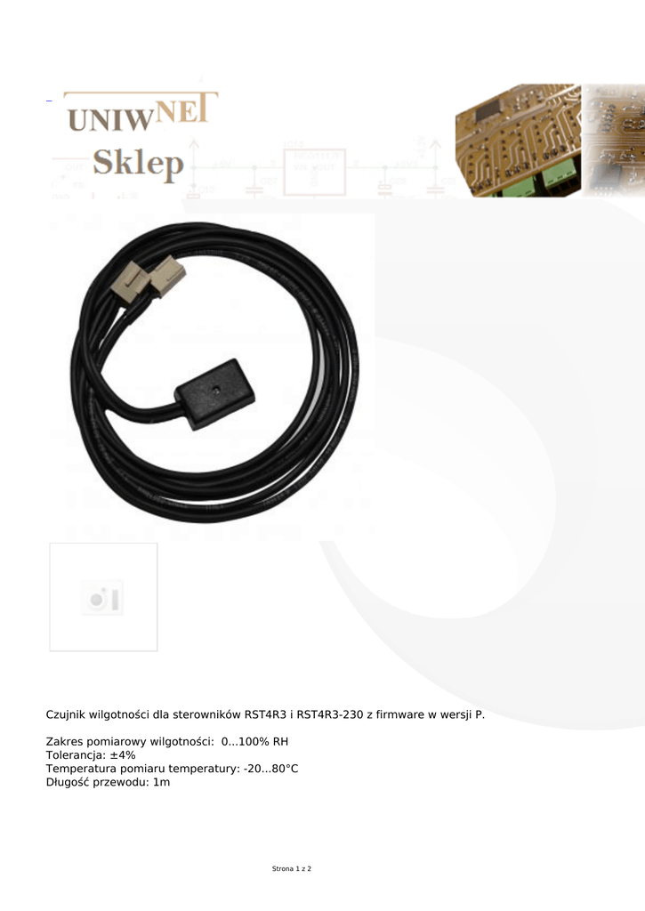 Czujnik wilgotności dla sterowników RST4R3 i RST4R3-230 z firmware w wersji P. Zakres pomiarowy wilgotności: 0...100% RH Tolerancja: ±4% Temperatura pomiaru temperatury: -20...80°C Długość przewodu: 1m Strona 1 z 2 Strona 2 z 2