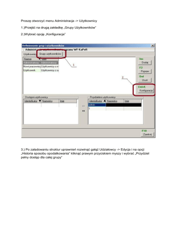 Proszę otworzyć menu Administracja -> Użytkownicy 1.)Przejść na drugą zakładkę „Grupy Użytkowników” 2.)Wybrać opcję „Konfiguracja” 3.) Po załadowaniu struktur uprawnień rozwinąć gałąź Udziałowcy -> Edycja i na opcji „Historia sposobu opodatkowania” kliknąć prawym przyciskiem myszy i wybrać „Przydziel pełny dostęp dla całej grupy” 4.) Następnie wybrać gałąź Firmy (działalności) -> Edycja i na „Rodzaj działalności” kliknąć prawy przycisk myszy i wybrać „Przydziel pełny dostęp dla całej grupy” 5.) Klikamy opcję “Zapisz” 6.) W następnym oknie Klikamy „Zamknij” i potwierdzamy zapisanie zamian Po ponownym zalogowaniu się do programu będzie możliwe dodanie historii rodzaju ewidencji i sposobu opodatkowania.