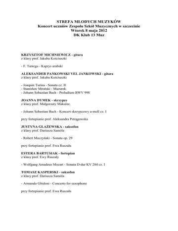 STREFA MŁODYCH MUZYKÓW Koncert uczniów Zespołu Szkół Muzycznych w szczecinie Wtorek 8 maja 2012 DK Klub 13 Muz KRZYSZTOF MICHNIEWICZ - gitara z klasy prof. Jakuba Kościuszki - F. Tarrega - Kaprys arabski ALEKSANDER PANKOWSKI VEL JANKOWSKI - gitara z klasy prof. Jakuba Kościuszki - Joaquin Turina - Sonata cz. II - Stanisław Mroński - Mazurek - Johann Sebastian Bach - Preludium BWV 998 JOANNA DYMEK - skrzypce z klasy prof. Małgorzaty Makulec - Johann Sebastian Bach - Koncert skrzypcowy a-moll cz. I przy fortepianie prof. Aleksandra Pstrągowska JUSTYNA GŁAŻEWSKA - saksofon z klasy prof. Dariusza Samóla - Robert Muczyński - Sonata op. 29 przy fortepianie prof. Ewa Ruszała ESTERA BARTUSIAK - fortepian z klasy prof. Ewy Ruszały - Wolfgang Amadeus Mozart - Sonata D-dur KV 284 cz. I TOMASZ KASPERSKI - saksofon z klasy prof. Dariusza Samóla - Armando Ghidoni - Concerto for saxophone przy fortepianie prof. Ewa Ruszała BOGUMIŁ SOROKA - trąbka z klasy prof. Bogdana Rymaszewskiego - Roberto Valentino - Sonata d-moll przy fortepianie prof. Mirosława Białas PRZEMYSŁAW TURNIK - perkusja z klasy prog. Bogdana Pilaka - Eugene Novotny - Minute of News na werbel solo DUET W SKŁADZIE KATARZYNA JASTRZĘBSKA - skrzypce KORNEL GLIŃSKI - akordeon przygotowanie prof. Tadeusz Prokurat - Ernesto De Curtis - Torna a Sorrento - Fritz Pilsl - Gopâk - John Kander - New York, New York Organizacja i prowadzenie koncertu Marta Szreder