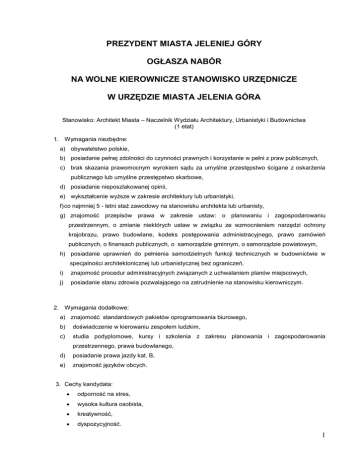 PREZYDENT MIASTA JELENIEJ GÓRY OGŁASZA NABÓR NA WOLNE KIEROWNICZE STANOWISKO URZĘDNICZE W URZĘDZIE MIASTA JELENIA GÓRA Stanowisko: Architekt Miasta – Naczelnik Wydziału Architektury, Urbanistyki i Budownictwa (1 etat) 1. Wymagania niezbędne: a) obywatelstwo polskie, b) posiadanie pełnej zdolności do czynności prawnych i korzystanie w pełni z praw publicznych, c) brak skazania prawomocnym wyrokiem sądu za umyślne przestępstwo ścigane z oskarżenia publicznego lub umyślne przestępstwo skarbowe, d) posiadanie nieposzlakowanej opinii, e) wykształcenie wyższe w zakresie architektury lub urbanistyki, f) co najmniej 5 - letni staż zawodowy na stanowisku architekta lub urbanisty, g) znajomość przepisów prawa w zakresie ustaw: o planowaniu i zagospodarowaniu przestrzennym, o zmianie niektórych ustaw w związku ze wzmocnieniem narzędzi ochrony krajobrazu, prawo budowlane, kodeks postępowania administracyjnego, prawo zamówień publicznych, o finansach publicznych, o samorządzie gminnym, o samorządzie powiatowym, h) posiadanie uprawnień do pełnienia samodzielnych funkcji technicznych w budownictwie w specjalności architektonicznej lub urbanistycznej bez ograniczeń, i) znajomość procedur administracyjnych związanych z uchwalaniem planów miejscowych, j) posiadanie stanu zdrowia pozwalającego na zatrudnienie na stanowisku kierowniczym. 2. Wymagania dodatkowe: a) znajomość standardowych pakietów oprogramowania biurowego, b) doświadczenie w kierowaniu zespołem ludzkim, c) studia podyplomowe, kursy i szkolenia z zakresu planowania i zagospodarowania przestrzennego, prawa budowlanego, d) posiadanie prawa jazdy kat. B, e) znajomość języków obcych. 3. Cechy kandydata: odporność na stres, wysoka kultura osobista, kreatywność, dyspozycyjność. 1 4. Osoba, która będzie zatrudniona na ww. stanowisku nie może: a) wykonywać dodatkowych zajęć pozostających w sprzeczności lub związanych z zajęciami, które wykonuje w ramach obowiązków służbowych, wywołujących uzasadnione podejrzenie o stronniczość lub interesowność oraz zajęć sprzecznych z obowiązkami wynikającymi z ustawy o pracownikach samorządowych, b) być członkiem zarządu, rady nadzorczej lub komisji rewizyjnej spółki prawa handlowego, o ile nie została zgłoszona do objęcia takich stanowisk przez jednostki samorządu terytorialnego, c) być zatrudniona lub wykonywać innych zajęć w spółkach prawa handlowego, które mogłyby wywołać podejrzenie o ich stronniczość lub interesowność, d) być członkiem zarządu, rady nadzorczej lub komisji rewizyjnej spółdzielni, z wyjątkiem rady nadzorczej spółdzielni mieszkaniowej, e) być członkiem zarządu fundacji prowadzącej działalność gospodarczą, f) posiadać w spółkach prawa handlowego więcej niż 10 % akcji lub udziały przedstawiające więcej niż 10 % kapitału zakładowego - w każdej z tych spółek, g) prowadzić działalności gospodarczej na własny rachunek lub wspólnie z innymi osobami, a także zarządzać taką działalnością lub być przedstawicielem czy pełnomocnikiem w prowadzeniu takiej działalności; nie dotyczy to działalności wytwórczej w rolnictwie w zakresie produkcji roślinnej i zwierzęcej, w formie i zakresie gospodarstwa rodzinnego. 5. Zakres wykonywanych zadań na stanowisku: Organizowanie, koordynowanie i nadzorowanie realizacji zadań Wydziału Architektury, Urbanistyki i Budownictwa wynikających z § 21 oraz § 22 Regulaminu Organizacyjnego Urzędu Miasta Jelenia Góra. 6. Informacja o warunkach pracy na danym stanowisku: praca na I piętrze w budynku a) przy ul. Ptasiej 6A, ciągi komunikacyjne w budynku o odpowiedniej szerokości, w pomieszczeniu pracy odpowiednia szerokość dojść i przejść, budynek nie posiada pomieszczeń higieniczno - sanitarnych dla osób niepełnosprawnych i nie jest wyposażony w windę, stanowisko pracy związane jest z pracą przy komputerze oraz pracą w terenie. b) 7. Wymagane dokumenty: a) życiorys (CV), b) list motywacyjny, c) oświadczenie o treści:” Posiadam pełną zdolność do czynności prawnych oraz korzystam z pełni praw publicznych, nie byłam (byłem) skazana(y) prawomocnym wyrokiem sądu za umyślne przestępstwo ścigane z oskarżenia publicznego lub umyślne przestępstwo skarbowe, d) kopia dokumentu tożsamości, e) kopie dokumentów potwierdzających: wykształcenie /kserokopia dyplomu ukończenia studiów wyższych/, doświadczenie zawodowe /kserokopie świadectw pracy, dokumenty potwierdzające prowadzenie działalności gospodarczej, w przypadku trwania stosunku pracy – zaświadczenie o zatrudnieniu/, 2 kwalifikacje i umiejętności /kserokopie dokumentów potwierdzających ukończone szkolenia, kursy, studia podyplomowe/, f) pisemna koncepcja pracy na stanowisku Architekta Miasta, g) kserokopia zaświadczenia o aktualnym stanie zdrowia, h) wskazane referencje od poprzednich pracodawców. Wymagane dokumenty aplikacyjne należy składać: - w Wydziale Organizacyjnym i Kadr Urzędu Miasta Jelenia Góra ul. Sudecka 29 pok. 18 / I piętro/ z dopiskiem: „Nabór na stanowisko Architekta Miasta - Naczelnika Wydziału Architektury, Urbanistyki i Budownictwa w Urzędzie Miasta Jelenia Góra” lub przesłać: - na adres: Wydział Organizacyjny i Kadr Urząd Miasta Jelenia Góra ul. Sudecka 29, 58-500 Jelenia Góra z dopiskiem j/w w terminie do dnia 05 lutego 2016 r. Przewidywany termin zawarcia umowy o pracę – 1 kwietnia 2016r. W przypadku osób podejmujących po raz pierwszy pracę na stanowisku urzędniczym, w tym kierowniczym stanowisku urzędniczym umowę o pracę zawiera się na czas określony - 6 miesięcy. W czasie trwania umowy organizuje się służbę przygotowawczą kończącą się egzaminem, którego pozytywny wynik jest warunkiem dalszego zatrudnienia pracownika. Ogłoszenie jest opublikowane w Biuletynie Informacji Publicznej Urzędu Miasta Jelenia Góra http://bip.jeleniagora.pl/ oraz wywieszone na 