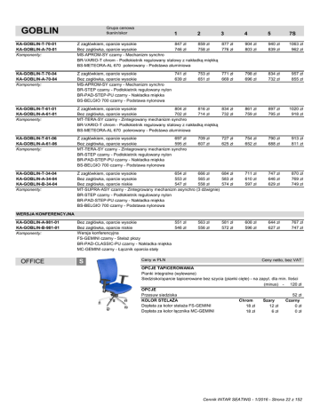 GOBLIN Grupa cenowa tkanin/skor 1 2 3 4 5 7S KA-GOBLIN-T-70-01 KA-GOBLIN-A-70-01 Komponenty: Z zagłówkiem, oparcie wysokie 847 zł 859 zł 877 zł Bez zagłówka, oparcie wysokie 746 zł 758 zł 776 zł MS-APROM-SY czarny - Mechanizm synchro BR-VARIO-T chrom - Podłokietnik regulowany stalowy z nakładką miękką BS-METEORA-AL 670 polerowany - Podstawa aluminiowa 904 zł 803 zł 940 zł 839 zł 1063 zł 962 zł KA-GOBLIN-T-70-04 KA-GOBLIN-A-70-04 Komponenty: Z zagłówkiem, oparcie wysokie 741 zł Bez zagłówka, oparcie wysokie 639 zł MS-APROM-SY czarny - Mechanizm synchro BR-STEP czarny - Podłokietnik regulowany nylon BR-PAD-STEP-PU czarny - Nakładka miękka BS-BELGIO 700 czarny - Podstawa nylonowa 771 zł 669 zł 798 zł 696 zł 834 zł 732 zł 957 zł 855 zł KA-GOBLIN-T-61-01 KA-GOBLIN-A-61-01 Komponenty: Z zagłówkiem, oparcie wysokie 804 zł 816 zł 834 zł Bez zagłówka, oparcie wysokie 702 zł 714 zł 732 zł MT-TERA-SY czarny - Zintegrowany mechanizm synchro BR-VARIO-T chrom - Podłokietnik regulowany stalowy z nakładką miękką BS-METEORA-AL 670 polerowany - Podstawa aluminiowa 861 zł 759 zł 897 zł 795 zł 1020 zł 918 zł KA-GOBLIN-T-61-06 KA-GOBLIN-A-61-06 Komponenty: Z zagłówkiem, oparcie wysokie 697 zł Bez zagłówka, oparcie wysokie 595 zł MT-TERA-SY czarny - Zintegrowany mechanizm synchro BR-STEP czarny - Podłokietnik regulowany nylon BR-PAD-STEP-PU czarny - Nakładka miękka BS-BELGIO 700 czarny - Podstawa nylonowa 727 zł 625 zł 754 zł 652 zł 790 zł 688 zł 913 zł 811 zł KA-GOBLIN-T-34-04 KA-GOBLIN-A-34-04 KA-GOBLIN-B-34-04 Komponenty: Z zagłówkiem, oparcie wysokie 654 zł 666 zł 684 zł Bez zagłówka, oparcie wysokie 553 zł 565 zł 583 zł Bez zagłówka, oparcie niskie 547 zł 558 zł 574 zł MT-SUPRA-ASY czarny - Zintegrowany mechanizm asynchro (3 dźwignie) BR-STEP czarny - Podłokietnik regulowany nylon BR-PAD-STEP-PU czarny - Nakładka miękka BS-BELGIO 700 czarny - Podstawa nylonowa 711 zł 610 zł 597 zł 747 zł 646 zł 629 zł 870 zł 769 zł 749 zł Bez zagłówka, oparcie wysokie 551 zł Bez zagłówka, oparcie niskie 546 zł Wersja konferencyjna FS-GEMINI czarny - Stelaż płozy BR-PAD-CLASSIC-PU czarny - Nakładka miękka MC-GEMINI czarny - Łącznik oparcia stały 608 zł 596 zł 644 zł 627 zł 767 zł 747 zł 753 zł 651 zł 709 zł 607 zł WERSJA KONFERENCYJNA KA-GOBLIN-A-981-01 KA-GOBLIN-B-981-01 Komponenty: OFFICE OFFICE S Ceny w PLN 563 zł 556 zł 581 zł 572 zł Ceny netto, bez VAT OPCJE TAPICEROWANIA Pianki integralne (wylewane) Siedzisko/oparcie tapicerowane bez szycia (pianki cięte) - na zapyt. dla min. Ilości (minus) - 120 zł OPCJE Przesuw siedziska 52 zł KOLOR STELAŻA Chrom Szary Czarny Dopłata za kolor stelaża FS-GEMINI 18 zł 12 zł 0 zł Dopłata za kolor łącznika MC-GEMINI 18 zł 6 zł 0 zł Cennik INTAR SEATING - 1/2016 - Strona 22 z 152