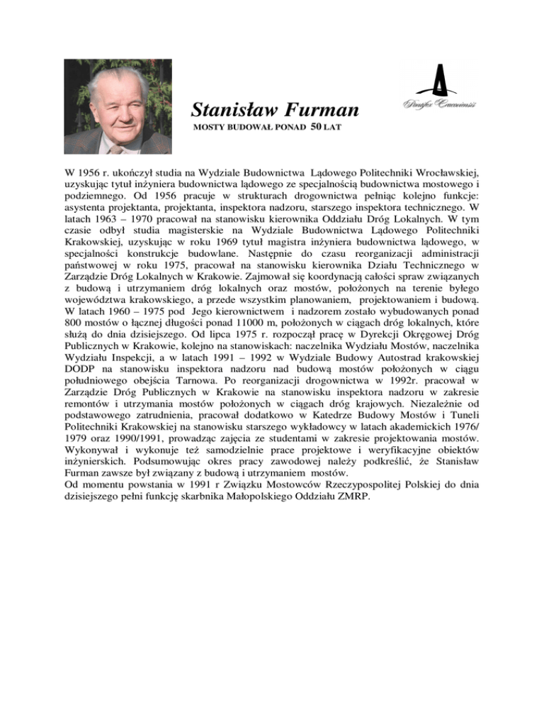 Stanisław Furman MOSTY BUDOWAŁ PONAD 50 LAT W 1956 r. ukończył studia na Wydziale Budownictwa Lądowego Politechniki Wrocławskiej, uzyskując tytuł inżyniera budownictwa lądowego ze specjalnością budownictwa mostowego i podziemnego. Od 1956 pracuje w strukturach drogownictwa pełniąc kolejno funkcje: asystenta projektanta, projektanta, inspektora nadzoru, starszego inspektora technicznego. W latach 1963 – 1970 pracował na stanowisku kierownika Oddziału Dróg Lokalnych. W tym czasie odbył studia magisterskie na Wydziale Budownictwa Lądowego Politechniki Krakowskiej, uzyskując w roku 1969 tytuł magistra inżyniera budownictwa lądowego, w specjalności konstrukcje budowlane. Następnie do czasu reorganizacji administracji państwowej w roku 1975, pracował na stanowisku kierownika Działu Technicznego w Zarządzie Dróg Lokalnych w Krakowie. Zajmował się koordynacją całości spraw związanych z budową i utrzymaniem dróg lokalnych oraz mostów, położonych na terenie byłego województwa krakowskiego, a przede wszystkim planowaniem, projektowaniem i budową. W latach 1960 – 1975 pod Jego kierownictwem i nadzorem zostało wybudowanych ponad 800 mostów o łącznej długości ponad 11000 m, położonych w ciągach dróg lokalnych, które służą do dnia dzisiejszego. Od lipca 1975 r. rozpoczął pracę w Dyrekcji Okręgowej Dróg Publicznych w Krakowie, kolejno na stanowiskach: naczelnika Wydziału Mostów, naczelnika Wydziału Inspekcji, a w latach 1991 – 1992 w Wydziale Budowy Autostrad krakowskiej DODP na stanowisku inspektora nadzoru nad budową mostów położonych w ciągu południowego obejścia Tarnowa. Po reorganizacji drogownictwa w 1992r. pracował w Zarządzie Dróg Publicznych w Krakowie na stanowisku inspektora nadzoru w zakresie remontów i utrzymania mostów położonych w ciągach dróg krajowych. Niezależnie od podstawowego zatrudnienia, pracował dodatkowo w Katedrze Budowy Mostów i Tuneli Politechniki Krakowskiej na stanowisku starszego wykładowcy w latach akademickich 1976/ 1979 oraz 1990/1991, prowadząc zajęcia ze studentami w zakresie projektowania mostów. Wykonywał i wykonuje też samodzielnie prace projektowe i weryfikacyjne obiektów inżynierskich. Podsumowując okres pracy zawodowej należy podkreślić, że Stanisław Furman zawsze był związany z budową i utrzymaniem mostów. Od momentu powstania w 1991 r Związku Mostowców Rzeczypospolitej Polskiej do dnia dzisiejszego pełni funkcję skarbnika Małopolskiego Oddziału ZMRP. Most przez rzeke Wisłę w Nowym Brzesku o długości 606,30 m.
