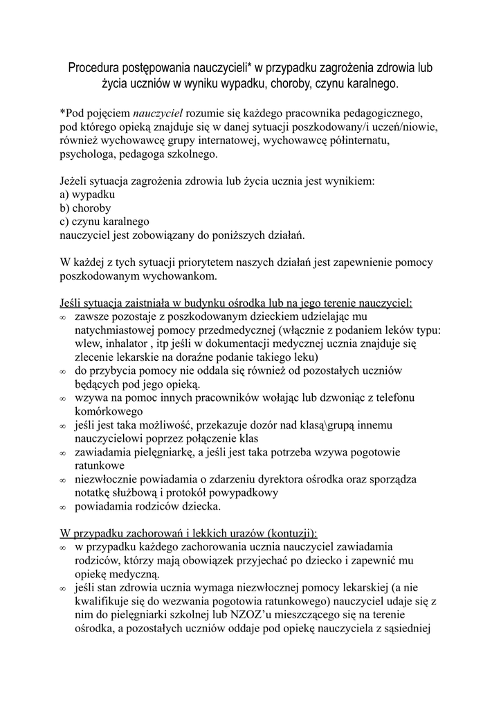 Procedura postępowania nauczycieli* w przypadku zagrożenia zdrowia lub życia uczniów w wyniku wypadku, choroby, czynu karalnego. *Pod pojęciem nauczyciel rozumie się każdego pracownika pedagogicznego, pod którego opieką znajduje się w danej sytuacji poszkodowany/i uczeń/niowie, również wychowawcę grupy internatowej, wychowawcę półinternatu, psychologa, pedagoga szkolnego. Jeżeli sytuacja zagrożenia zdrowia lub życia ucznia jest wynikiem: a) wypadku b) choroby c) czynu karalnego nauczyciel jest zobowiązany do poniższych działań. W każdej z tych sytuacji priorytetem naszych działań jest zapewnienie pomocy poszkodowanym wychowankom. Jeśli sytuacja zaistniała w budynku ośrodka lub na jego terenie nauczyciel: • zawsze pozostaje z poszkodowanym dzieckiem udzielając mu natychmiastowej pomocy przedmedycznej (włącznie z podaniem leków typu: wlew, inhalator , itp jeśli w dokumentacji medycznej ucznia znajduje się zlecenie lekarskie na doraźne podanie takiego leku) • do przybycia pomocy nie oddala się również od pozostałych uczniów będących pod jego opieką. • wzywa na pomoc innych pracowników wołając lub dzwoniąc z telefonu komórkowego • jeśli jest taka możliwość, przekazuje dozór nad klasą\grupą innemu nauczycielowi poprzez połączenie klas • zawiadamia pielęgniarkę, a jeśli jest taka potrzeba wzywa pogotowie ratunkowe • niezwłocznie powiadamia o zdarzeniu dyrektora ośrodka oraz sporządza notatkę służbową i protokół powypadkowy • powiadamia rodziców dziecka. W przypadku zachorowań i lekkich urazów (kontuzji): • w przypadku każdego zachorowania ucznia nauczyciel zawiadamia rodziców, którzy mają obowiązek przyjechać po dziecko i zapewnić mu opiekę medyczną. • jeśli stan zdrowia ucznia wymaga niezwłocznej pomocy lekarskiej (a nie kwalifikuje się do wezwania pogotowia ratunkowego) nauczyciel udaje się z nim do pielęgniarki szkolnej lub NZOZ’u mieszczącego się na terenie ośrodka, a pozostałych uczniów oddaje pod opiekę nauczyciela z sąsiedniej klasy. Dyrektor lub kierownik ds. opiekuńczo-wychowawczych ustala pod czyją opieką pozostaje klasa\grupa niedysponowanego ucznia. Jeśli sytuacja zaistniała na wycieczce (spacerze) nauczyciel: • zawsze pozostaje z poszkodowanym dzieckiem udzielając mu natychmiastowej pomocy przedmedycznej (włącznie z podaniem leków typu: wlew, inhalator, itp jeśli w dokumentacji medycznej ucznia znajduje się zlecenie lekarskie na doraźne podanie takiego leku) • wzywa pogotowie ratunkowe • jeśli na wycieczce jest poza nim inny nauczyciel, przekazuje mu opiekę nad klasą\grupą • podczas wycieczki z pomocą wychowawczą należy poprosić o pomoc świadka zdarzenia. W takim przypadku jednak nie wolno nam oddalić się od klasy\grupy • o zdarzeniu informuje dyrektora ośrodka oraz sporządza notatkę służbową i protokół powypadkowy • powiadamia rodziców dziecka. Jeśli przyczyną zdarzenia jest czyn karalny: obowiązują nas wszystkie powyższe procedury ratownicze w stosunku do ucznia, który odniósł obrażenia, bez względu na to czy jest to ofiara czy sprawca. Po zapewnieniu pomocy medycznej potrzebującym uczniom nauczyciel stosuje poniższe procedury: • powiadamia dyrektora ośrodka • izoluje sprawcę od ofiary zdarzenia • udziela ofierze wsparcia psychicznego • ustala okoliczności czynu i typuje ewentualnych świadków • nie podejmuje żadnych mediacji czy prób załagodzenia konfliktu • przekazuje sprawcę dyrektorowi lub pedagogowi pod opiekę • jeśli sprawca nie jest uczniem naszej placówki, nauczyciel nie usiłuje zatrzymać go siłą, zawiadamia Policję • zawiadamia rodziców sprawcy i ofiary • zawiadamia Policję, jeśli sprawa jest poważna (rozbój, uszkodzenie ciała) • zabezpiecza ewentualne dowody przestępstwa i przekazuje je Policji • sporządza notatkę służbową i protokół powypadkowy.