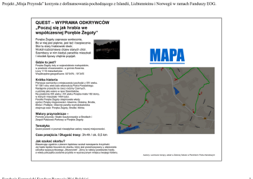 Projekt „Misja Przyroda” korzysta z dofinansowania pochodzącego z Islandii, Lichtensteinu i Norwegii w ramach Funduszy EOG. QUEST – WYPRAWA ODKRYWCÓW „Poczuj się jak hrabia we współczesnej Porębie Żegoty” Poręba Żegoty zaprasza serdecznie, Bo w niej jest pięknie, jest też i bezpiecznie. Stoi tu stary hrabiowski dwór, Wokół rozbrzmiewa drzew starych chór. Szembecy w nim kiedyś paradnie mieszkali I miodek lipowy chętnie popijali. Gdzie to jest? MAPA Poręba Żegoty leży w województwie małopolskim, w powiecie chrzanowskim, w gminie Alwernia. Liczy 1115 mieszkańców. Współrzędne geograficzne: 50°04ʹN ; 19°34ʹE Krótka historia Pierwsza wzmianka o miejscowości pochodzi z XIV wieku. W 1581 roku wieś była własnością Piotra Porębskiego. Następnie przeszła na rzecz rodziny Czernych, a później jako wiano w ręce Szembeków. Na przełomie XIX wieku i XX wieku Poręba miała 182 domy, w których mieszkało 1454 ludzi. Parafia Poręba Żegoty obejmowała wtedy oprócz Poręby miejscowości: Alwernia, Okleśna, Brodła, Mirów i Podłęże. Obecnie parafia rzymskokatolicka obejmuje wsie: Poręba Żegoty, Brodła i Mirów. Walory przyrodnicze – Pomniki przyrody: Skałki Gaudynowskie w Brodłach i Zespół Pałacowo-Parkowy w Porębie Żegoty. Tematyka Quest pozwoli ci poznać niewątpliwe walory naszej miejscowości. Czas przejścia / Długość trasy: 3h-4h / ok. 8,5 km Jak szukać skarbu? Maszerując zgodnie z planem będziesz szukał rozwiązania krzyżówki. Jej hasło będzie kluczem do skarbu, który jest przechowywany u właściciela ośrodka wypoczynkowego „Skowronek”. Jemu to należy powiedzieć hasło, a wtedy pieczątka zostanie przybita w wyznaczonym miejscu twojego folderu. Autorzy: uczniowie biorący udział w Zielonej Szkole w Pienińskim Parku Narodowym Projekt „Misja Przyroda” korzysta z dofinansowania pochodzącego z Islandii, Lichtensteinu i Norwegii w ramach Funduszy EOG. Plan trasy 1.Przystanek autobusowy „Brodła Działki 2.Skałki Gaudynowskie (potrzebujesz do krzyżówki) Skałki Gaudynowskie to wysokie góry! Weź ze sobą kilof, dwumetrowe sznury. Skałki zwiedzić musicie - tam się zachwycicie. W źródełku woda czysta krąży sobie w kółko, Uważaj na skały, nie uderz się w czółko! 3.Dwór i park Szembeków (potrzebujesz do krzyżówki) Poręba nasza – piękna to wieś, Miód bardzo słodki możesz tu jeść. Szembecy dwór tutaj mieli, Skarbów porębskich ze sobą nie wzięli. 4.Kościół i plebania (potrzebujesz do krzyżówki) Siostry zakonne zaproszą Cię na herbatkę, Abyś mógł do końca rozwiązać zagadkę. Pani Marysia w kuchni gotuje I rogale patrona Wam tu zaserwuje. 5.Pracownia rzeźby ręcznej (potrzebujesz do krzyżówki) W Porębie rzeźby też się robi, Artysta ładnie je tutaj zdobi. Z łuku postrzelać tutaj też można, Taka ta nasza wieś jest zamożna. 6.Ośrodek wypoczynkowy i staw (potrzebujesz do krzyżówki) Piasek, drzewa, wody szum, A na plaży ludzi tłum, Obok lody dla ochłody, A na kortach są zawody. Można się opalać, wykąpać w akwenie. Udać Ci się może karasia złowienie. 1.Tak jak ptak co pięknie śpiewa kąpielisko się nazywa. 2.Do Galerii … zapraszamy! Razem coś z drewna wystrugamy. 3.Dwór hrabiowie tutaj mieli więc po śmierci tu spoczęli. 4.Święty … z kościoła czuwa nad wiernymi dookoła. 5.Słynne drzewa z Poręby to 600-letnie … 6.O tym świętym Janie czytaj na tablicy, której św. Florian szczerze jak źrenicy. 7.Weź ze sobą szklankę, gdy idziesz do źródełka nad rzekę … Miejsce na skarb Pieczęć Szembeków dzisiaj dostaniesz jeśli zrobiłeś swoje zadanie.