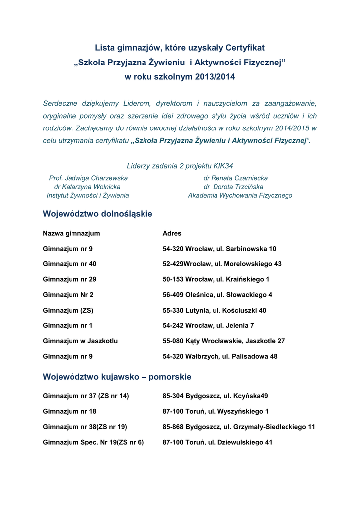 Lista gimnazjów, które uzyskały Certyfikat „Szkoła Przyjazna Żywieniu i Aktywności Fizycznej” w roku szkolnym 2013/2014 Serdeczne dziękujemy Liderom, dyrektorom i nauczycielom za zaangażowanie, oryginalne pomysły oraz szerzenie idei zdrowego stylu życia wśród uczniów i ich rodziców. Zachęcamy do równie owocnej działalności w roku szkolnym 2014/2015 w celu utrzymania certyfikatu „Szkoła Przyjazna Żywieniu i Aktywności Fizycznej”. Liderzy zadania 2 projektu KIK34 Prof. Jadwiga Charzewska dr Katarzyna Wolnicka Instytut Żywności i Żywienia dr Renata Czarniecka dr Dorota Trzcińska Akademia Wychowania Fizycznego Województwo dolnośląskie Nazwa gimnazjum Adres Gimnazjum nr 9 54-320 Wrocław, ul. Sarbinowska 10 Gimnazjum nr 40 52-429Wrocław, ul. Morelowskiego 43 Gimnazjum nr 29 50-153 Wrocław, ul. Kraińskiego 1 Gimnazjum Nr 2 56-409 Oleśnica, ul. Słowackiego 4 Gimnazjum (ZS) 55-330 Lutynia, ul. Kościuszki 40 Gimnazjum nr 1 54-242 Wrocław, ul. Jelenia 7 Gimnazjum w Jaszkotlu 55-080 Kąty Wrocławskie, Jaszkotle 27 Gimnazjum nr 9 54-320 Wałbrzych, ul. Palisadowa 48 Województwo kujawsko – pomorskie Gimnazjum nr 37 (ZS nr 14) 85-304 Bydgoszcz, ul. Kcyńska49 Gimnazjum nr 18 87-100 Toruń, ul. Wyszyńskiego 1 Gimnazjum nr 38(ZS nr 19) 85-868 Bydgoszcz, ul. Grzymały-Siedleckiego 11 Gimnazjum Spec. Nr 19(ZS nr 6) 87-100 Toruń, ul. Dziewulskiego 41 Gimnazjum nr 28(ZS nr 28) 87-100 Toruń, ul. Przy Skarpie 13 Gimnazjum(ZS) 87-220 Radzyń Chełmiński, ul. Sady 14 Gimnazjum nr 31(ZS nr 31) 87-100 Toruń, ul.Diewulskiego 41b Gimnazjum nr 1 (ZS nr 1) 87-148 Łysomice, ul. Warszawska 1 Gimnazjum nr 2 (ZS nr 3) 87-700 Aleksandrów Kujawski, ul. Strażacka 22 Gimnazjum w Myśliwcu 87-200 Wąbrzeźno, Myśliwiec 3 Gimnazjum nr 3 87-100 Toruń, ul. Żwirki i Wigury 49 Gimnazjum nr 10 (ZS nr 7) 87-100 Toruń, ul. Bażyńskich 30/36 Województwo lubelskie Gimnazjum nr 10 20-604 Lublin, ul. Wajdeloty 10 Gimnazjum nr 15 20-349 Lublin, ul. Elektryczna 51 Zespół Szkół, Gimnazjum Publiczne 23-145 Wysokie, ul. Szkolna 9 Zespół Szkół, Gimnazjum w Mętowie, 20-388 Lublin, Mętów 124 Gimnazjum Publiczne w Jabłonnie 23-114 Jabłonna Gimnazjum nr 2 21-100 Lubartów, ul. Lubelska 68 Zespól Szkół wNiemcach, Gimnazjum 21-025 Niemce, ul. Szkolna 23 Gimnazjum Nr 1 w Bełżycach 24-200 Bełżyce, ul. Ks. Bp T. Wilczyńskiego 62 Gimnazjum Nr w Bełżycach 24- 200 Bełżyce, ul. T. Kościuszki 148 Gimnazjum nr 19 20-124 Lublin, ul. Szkolna 6 Gimnazjum nr 8 20-543 Lublin, ul. Biedronki 13 Gimnazjum w Nałęczowie, 24-150 Nałęczów, ul. Spółdzielca 17, Gimnazjum w Łucce 21-100 Lubartów, Łucka 125 Województwo lubuskie Publiczne Gimnazjum 69-110 Rzepin, ul. Wojska Polskiego 30 Gimnazjum Publiczne w Dąbiu 66-600 Krosno Odrzańskie, ul. Strażacka 4 Gimnazjum w Dobiegniewie 66-520 Dobiegniew, ul. Poznańska 5 Gimnazjum w Łęknicy 68-208 Łęknica, ul. Wojska Polskiego 19 Gimnazjum w Górkach Noteckich 66-542 Zwierzyn, ul. Cmentarna 5 Gimnazjum nr 13 66-400 Gorzów Wielkopolski, ul. Szwoleżerów 2 Gimnazjum nr 2 66-470 Kostrzyn n/O, ul. M. Reja 32A Województwo łódzkie Gimnazjum Publiczne w Zadzimiu 99-232 Zadzim, Kazimierzew 38 Gimnazjum nr 2w Działoszynie 98-355 Działoszyn, ul. Grota Roweckiego 2 Gimnazjum nr 1 97-300 Piotrków Trybunalski, ul. Żwirki 7 Publiczne Gimnazjum w Inowłodzu 97-215 Inowłódz, ul.Spalska 5 Gimnazjum nr 3 97-200 Tomaszów Mazowiecki, Al. Piłsudskiego 42/46 Gimnazjum nr 2 90-262 Łódź, Jaracza 26 Społeczne Gimnazjum Towarzystwa Oświatowego „Edukacja” 93-569 Łódź, Inżynierska 2/4 Gimnazjum 26-340 Drzewica, ul. Szkolna 18 Publiczne Gimnazjum nr 22 84-054 Łódź, Kusocińskiego 100 Publiczne Gimnazjum w Szadkowicach Gimnazjum przy Zespole Szkół w Osiedlu Niewiadów 26-332 Sławno, Szadkowice Gimnazjum w Popielawach 97-225 Ujazd, Popielawy Gimnazjum nr 41 93-552 Łódź, ul. Bohdanowicza 11 97-225 Ujazd, Os. Niewiadów 27 Województwo małopolskie Publiczne Gimnazjum 32-090 Słomniki, Niedźwiedź Gimnazjum 32-420 Gdów 1206 Gimnazjum 32-310 Klucz, ul. Zawierciańska 30 ZSO Gimnazjum nr 32 30-809 Kraków, ul. Żabia 20 Gimnazjum 32-005 Niepołomice, ul. Szkolna 3 Gimnazjum 32-010 Luborzyca, Wysiołek Luborzycki 160 Gimnazjum przy ZSO Mistrzostwa Sportowego 31-521 Kraków, ul. Grochowska 20 Gimnazjum 32-410 Dobczyce, ul. Szkolna 43 Województwo mazowieckie Gimnazjum nr 1 05-420 Józefów, ul. Leśna 39 Gimnazjum nr 10 02-943 Warszawa, ul. Limanowskiego 9 Niepubliczne Gimnazjum nr 9 02-793 Warszawa, ul. ZoltanaBalo 1 Gimnazjum w Łazach 05-552 Wólka Kosowska, ul. ks. H. Słojewskiego1 Gimnazjum nr 86 01-491 Warszawa, ul. Thommego 1 Gimnazjum nr 5 05-120 Legionowo, ul Jagiellońska 67 Województwo opolskie Publiczne Gimnazjum, Zespół Szkolno – Przedszkolny nr 3 46-053 Dębska Kuźnia, ul. Wiejska 53 Publiczne Gimnazjum Nr 4 45-267 Opole, ul. 1 Maja 145 Publiczne Gimnazjum nr 3 46-203 Kluczbork, ul. Wolności 18 Gimnazjum nr 1 48-300 Nysa, ul. Chodowieckiego 7 Gimnazjum w Zespole Szkół 49-100 Niemodlin, ul. Opolska 34 Publiczne Gimnazjum nr 8 45-856 Opole, ul. Lelewela 9 Publiczne Gimnazjum nr 5 46–203 Kluczbork, ul. M. Konopnickiej 17a Gimnazjalno-Licealny Zespół Szkół (Publiczne Gimnazjum) 46-250 Wołczyn, ul. Rzeczna 6 Gimnazjum przy ZSO 48-388 Kamiennik, ul. 1 Maja 28 Zespół Szkół nr 1 z Oddziałami Sportowymi Publiczne Gimnazjum przy Zespole Szkół Gimnazjum przy SOS-wZespole Szkolno-Przedszkolnym nr 3 49-300 Brzeg, ul. Poprzeczna 16 47-320 Gogolin, ul. Szkolna 27 48-200 Prudnik, ul. Młyńska 1 Województwo podkarpackie Gimnazjum 37-530 Sieniowa, ul. Rynek 4 Zespół Szkół nr 5,Gimnazjum nr 13 35-083 Rzeszów, ul. Beskidzka 6 Gimnazjum nr 4 38-200 Jasło, ul. Skargi 10 Zespół Szkół nr 6, Gimnazjum nr 5 35-118 Rzeszów, ul. Solarza12 Zespół Szkół nr 4, Gimnazjum nr 14 35-213 Rzeszów, ul. Dębicka 288 Zespół Szkół, Gimnazjum 37-203 Gniewczyna Łańcucka Gimnazjum 37-200 Przeworsk, Studzian 33