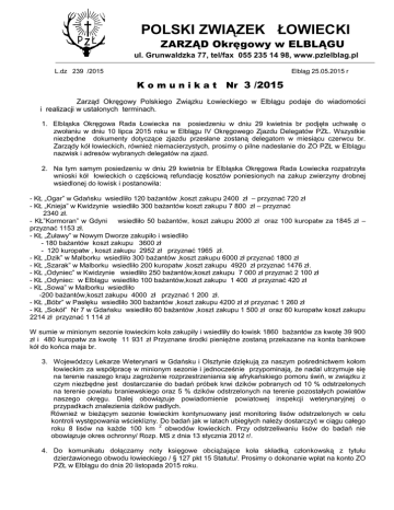 POLSKI ZWIĄZEK ŁOWIECKI ZARZĄD Okręgowy w ELBLĄGU ul. Grunwaldzka 77, tel/fax 055 235 14 98, www.pzlelblag.pl Elbląg 25.05.2015 r L.dz 239 /2015 K o m u n i k a t Nr 3 /2015 Zarząd Okręgowy Polskiego Związku Łowieckiego w Elblągu podaje do wiadomości i realizacji w ustalonych terminach. 1. Elbląska Okręgowa Rada Łowiecka na posiedzeniu w dniu 29 kwietnia br podjęła uchwałę o zwołaniu w dniu 10 lipca 2015 roku w Elblągu IV Okręgowego Zjazdu Delegatów PZŁ. Wszystkie niezbędne dokumenty dotyczące zjazdu przesłane zostaną delegatom w miesiącu czerwcu br. Zarządy kół łowieckich, również niemacierzystych, prosimy o pilne nadesłanie do ZO PZŁ w Elblągu nazwisk i adresów wybranych delegatów na zjazd. 2. Na tym samym posiedzeniu w dniu 29 kwietnia br Elbląska Okręgowa Rada Łowiecka rozpatrzyła wnioski kół łowieckich o częściową refundację kosztów poniesionych na zakup zwierzyny drobnej wsiedlonej do łowisk i postanowiła: - KŁ „Ogar” w Gdańsku wsiedliło 120 bażantów ,koszt zakupu 2400 zł – przyznać 720 zł - KŁ „Knieja” w Kwidzynie wsiedliło 300 bażantów koszt zakupu 7 800 zł – przyznać 2340 zł. - KŁ”Kormoran” w Gdyni wsiedliło 50 bażantów, koszt zakupu 2000 zł oraz 100 kuropatw za 1845 zł – przyznać 1153 zł. - KŁ „Żuławy” w Nowym Dworze zakupiło i wsiedliło - 180 bażantów koszt zakupu 3600 zł - 120 kuropatw , koszt zakupu 2952 zł przyznać 1965 zł. - KŁ „Dzik” w Malborku wsiedliło 300 bażantów ,koszt zakupu 6000 zł przyznać 1800 zł - KŁ „Szarak” w Malborku wsiedliło 200 kuropatw ,koszt zakupu 4920 zł przyznać 1476 zł. - KŁ „Odyniec” w Kwidzynie wsiedliło 250 bażantów,koszt zakupu 7 000 zł przyznać 2 100 zł - KŁ „Odyniec: w Elblągu wsiedliło 100 bażantów,koszt zakupu 1 400 zł przyznać 420 zł - KŁ „Sowa” w Malborku wsiedliło -200 bażantów,koszt zakupu 4000 zł przyznać 1 200 zł. - KŁ „Bóbr” w Pasłęku wsiedliło 300 bażantów ,koszt zakupu 4200 zł zł przyznać 1 260 zł - KŁ „Sokół” Nr 7 w Gdańsku wsiedliło 60 bażantów ,koszt zakupu 1 500 zł oraz 60 kuropatw koszt zakupu 2214 zł przyznać 1 114 zł W sumie w minionym sezonie łowieckim koła zakupiły i wsiedliły do łowisk 1860 bażantów za kwotę 39 900 zł i 480 kuropatw za kwotę 11 931 zł Przyznane środki pieniężne zostaną przekazane na konta bankowe kół do końca maja br. 3. Wojewódzcy Lekarze Weterynarii w Gdańsku i Olsztynie dziękują za naszym pośrednictwem kołom łowieckim za współpracę w minionym sezonie i jednocześnie przypominają, że nadal utrzymuje się na terenie naszego kraju zagrożenie rozprzestrzeniania się afrykańskiego pomoru świń, w związku z czym niezbędne jest dostarczanie do badań próbek krwi dzików pobranych od 10 % odstrzelonych na terenie powiatu braniewskiego oraz 5 % dzików odstrzelonych na terenie pozostałych powiatów naszego okręgu. Dalej obowiązuje powiadomienie powiatowej inspekcji weterynaryjnej o przypadkach znalezienia dzików padłych. Również w bieżącym sezonie łowieckim kontynuowany jest monitoring lisów odstrzelonych w celu kontroli występowania wścieklizny. Do badań jak w latach ubiegłych należy dostarczyć w ciągu całego roku 8 lisów na każde 100 km 2 obwodów łowieckich. Przy odstrzeliwaniu lisów do badań nie obowiązuje okres ochronny/ Rozp. MS z dnia 13 stycznia 2012 r/. 4. Do komunikatu dołączamy noty księgowe obciążające koła składką członkowską z tytułu dzierżawionego obwodu łowieckiego / § 127 pkt 15 Statutu/. Prosimy o dokonanie wpłat na konto ZO PZŁ w Elblągu do dnia 20 listopada 2015 roku. 5. Komendant Placówki Straży Granicznej w Braniewie przypomina za naszym pośrednictwem myśliwym polującym w strefie nadgranicznej o obowiązku zgłoszenia zamiaru wykonywania polowania nie później niż na 2 godziny przed rozpoczęciem polowania, właściwemu komendantowi placówki Straży Granicznej. Kolegów łowczych kół, których to dotyczy prosimy o przypomnienie myśliwym o tym obowiązku przy wydawaniu zezwoleń na indywidualny odstrzał zwierzyny. 6. Departament Środowiska i Rolnictwa Urzędu Marszałkowskiego Województwa Pomorskiego informuje, że w dniu 30 marca 2015 roku Sejmik Województwa Pomorskiego podjął uchwałę Nr 87/VII/15 o zmianie uchwały w sprawie podziału województwa pomorskiego na obwody łowieckie. Powyższa uchwała dostępna jest w Biuletynie Informacji Publicznej pod adresem internetowym http://bip.pomorskie.eu/Article/get/id.15050.html. 7. Niezależnie od pilnego przesłania nazwisk i adresów delegatów na zjazd okręgowy, kolegów sekretarzy zarządów kół macierzystych prosimy o nadsyłanie kserokopii dokumentów z odbytych walnych zgromadzeń. Dodatkowo prosimy o przysłanie aktualnych danych: członków zarządów kół, przewodniczącego komisji rewizyjnej i adresu korespondencyjnego koła oraz nr konta bankowego – wg wzoru podanego w załączniku do komunikatu. 8. Do komunikatu dołączamy informację o skreśleniu z listy okręgowego rejestru kandydatów do PZŁ osób, którym upłynął 2 letni okres stażu, bez informacji o jego zaliczeniu. 9. W dniach 13 i 14 czerwca br Zarządowi Okręgowemu PZŁ w Elblągu powierzona została organizacja XV MISTRZOSTW PZŁ W STRZELANIACH MYŚLIWSKICH W KLASIE MISTRZOWSKIEJ. Na strzelnicy w Gołąbkach k/Pasłęka gościć będziemy ok. 170 najlepszych strzelców z całego kraju. Funkcje sędziów głównego i kierowników osi powołała Komisja Strzelecka NRŁ. Zarząd Okręgowy powołał sędziów pomocniczych i osoby funkcyjne zawodów: Sędzia główny – WOJCIECH KRAIŃSKI zastępca sędziego głównego – Stanisław Gąsienica Sędziowie prowadzący osie: OŚ MYŚLIWSKA : Piotr Pełczyński, Grzegorz Orłowski, Zygmunt Klepando, Marian Piecek KRĄG MYŚLIWSKI: Jacek Plenkiewicz, Stanisław Stopczyński,Maciej Kiedrowski, Andrzej Rynkowski PRZEBIEG DZIKA: Jerzy Ad